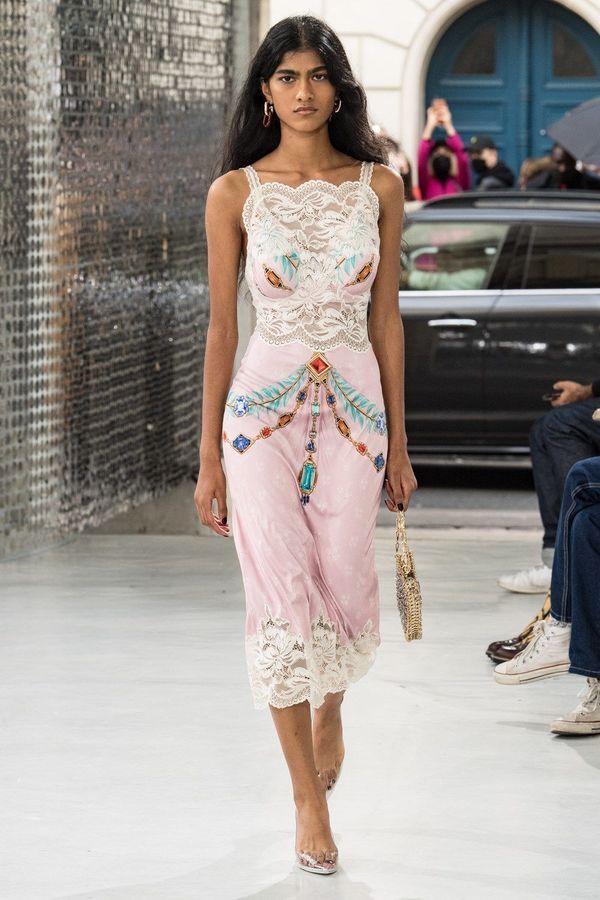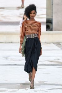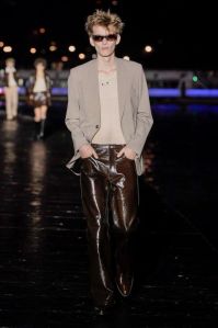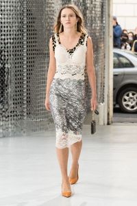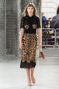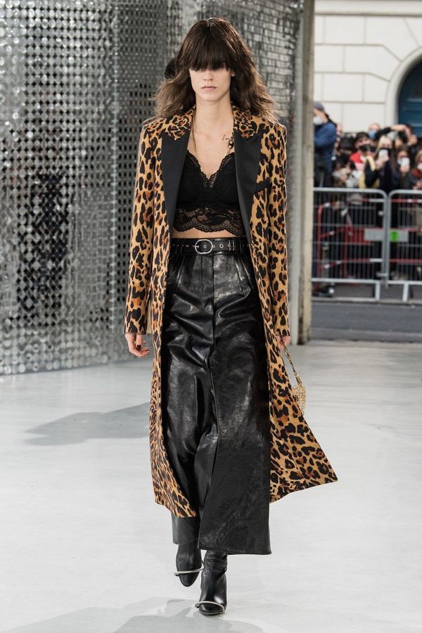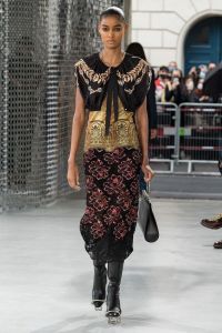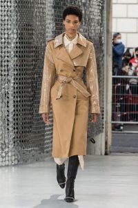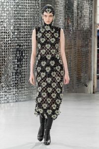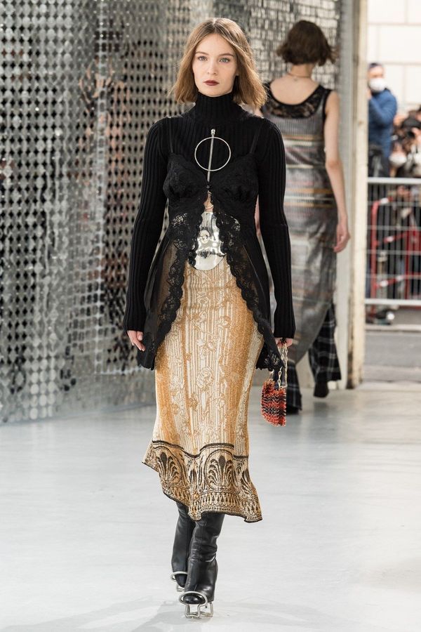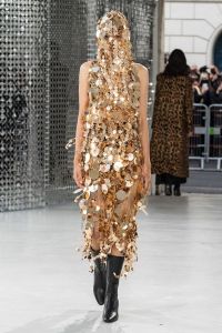 DEFILE PACO RABANNE A L’ESPACE COMMINES: Le directeur artistique Julien Dossena a présenté une collection hybride qui décline des éléments stylistiques provenant de l’ADN de la maison dans des tenues du quotidien. Ainsi la lingerie vaporeuse, les robes baby doll incrustées de dentelle et les motifs léopard rencontrent des assemblages géométriques métalliques. Les bustiers et le denim délavé s’associent à de longues vestes ajustées ou à des robes en mesh métal or et argent. Des imprimés joaillerie à effet trompe-l’oeil drapent les contours du corps. Un trench classique s’enveloppe de plastique transparent. Des bottes calées sur des tubes de fer ont été rééditées à partir des archives de la maison. Les dernières silhouettes entièrement métalliques sont un clin d’oeil tout à la fois aux collections radicales des débuts de Paco Rabanne et aux besoins de protection du monde actuel.