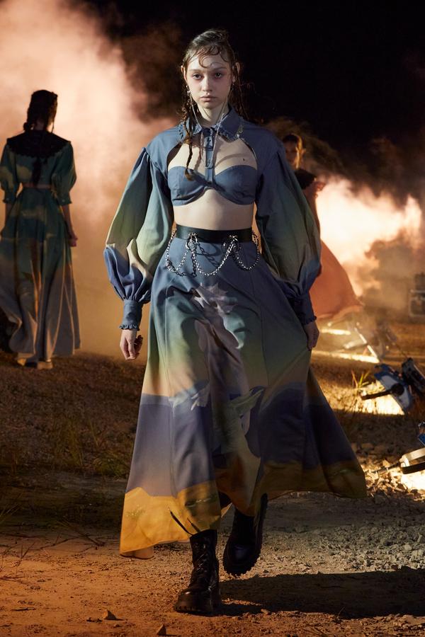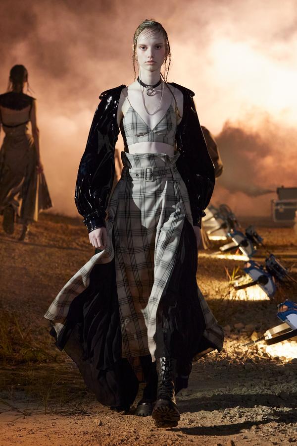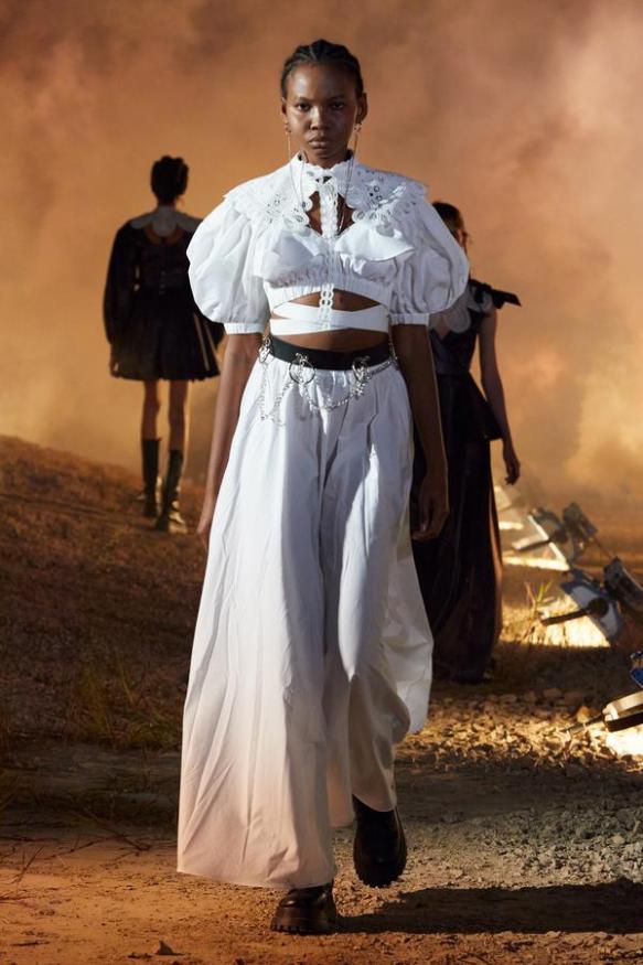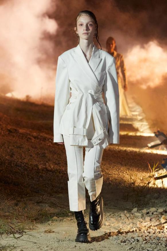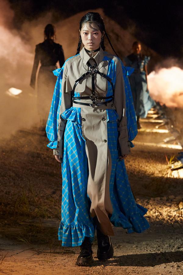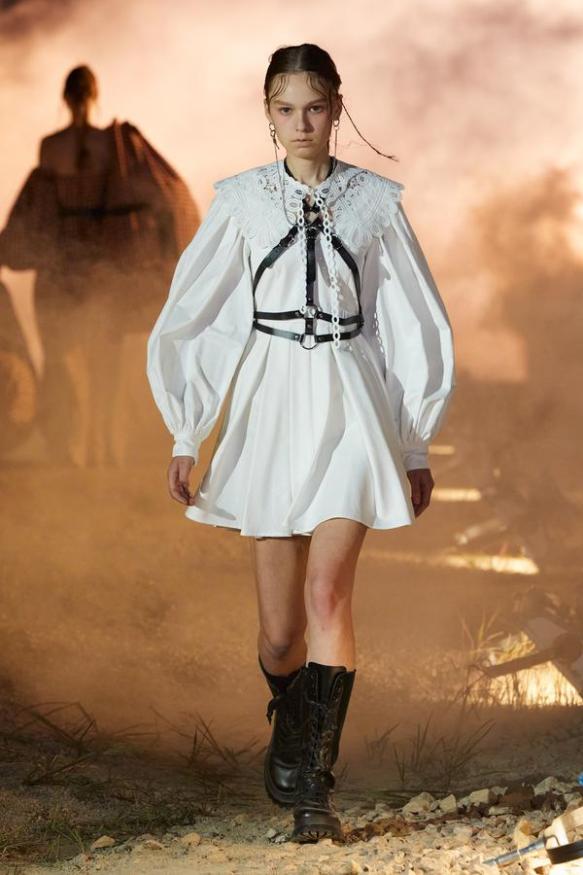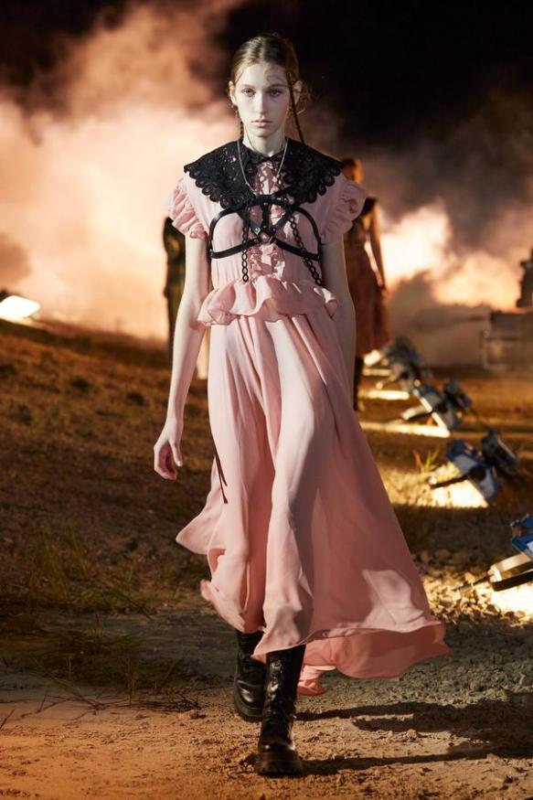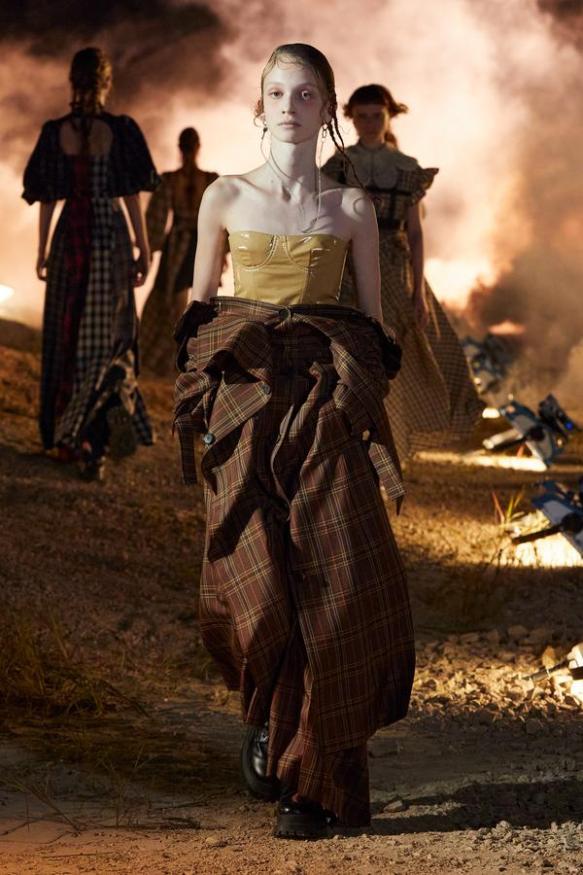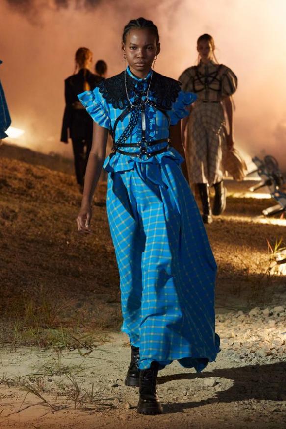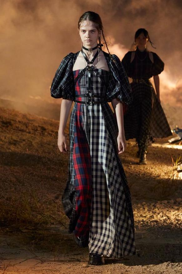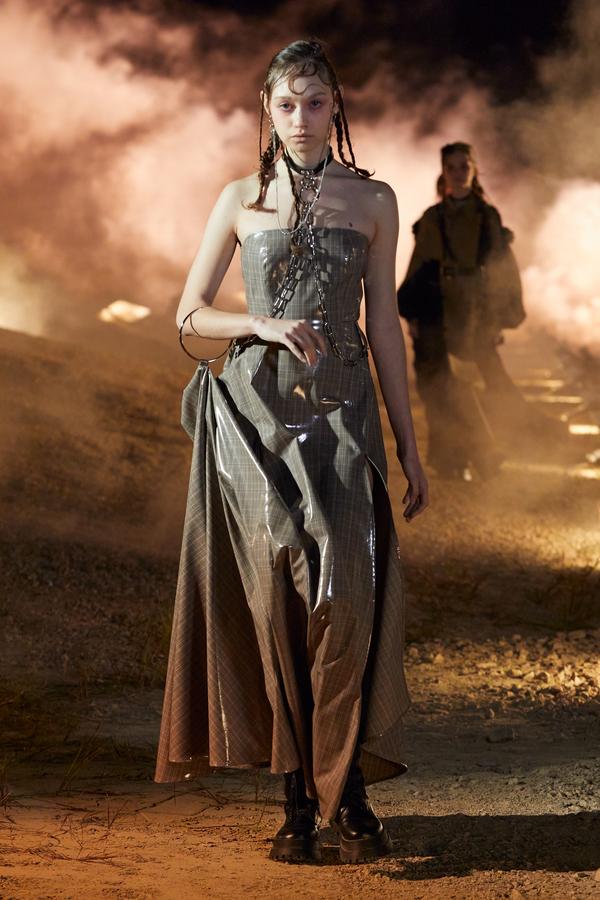 DEFILE ROKH EN DIGITAL: Le créateur sud-coréen Rok Hwang, qui est basé à Londres et a remporté le prix spécial du jury LVMH en 2018, a filmé un défilé sans public, de nuit, dans un décor désertique post-apocalyptique qui résonne avec l’époque actuelle. Il y dévoile un romantisme sombre à base d’oppositions où des références victoriennes composent avec des inspirations guerrières, des éléments fluides s’associent à des détails gothiques. Les patchworks de tartan se muent en armures épaulées portées avec des rangers. Des robes à manches ballons sont coupées dans du vinyle. Une robe de guerrière en cuir est garnie d’un col en dentelle blanche. Une jupe plissée rose est assortie de chaînes et d’un harnais. Quelle époque!