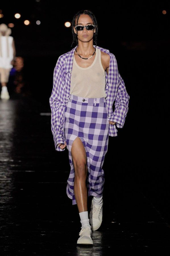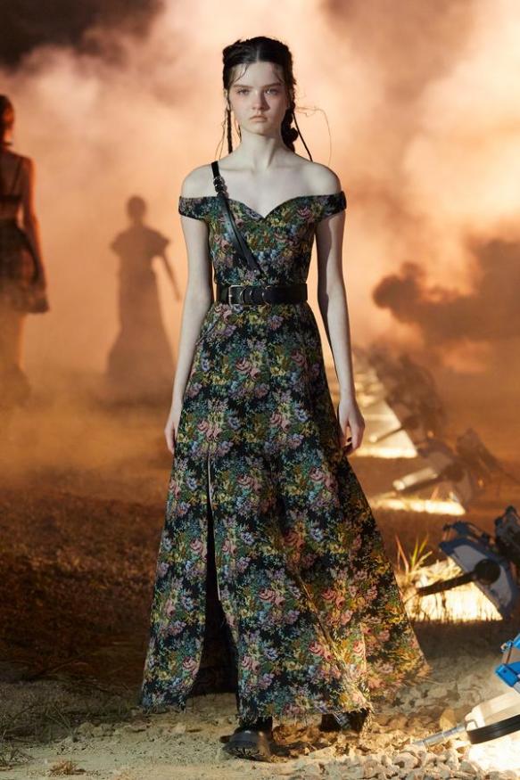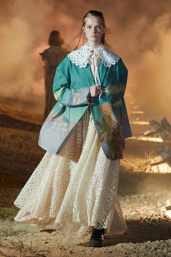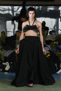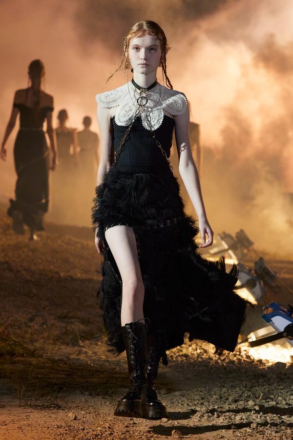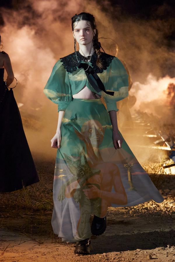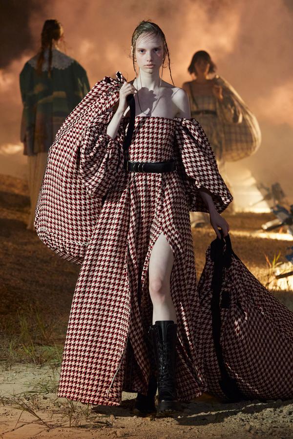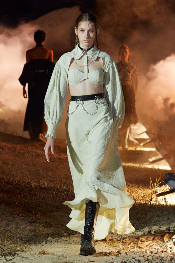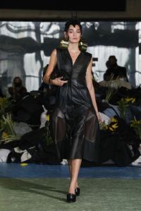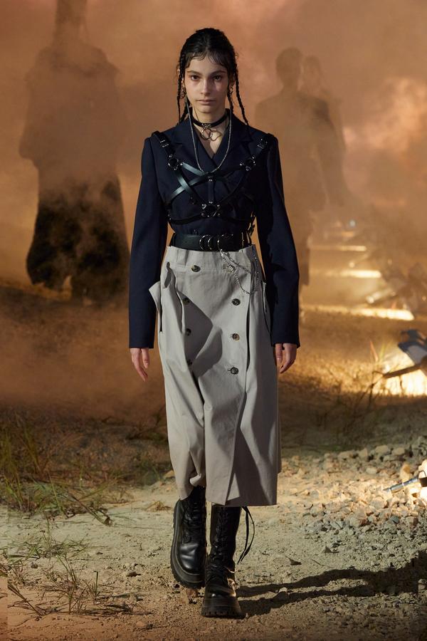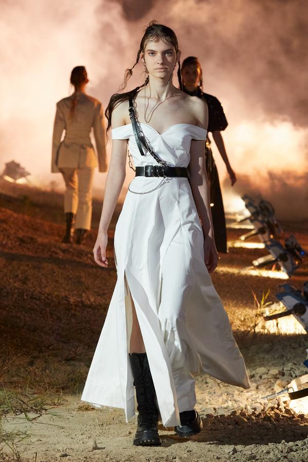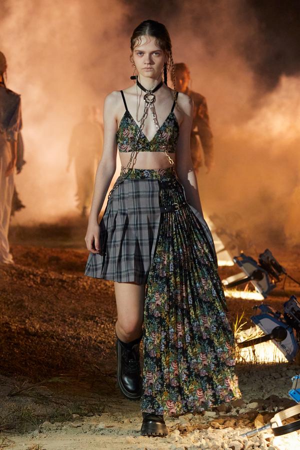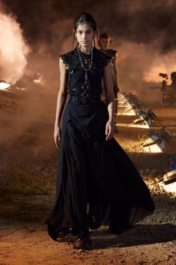 DEFILE ROKH EN DIGITAL: Le créateur sud-coréen Rok Hwang, qui est basé à Londres et a remporté le prix spécial du jury LVMH en 2018, a filmé un défilé sans public, de nuit, dans un décor désertique post-apocalyptique qui résonne avec l’époque actuelle. Il y dévoile un romantisme sombre à base d’oppositions où des références victoriennes composent avec des inspirations guerrières, des éléments fluides s’associent à des détails gothiques. Les patchworks de tartan se muent en armures épaulées portées avec des rangers. Des robes à manches ballons sont coupées dans du vinyle. Une robe de guerrière en cuir est garnie d’un col en dentelle blanche. Une jupe plissée rose est assortie de chaînes et d’un harnais. Quelle époque!