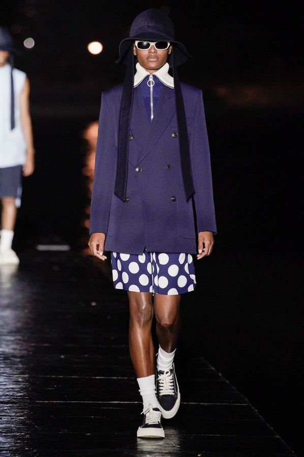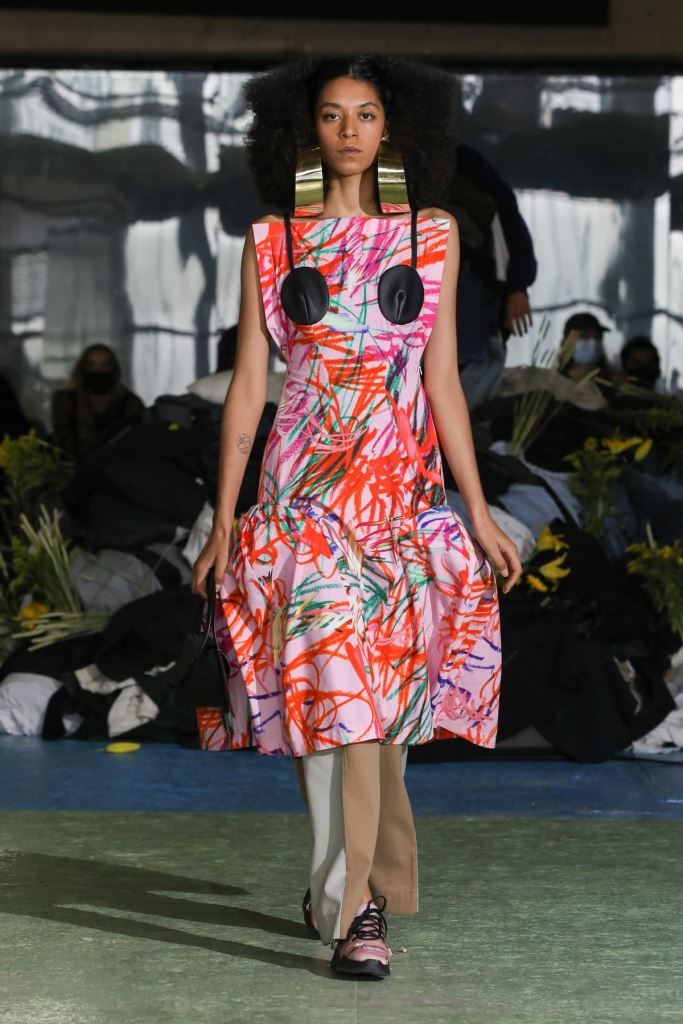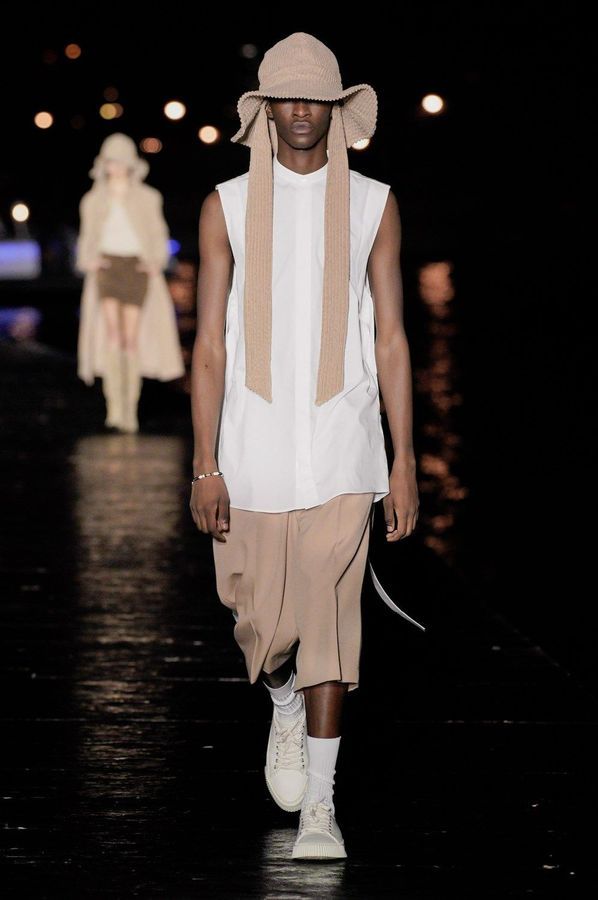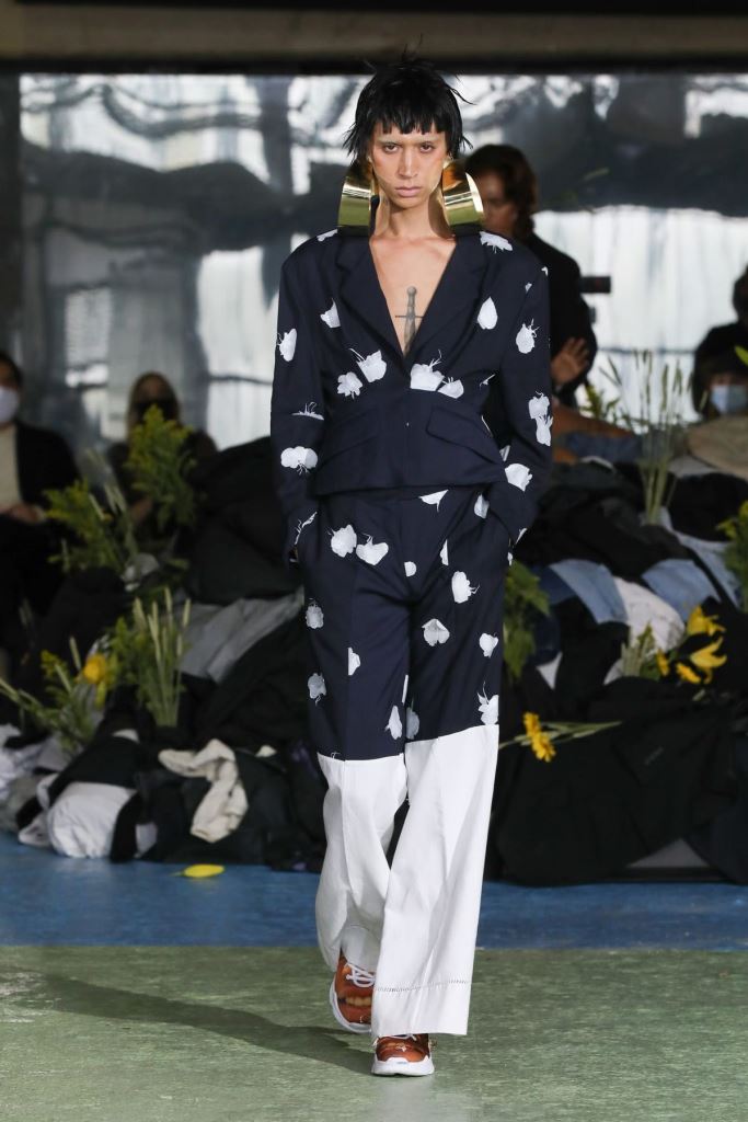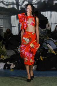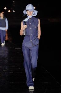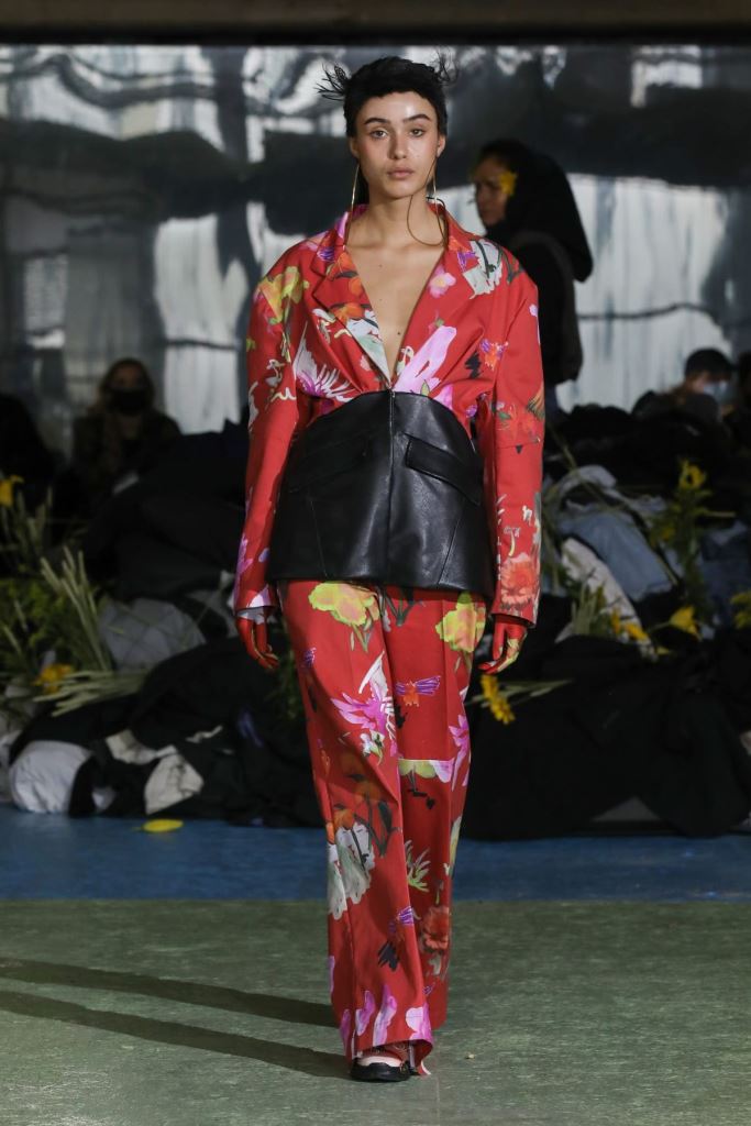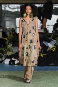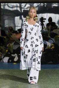 DEFILE KENZO A L’INSTITUT NATIONAL DE JEUNES SOURDS (INJS): Pour sa seconde collection pour Kenzo, qu’il a voulue ancrée dans l’époque, le créateur portugais Felipe Oliveira Baptista a trouvé son inspiration dans les abeilles, protectrices et rassurantes, et les vêtements amples des apiculteurs. Ce défilé très poétique qui était une véritable ode aux abeilles, dans laquelle l’imaginaire de l’apiculture était raconté avec un certain humour et beaucoup d’énergie, a ainsi révélé une collection mixte inventive, colorée, fleurie et utilitaire. Les vêtements tantôt couvrent totalement, comme ces tenues d’apiculteur avec chapeau et voile, tantôt mettent à nu comme ce look moulant avec un body couleur chair. Au sein d’une palette de couleurs riche et festive les imprimés abstraits rouge et vert sur du blanc apparaissent comme délavés, de même que les coquelicots et les hortensias sur les tenues, illustrant la fragilité du monde, mais diffusant également une bonne dose d’optimisme.