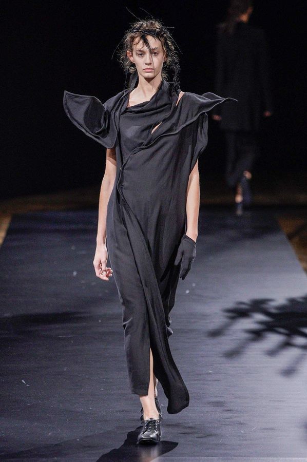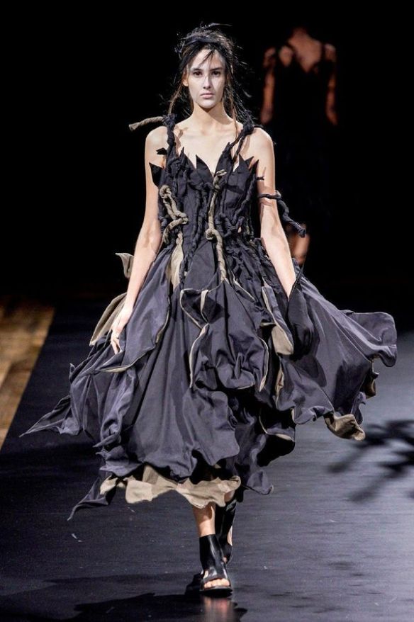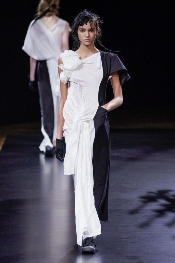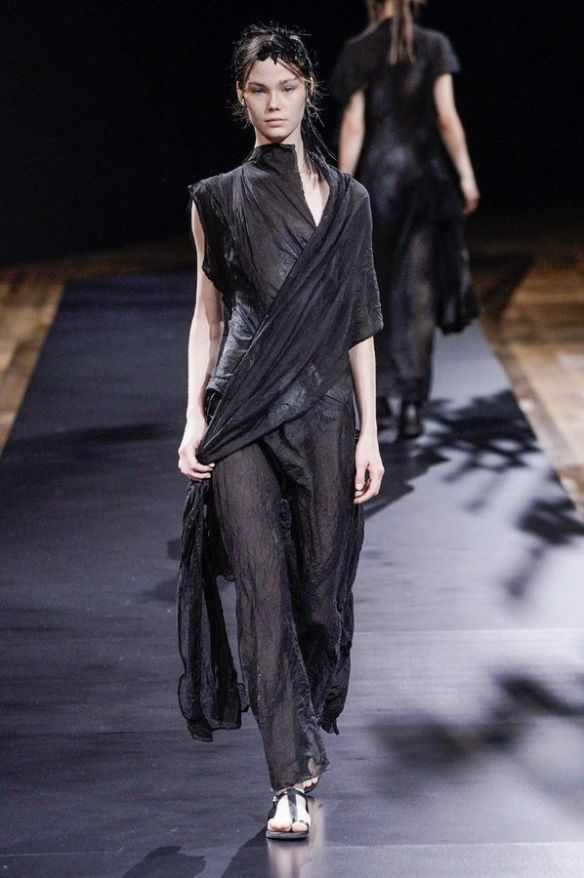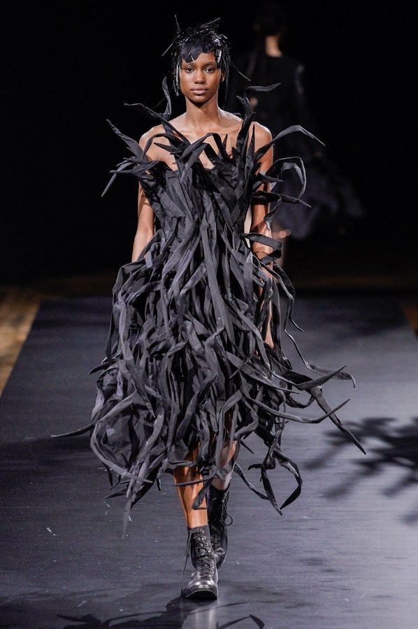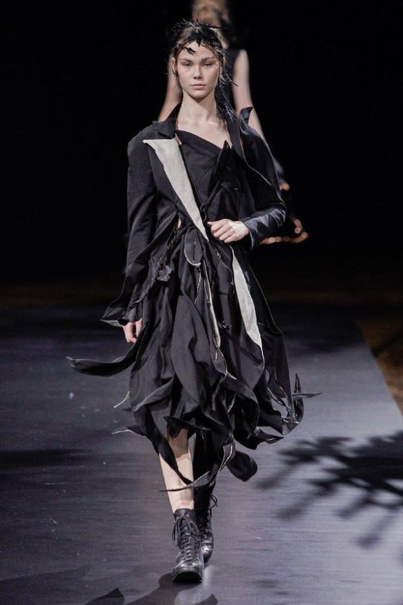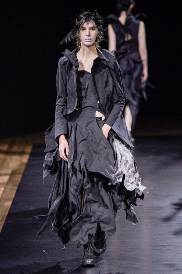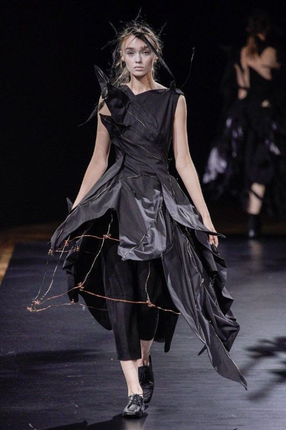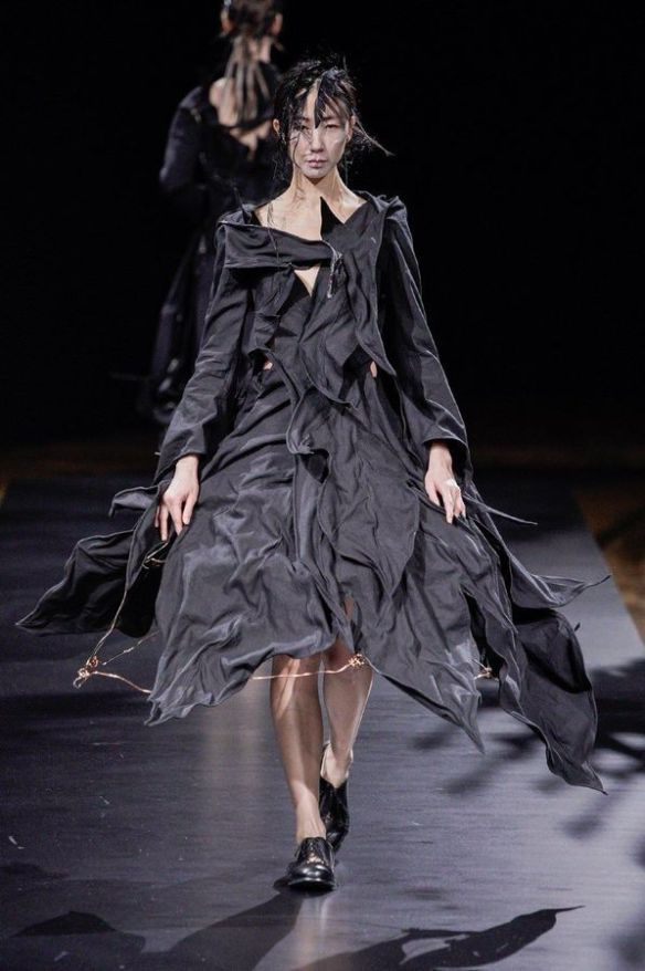 DEFILE YOHJI YAMAMOTO A L’HOTEL DE VILLE: Le créateur japonais a dévoilé une nouvelle déclinaison de son art du drapé, jouant sur la coupe et la structure des vêtements avec beaucoup de sensualité. Une collection sombre avec du noir et blanc pour commencer, puis du noir, du noir et du noir, et pour terminer un final en blanc éclatant pour transmettre malgré tout une lueur d’espoir. Premiers looks épurés avec de fins tissus à peine cousus et maintenus par des noeuds. Puis apparaissent des volumes de plus en plus surprenants avec intégration aux matières de structures rigides. Les tissus semblent s’envoler au dessus de l’épaule, des empiècements paraissent flotter au-dessus des bustes, des fils de fer apparents ressemblant à des barbelés maintiennent des pans fluides de robes toujours plus amples et chargées. En définitive un style aux accents protecteurs, faisant écho aux périls de l’époque actuelle.