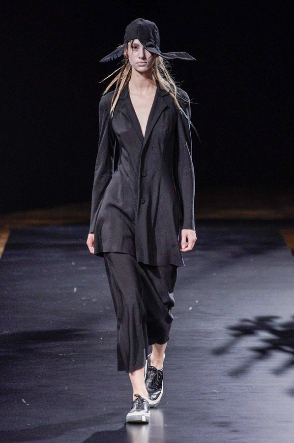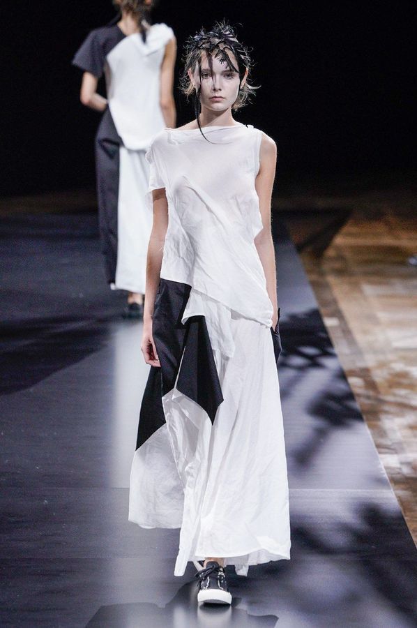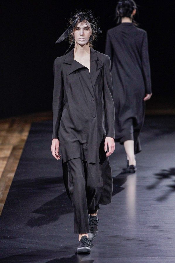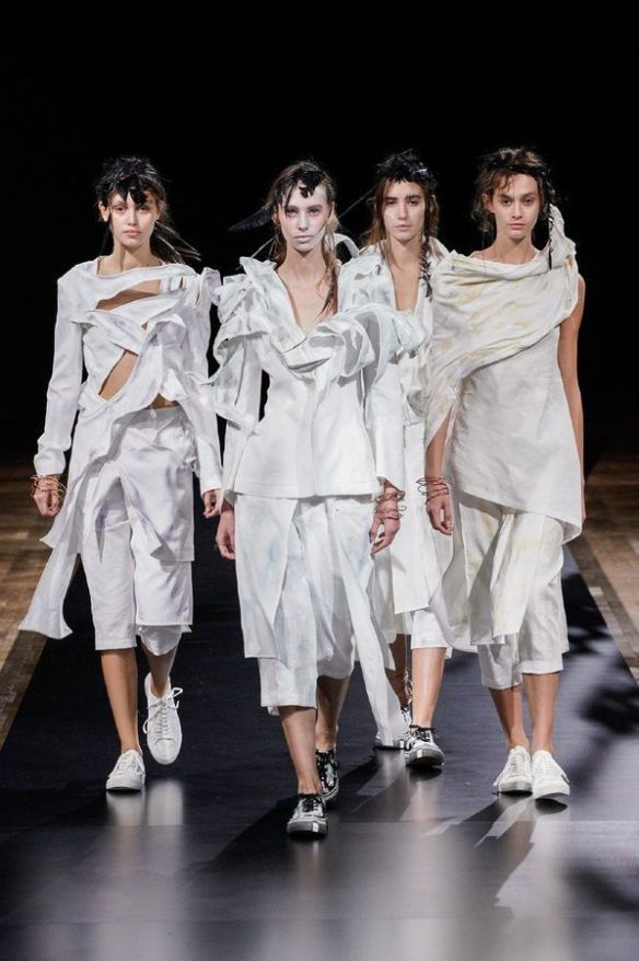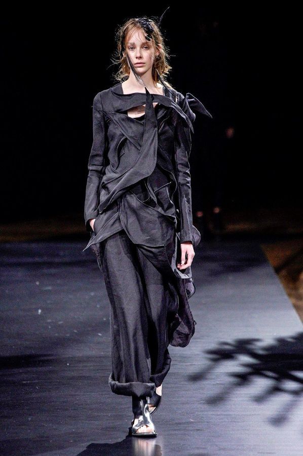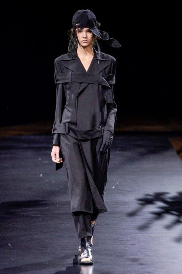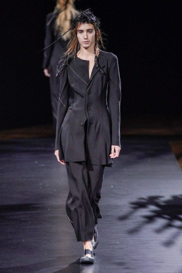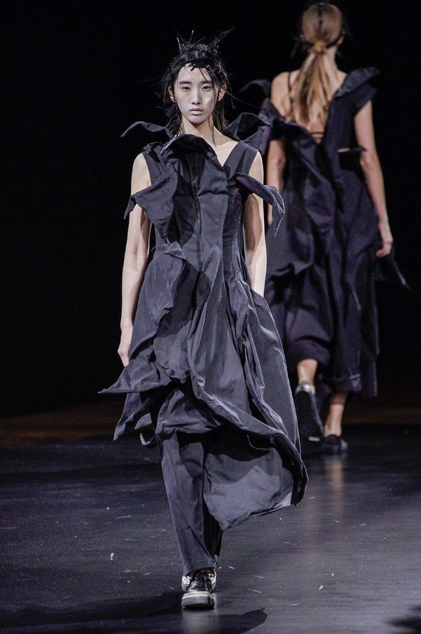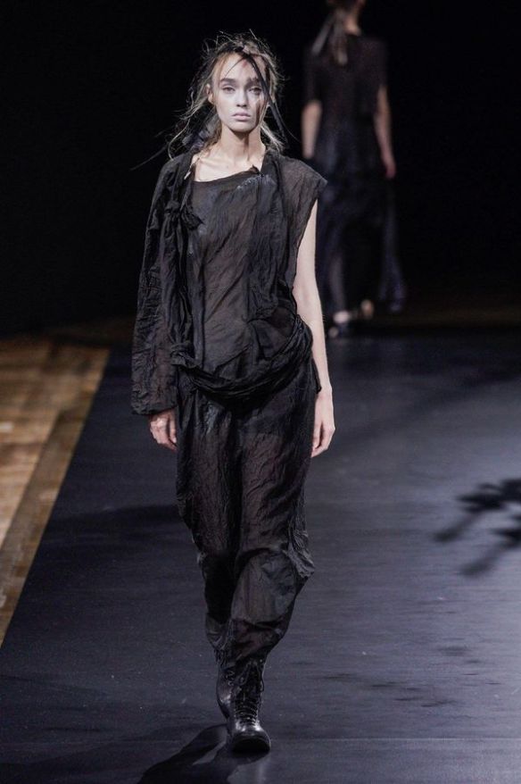 DEFILE YOHJI YAMAMOTO A L’HOTEL DE VILLE: Le créateur japonais a dévoilé une nouvelle déclinaison de son art du drapé, jouant sur la coupe et la structure des vêtements avec beaucoup de sensualité. Une collection sombre avec du noir et blanc pour commencer, puis du noir, du noir et du noir, et pour terminer un final en blanc éclatant pour transmettre malgré tout une lueur d’espoir. Premiers looks épurés avec de fins tissus à peine cousus et maintenus par des noeuds. Puis apparaissent des volumes de plus en plus surprenants avec intégration aux matières de structures rigides. Les tissus semblent s’envoler au dessus de l’épaule, des empiècements paraissent flotter au-dessus des bustes, des fils de fer apparents ressemblant à des barbelés maintiennent des pans fluides de robes toujours plus amples et chargées. En définitive un style aux accents protecteurs, faisant écho aux périls de l’époque actuelle.