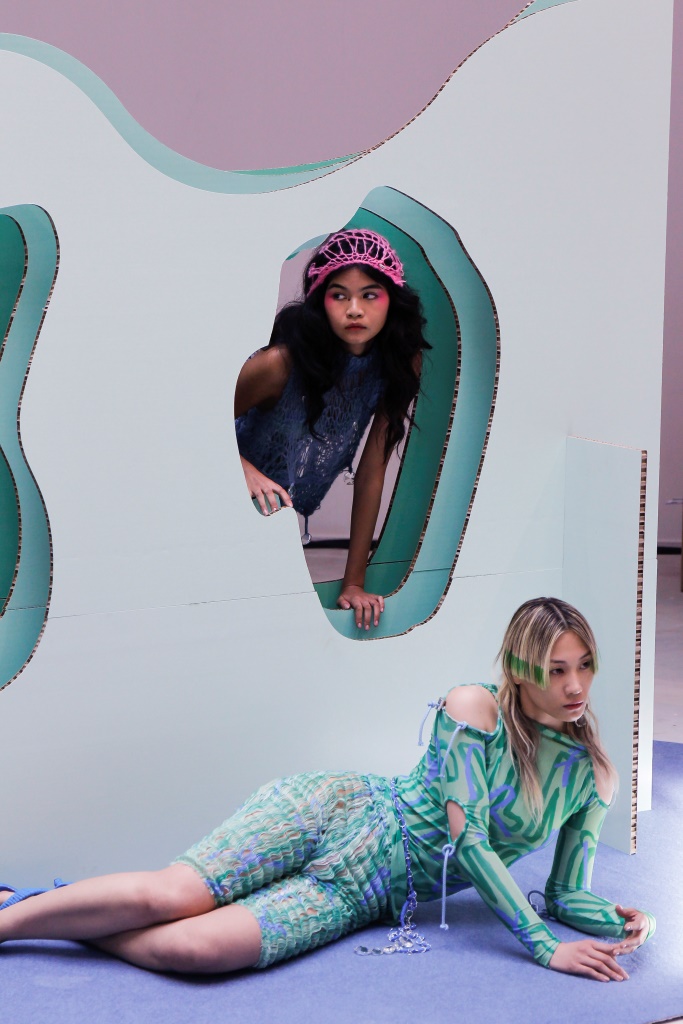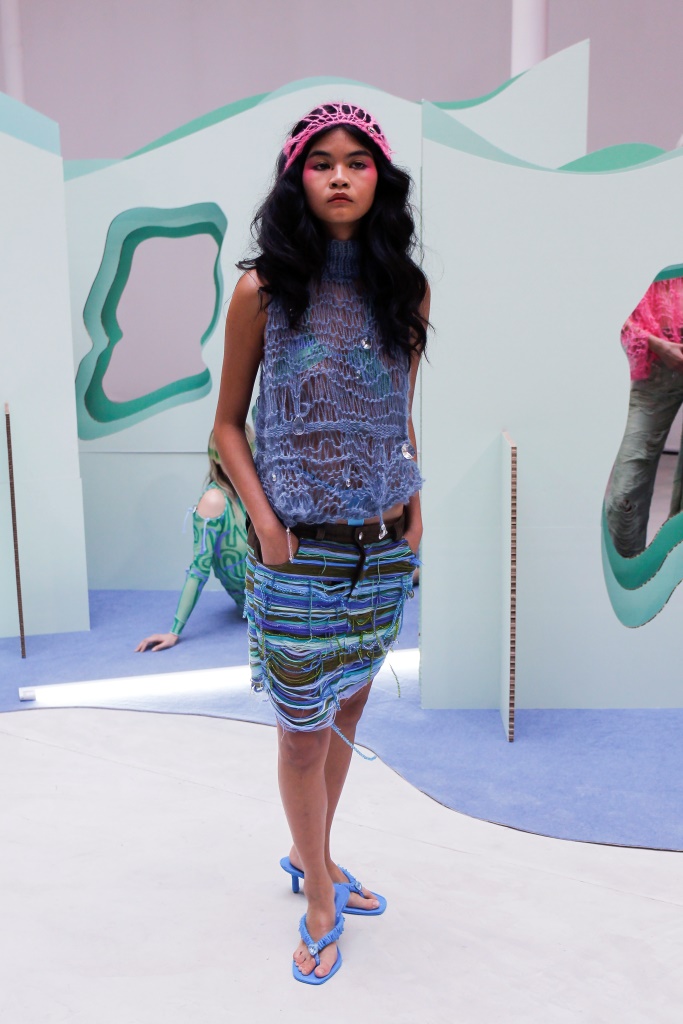 CONSTANCA ENTRUDO: Son style innovant à base d’éléments en patchwork puise largement dans l’upcycling. La créatrice propose un dialogue scénique entre des poèmes européens et brésiliens des années 1960 et des mélanges de tissus élaborés artisanalement. Découpes ajourées, asymétries, ouvertures latérales et toiles fluides rappelant des filets de pêche habillent des mannequins aux airs de sirène qui ondulent autour d’une installation tridimensionnelle organique.