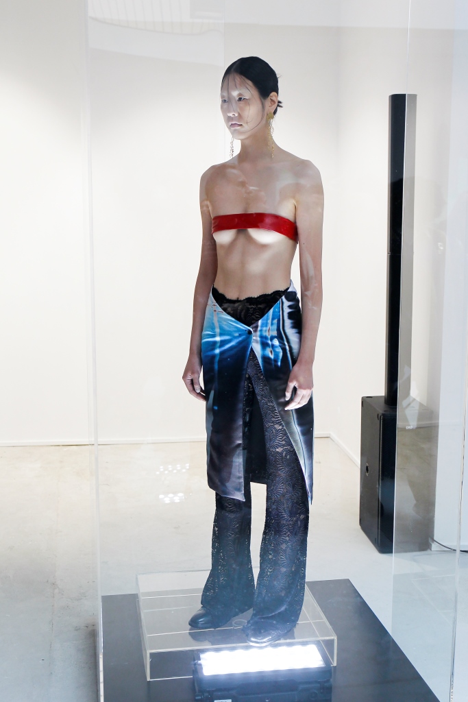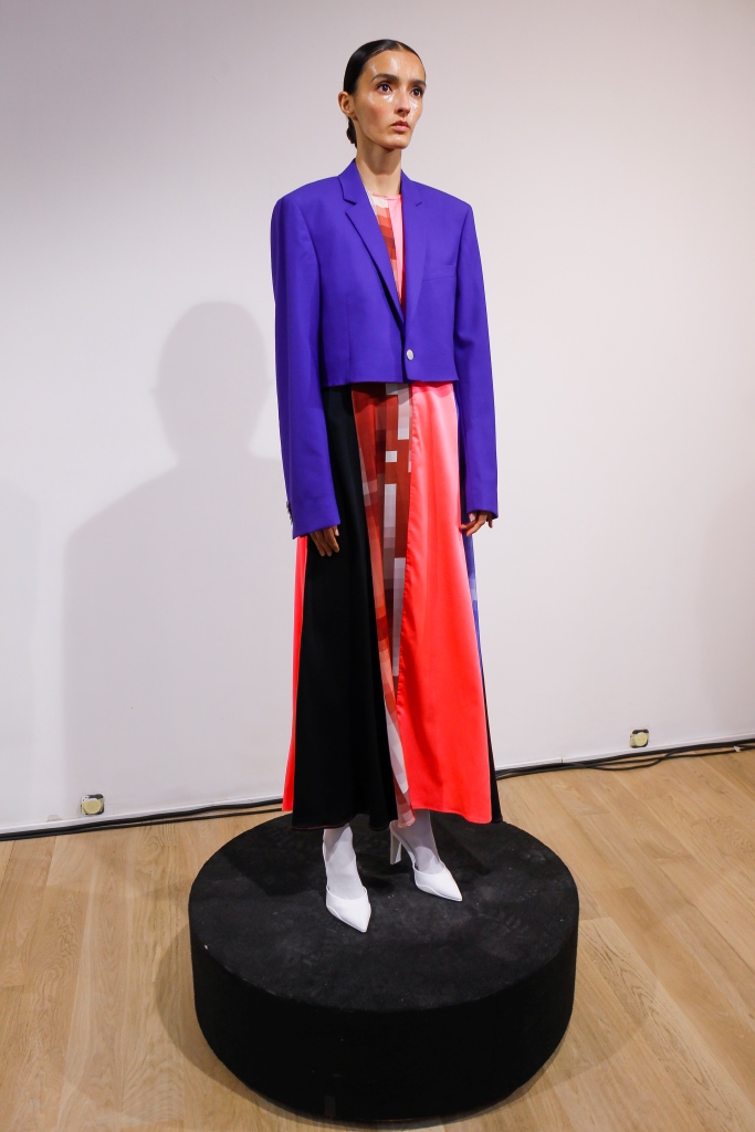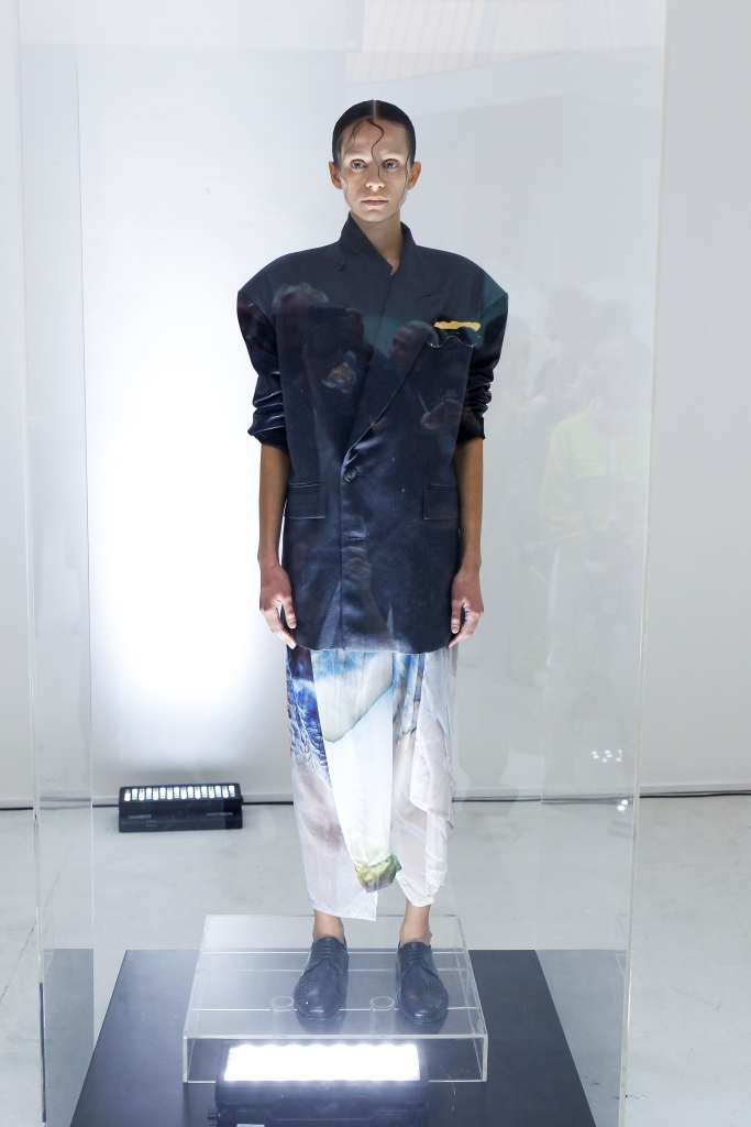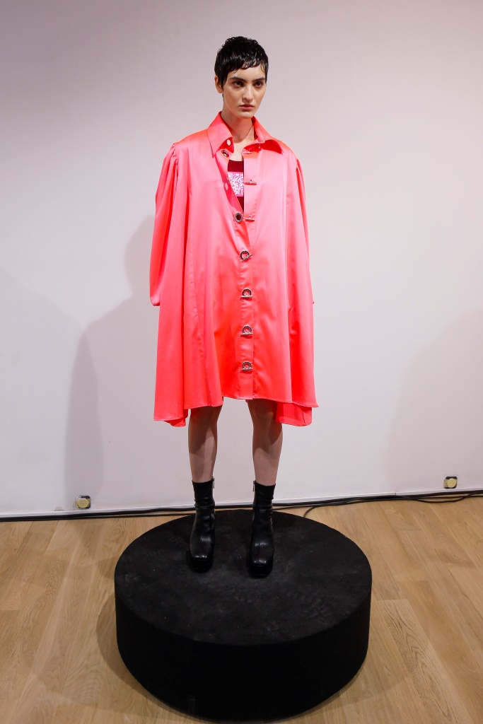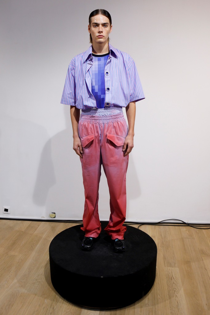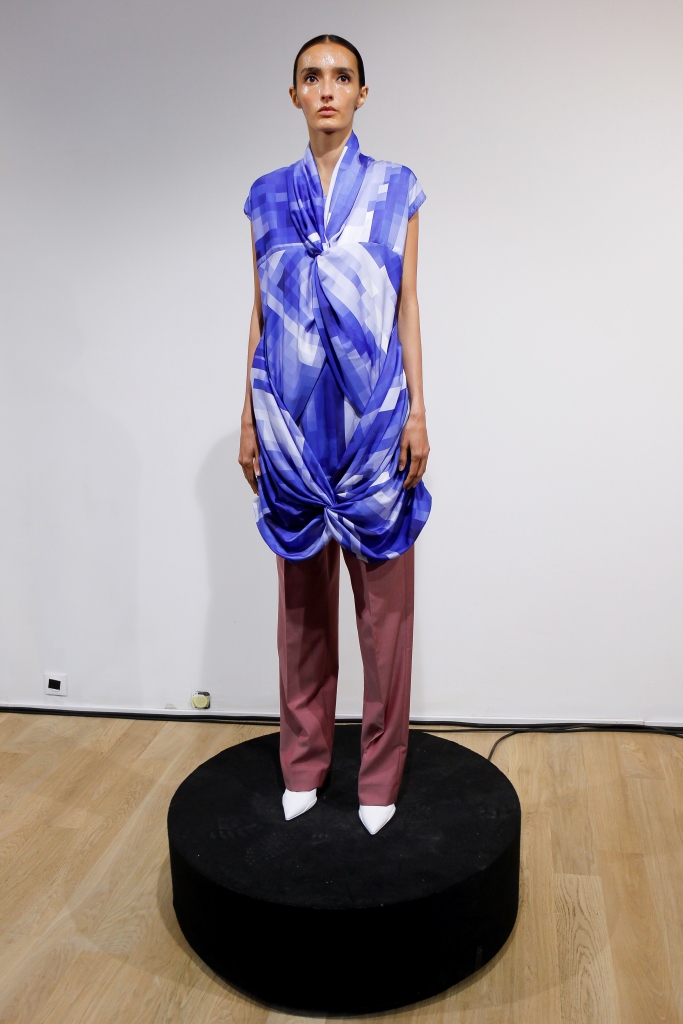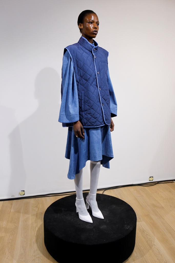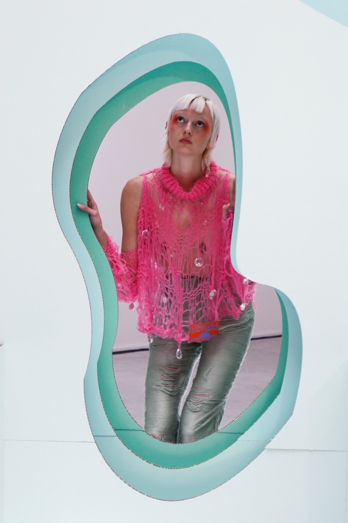 RICARDO ANDREZ: Egalement spécialiste du recyclage des chutes de tissus, le créateur propose une collection contemporaine centrée sur la technologie et utilisant des tissus sensibles à la température corporelle. Sous forme d’un défilé en rotation permanente dans l’une des salles de la galerie, les mannequins portent des associations matelassées et fluides de denim dans différents délavages. Superpositions légères de chemises ouvertes et de chemises en coton bio, de robes drapées, de vestes et de manteaux aux manches oversize. Les nuances de rose, violet et bleu sont assorties aux couleurs de la collection de Constança Entrudo.
