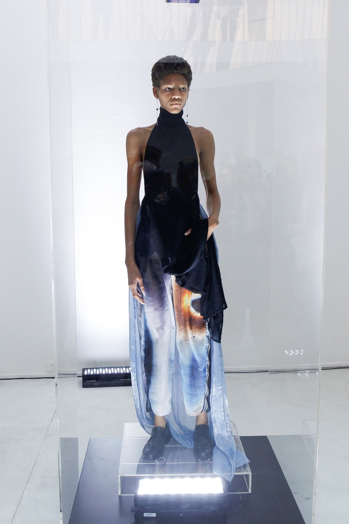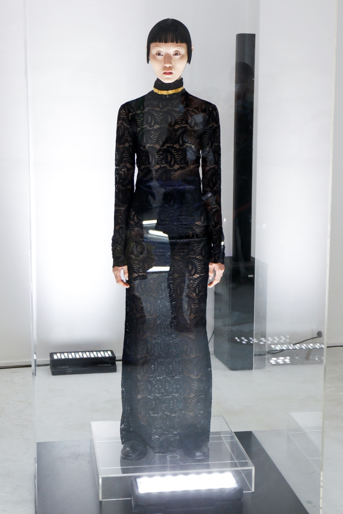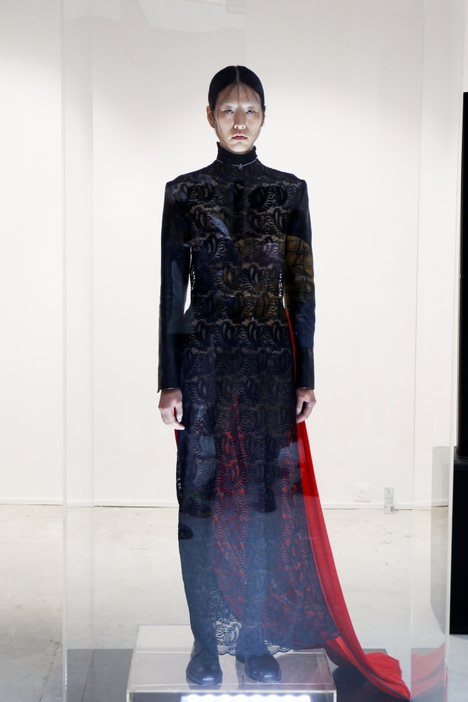MARIA CARLOS BAPTISTA: Sa collection intitulée « Matria » met en scène une femme dominante, aux tenues inspirées de l’homme, plutôt sombres et multipliant les références gothiques. On remarque notamment une robe longue à col montant en dentelle noire, et une autre à dos nu avec un dégradé solaire dans la partie inférieure. La collection reflète son éclectisme, et son goût pour les mélanges de textures et le recyclage.