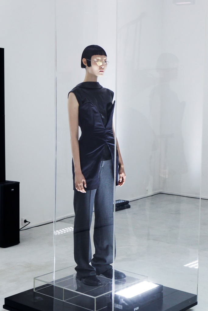 DEFILE SHANG XIA A L’ESPACE COMMINES: Cette marque peu connue en Europe propose un luxe chinois de qualité depuis une dizaine d’années. Elle a été rachetée en 2020 à son ancien propriétaire Hermès par le groupe Exor de la famille Agnelli, qui a confié au créateur Yang Li la direction artistique de son activité mode afin de lui donner un nouveau départ. Pour ce premier défilé à Paris dans le calendrier officiel, le créateur a proposé une collection urbaine et contemporaine aux matières nobles, aux coupes épurées et aux couleurs éclatantes qui vise avant tout les millenials chinois. Il mêle T-shirts zippés cobalt ou jaune fluo en cachemire double face, manteau bubble-gum à poches plaquées, tailleur abricot et manteau croisé argent, pantalons en satin, capes enveloppantes et grandes parkas. Les mannequins sont chaussés de bottes et sandales futuristes à rebord translucide. C’est efficace et séduisant à défaut d’être très original. Il est également à noter que le créateur basé à Paris a décidé que la majorité de la confection serait réalisée en Italie.