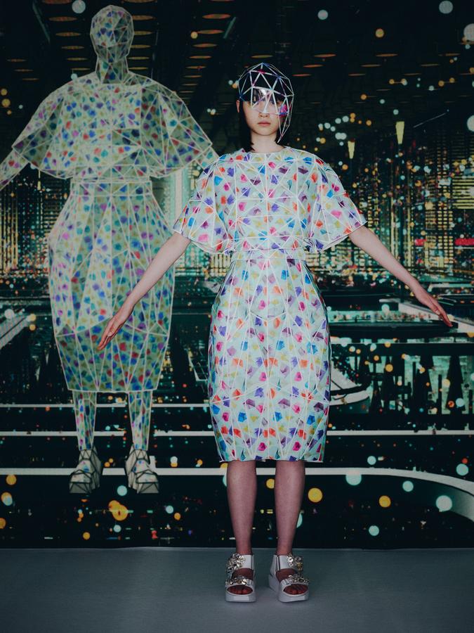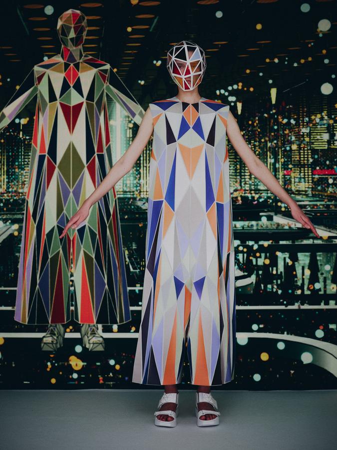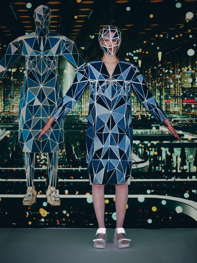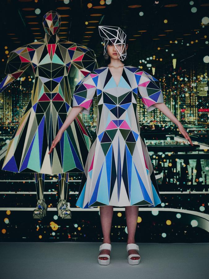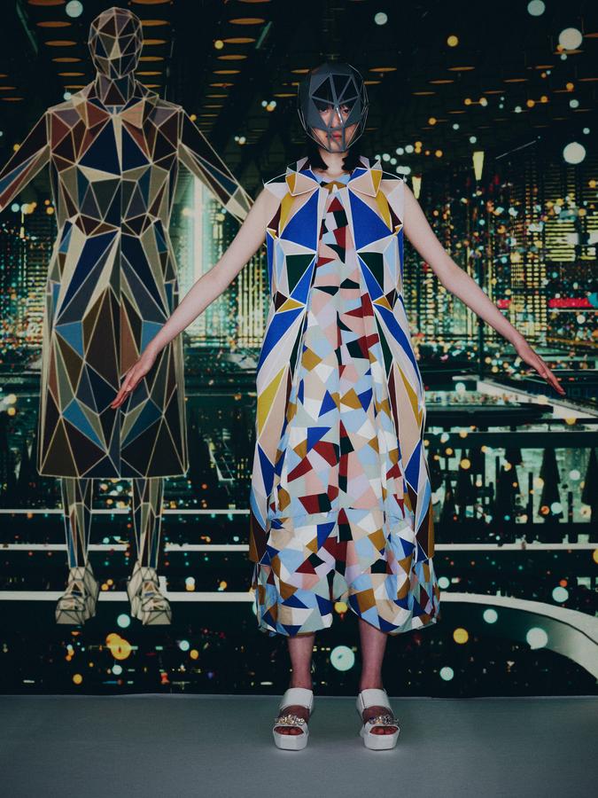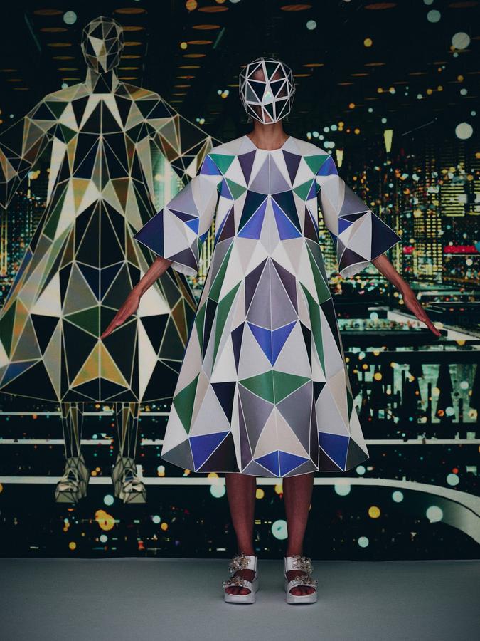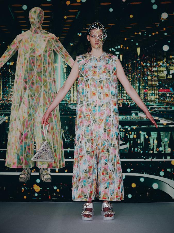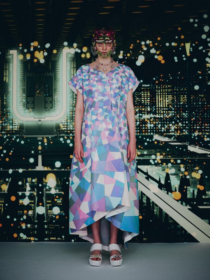 DEFILE ANREALAGE EN DIGITAL: Kunihiko Morinaga, le fondateur de la marque, a donné une nouvelle preuve de la créativité japonaise avec ce projet artistique hors normes, naviguant entre réel et virtuel, et fusionnant animation et défilé de mode. Le créateur s’est inspiré du film d’animation « Belle » du réalisateur japonais Mamoru Hosoda, présenté à Cannes en juillet, dans lequel il a créé le costume de scène virtuel de l’actrice principale, une lycéenne timide de 17 ans qui se transforme en pop star (Belle) dès qu’elle entre dans un monde virtuel dénommé « U ». Au travers d’un film magique qui nous transporte dans la quatrième dimension il poursuit ses expérimentations et prouesses technologiques. Des centaines de triangles lumineux éclatés à travers tout l’écran se recomposent sous nos yeux pour donner forme à des tenues éblouissantes dans un kaléidoscope de couleurs et de lumières fluorescentes. En réel ces robes Arlequin aux mille facettes qui créent des formes sculpturales géométriques sans couture sont fabriquées à partir de triangles en tissu (jusqu’à 500 pour les silhouettes les plus spectaculaires) provenant pour la plupart de vêtements usagés (jeans délavés, chinos d’occasion, vêtements militaires et autres trenchs vintage), mais aussi d’imprimés floraux coupés puis appliqués sur des triangles en coton ou en lin. Il y a également des matériaux réfléchissants qui permettent aux habits de s’illuminer à la tombée de la nuit. Les looks sont complétés par des sandales à plateforme assorties d’United Nude, des bijoux en résine avec des fleurs séchées d’Anever et des casques sculpturaux. Un chef d’oeuvre d’imagination à la croisée de la science-fiction et de la poésie.