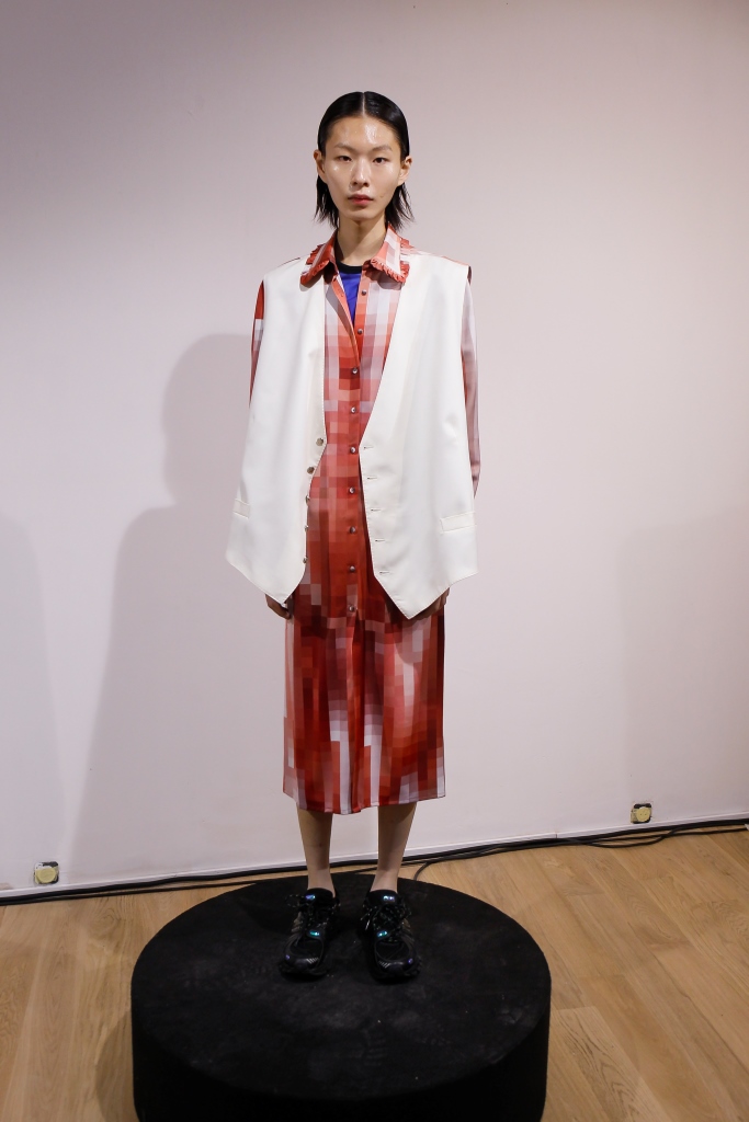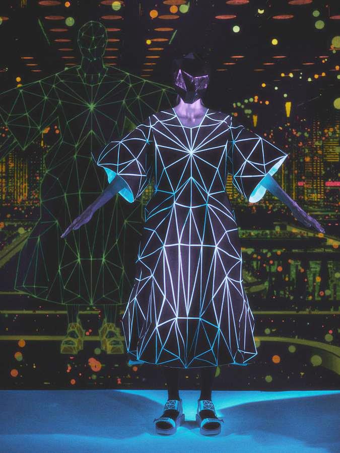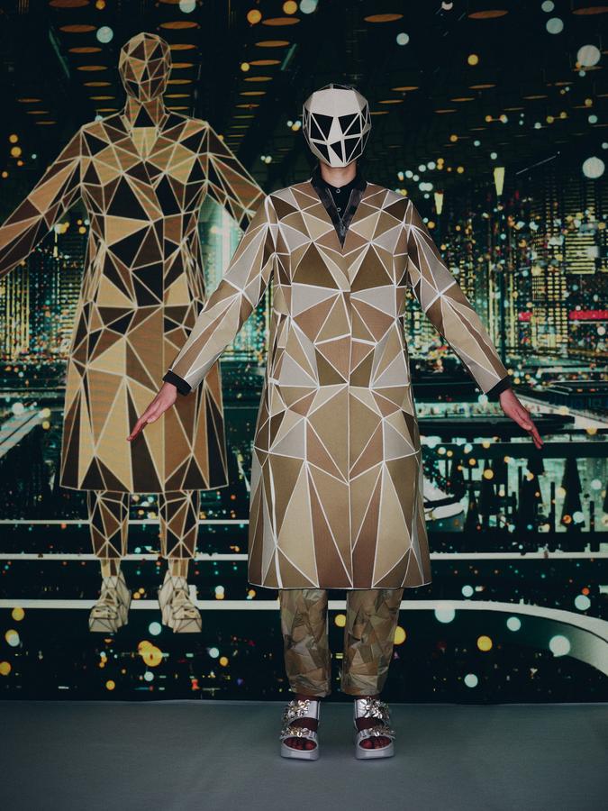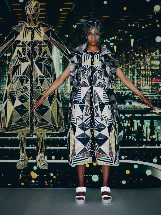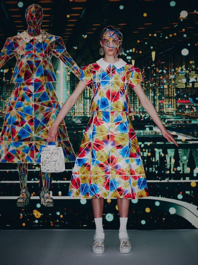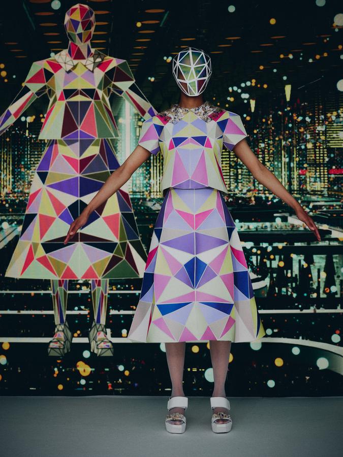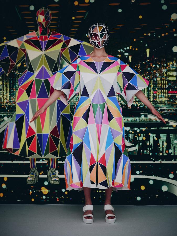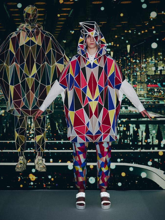 DEFILE ANREALAGE EN DIGITAL: Kunihiko Morinaga, le fondateur de la marque, a donné une nouvelle preuve de la créativité japonaise avec ce projet artistique hors normes, naviguant entre réel et virtuel, et fusionnant animation et défilé de mode. Le créateur s’est inspiré du film d’animation « Belle » du réalisateur japonais Mamoru Hosoda, présenté à Cannes en juillet, dans lequel il a créé le costume de scène virtuel de l’actrice principale, une lycéenne timide de 17 ans qui se transforme en pop star (Belle) dès qu’elle entre dans un monde virtuel dénommé « U ». Au travers d’un film magique qui nous transporte dans la quatrième dimension il poursuit ses expérimentations et prouesses technologiques. Des centaines de triangles lumineux éclatés à travers tout l’écran se recomposent sous nos yeux pour donner forme à des tenues éblouissantes dans un kaléidoscope de couleurs et de lumières fluorescentes. En réel ces robes Arlequin aux mille facettes qui créent des formes sculpturales géométriques sans couture sont fabriquées à partir de triangles en tissu (jusqu’à 500 pour les silhouettes les plus spectaculaires) provenant pour la plupart de vêtements usagés (jeans délavés, chinos d’occasion, vêtements militaires et autres trenchs vintage), mais aussi d’imprimés floraux coupés puis appliqués sur des triangles en coton ou en lin. Il y a également des matériaux réfléchissants qui permettent aux habits de s’illuminer à la tombée de la nuit. Les looks sont complétés par des sandales à plateforme assorties d’United Nude, des bijoux en résine avec des fleurs séchées d’Anever et des casques sculpturaux. Un chef d’oeuvre d’imagination à la croisée de la science-fiction et de la poésie.