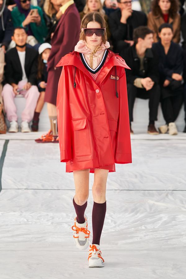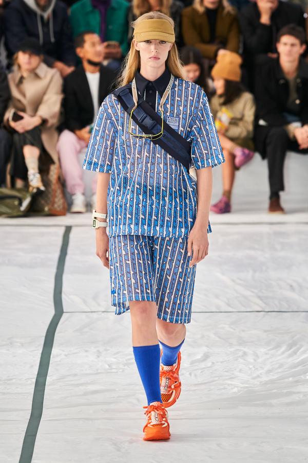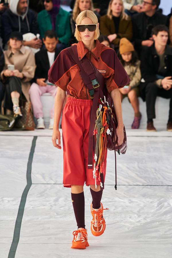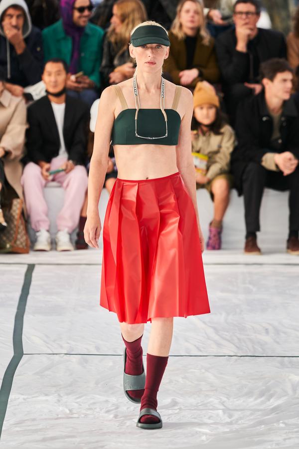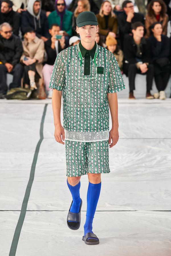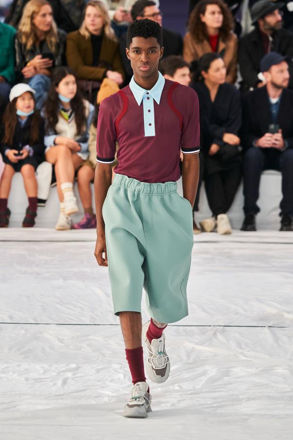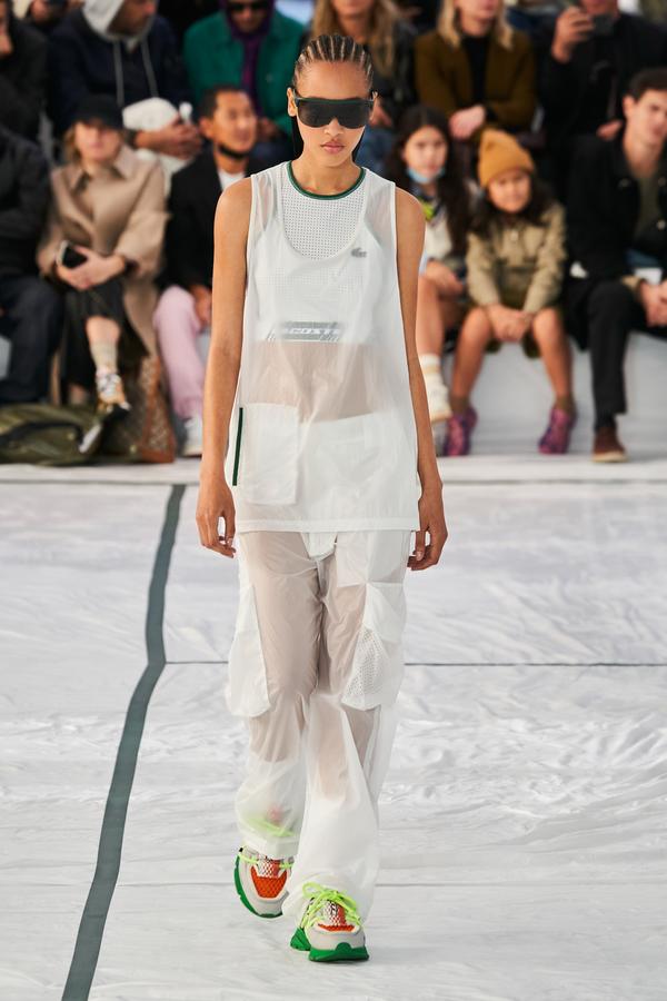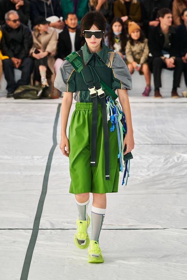 DEFILE LACOSTE SUR LE PARVIS DU PALAIS DE TOKYO: La britannique Louise Trotter, directrice artistique depuis 2018 de la marque française fondée par René Lacoste en 1933, a rendu un hommage manifeste à ses origines en dévoilant sa nouvelle collection (mixte) sur un court de tennis reconstitué. Les looks urbains, chic et confortables présentés ont toutefois aussi incorporé les codes de nombreux autres sports (basket, baseball, boxe, golf). Brassière en néoprène vert foncé sur un bermuda léger rose saumon accessoirisé d’une paire de chaussettes hautes bordeaux et de claquettes pour commencer. Puis s’enchaînent mini-jupes plissées, polos bi-matières, ensembles qui jouent sur les transparences, ponchos aux allures de hoodies, pantalons amples à taille haute et à coupe raccourcie, shorts et débardeurs assortis, lunettes de soleil futuristes et visières. Le tout dans une large palette de couleurs contrastées. Les matières techniques comme le caoutchouc des jupes plissées, le néoprène des tops et bombers, la résille des vestes ou la maille des polos et shorts longs, fusionnant parfois sur une même pièce, donnent une allure très actuelle à cette collection élégante, fonctionnelle et pratique, sans renier l’ADN de la maison.