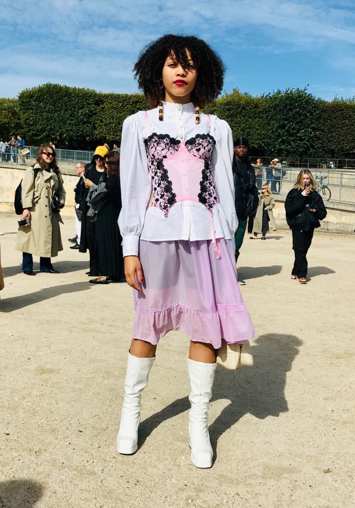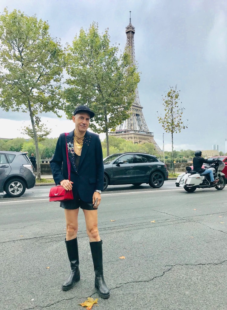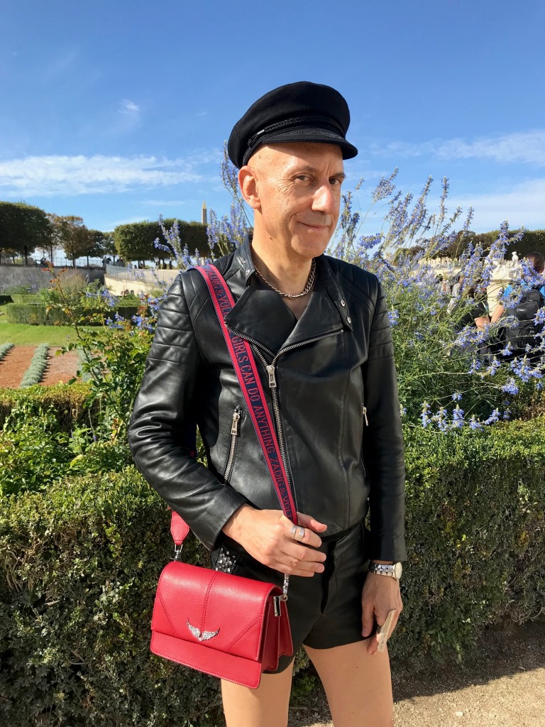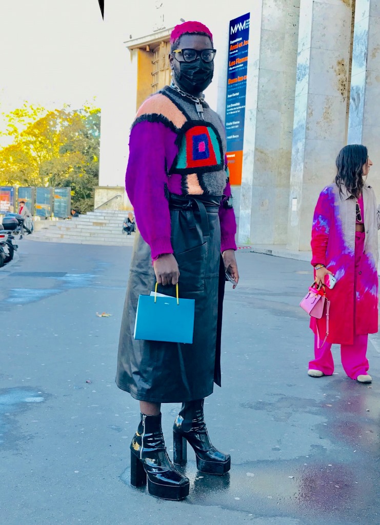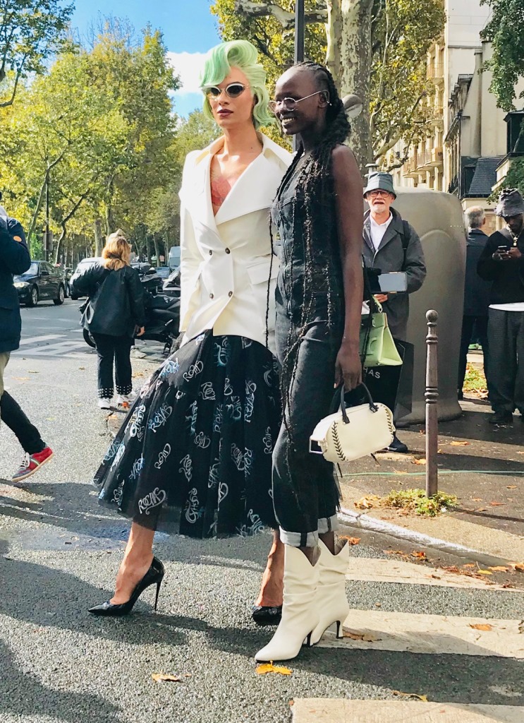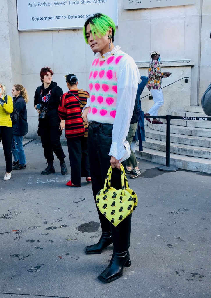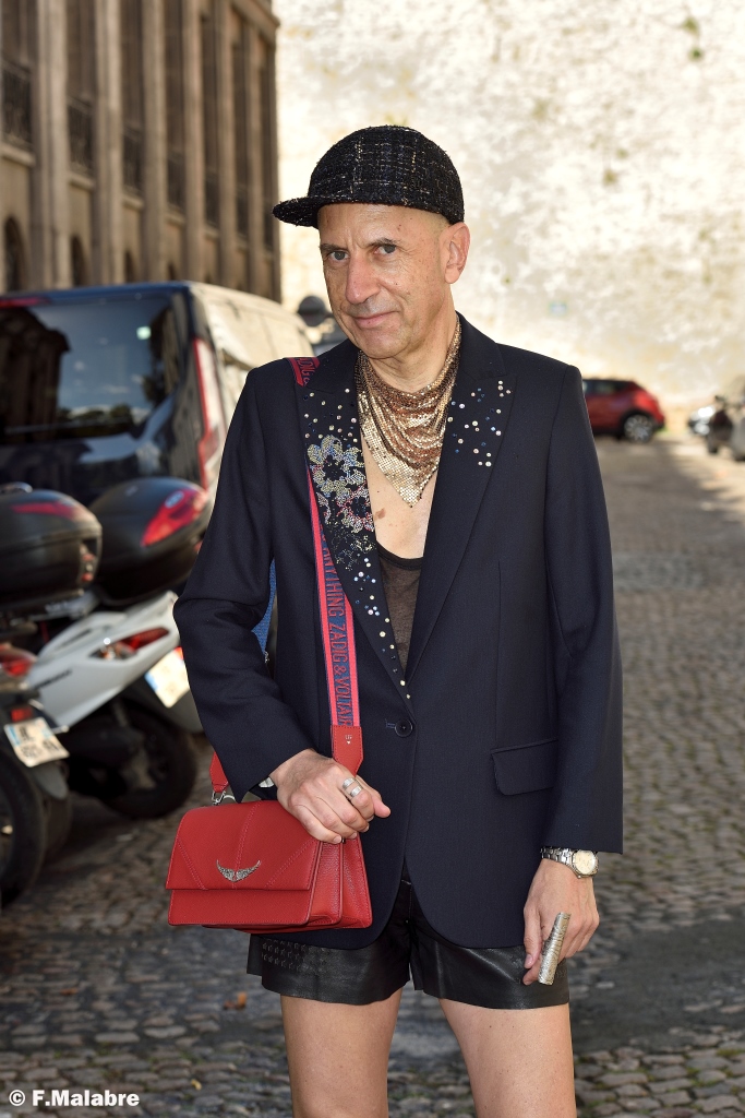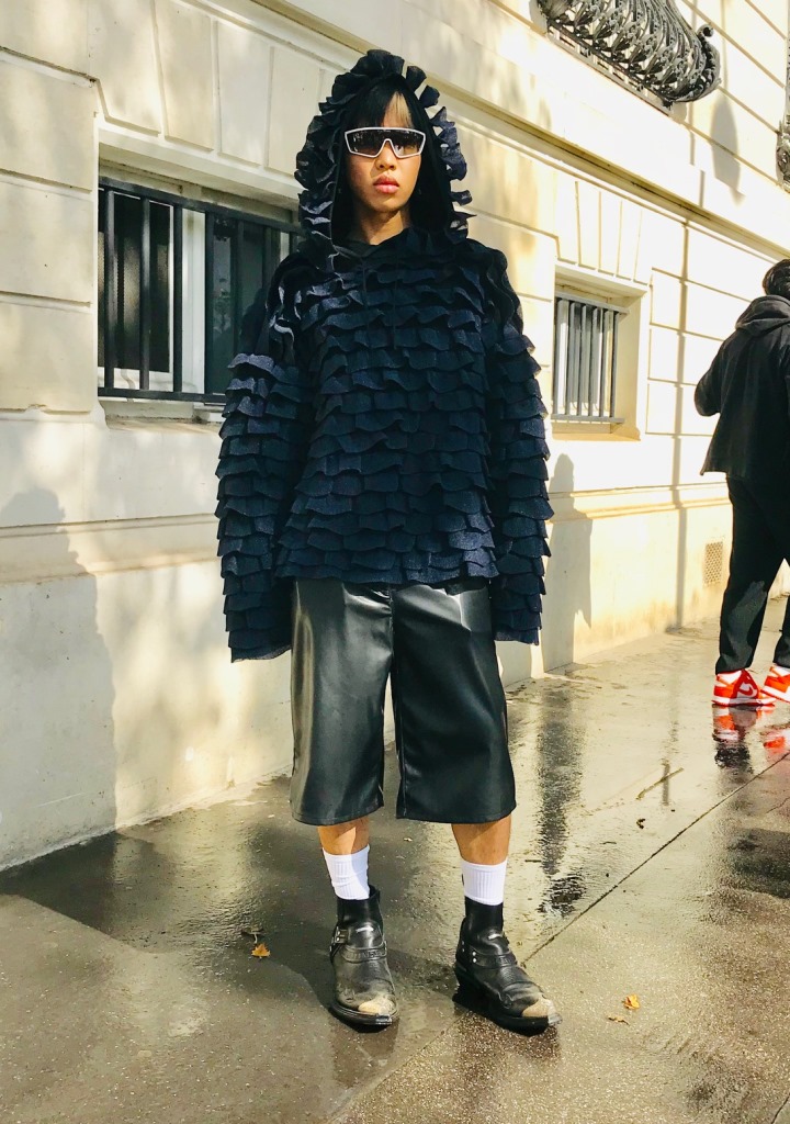 DEFILE RICK OWENS SUR LE PARVIS DU PALAIS DE TOKYO: Le créateur d’origine californienne a retrouvé son lieu de défilé préféré avec en ouverture sa femme Michèle Lamy, magistrale dans une robe en cuir noir pleine de saillies évoquant des carcasses de voitures, avec une cape filet flottant sur ses épaules et de nouvelles cuissardes dragon avec talons en plexiglas et découpe tout le long de la tige. Puis, dans un décor toujours aussi impressionnant avec des machines qui embrument les fontaines et le public en propulsant une épaisse fumée blanche, des mages noirs postés sur les toits qui jettent des feuilles de jasmin dans le vide, les mannequins avancent conquérantes, dans des robes sculpturales abstraites en denim japonais tissé sur des métiers anciens, ou en coton bio certifié GOTS, chaussées de cuissardes compensées de maîtresse dominatrice. Les robes toile d’araignée en mohair, avec des trous mobiles et amovibles, sont surprenantes. Lunettes de science-fiction pour un voyage vers un autre monde. Envoûtant comme toujours!