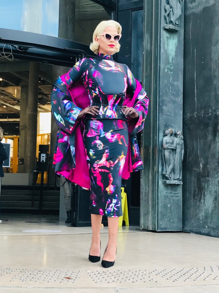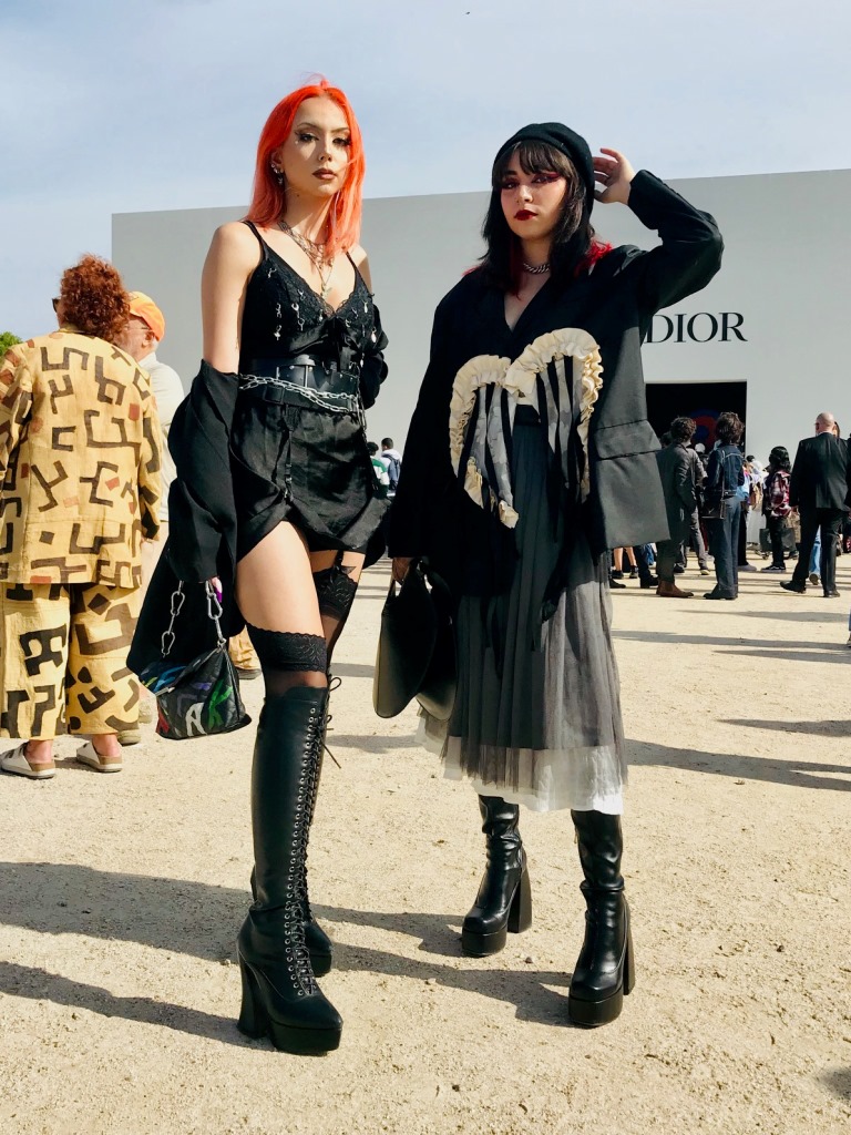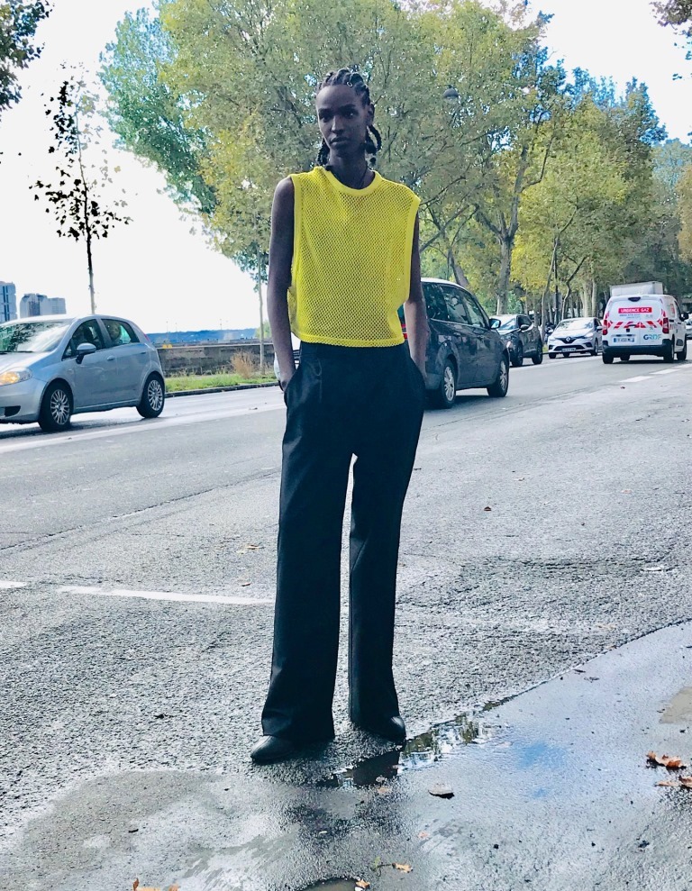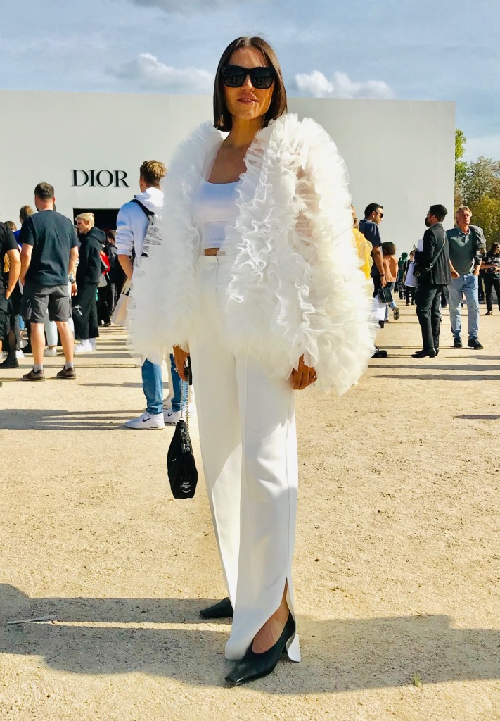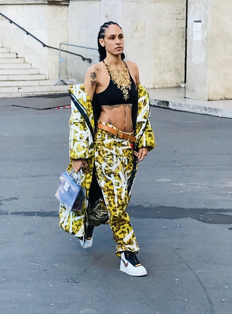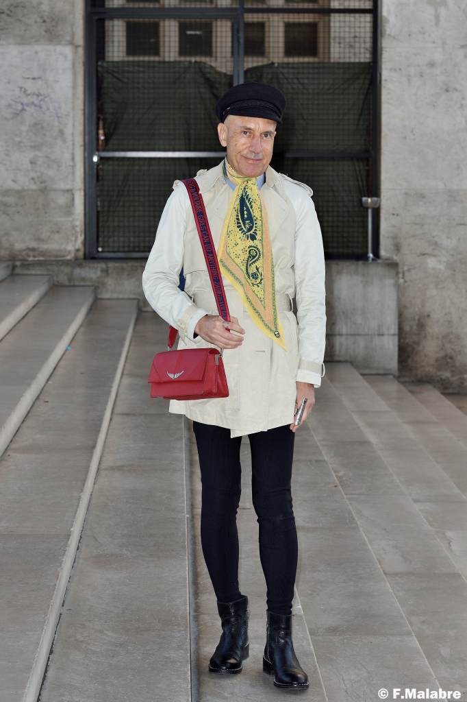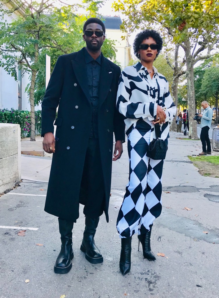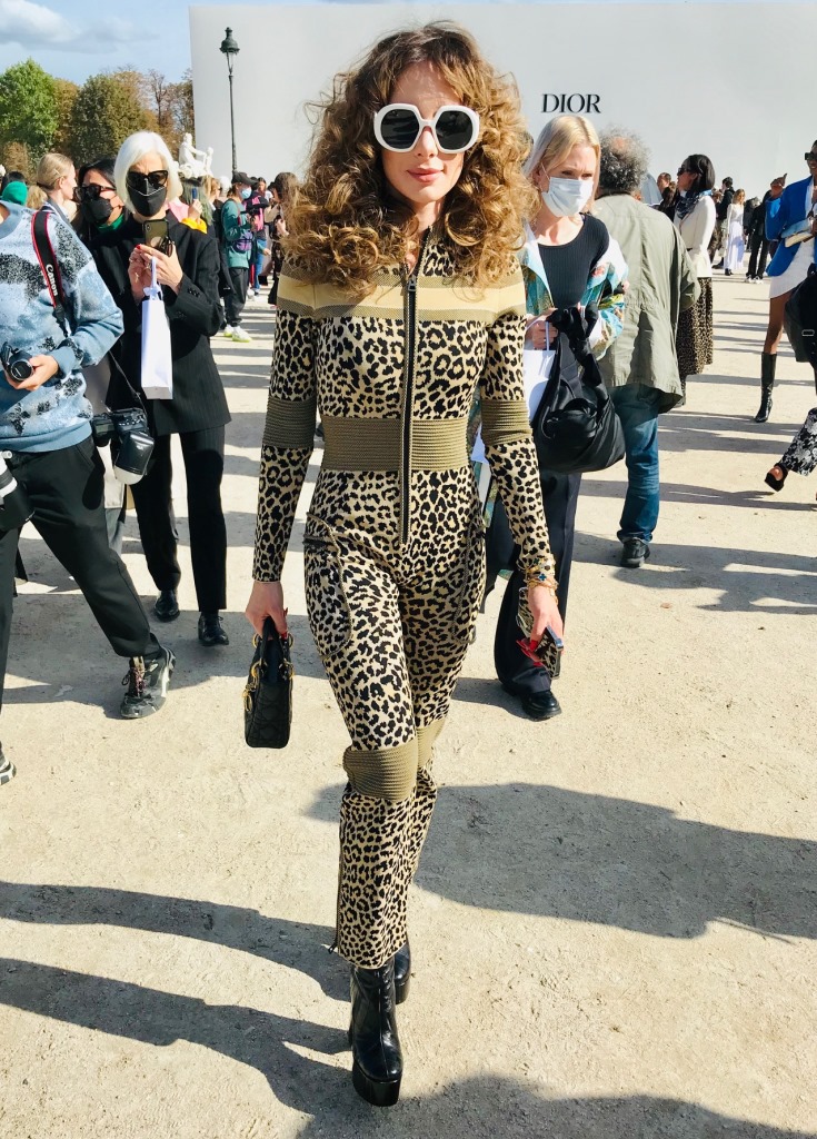DEFILE RICK OWENS SUR LE PARVIS DU PALAIS DE TOKYO: Le créateur d’origine californienne a retrouvé son lieu de défilé préféré avec en ouverture sa femme Michèle Lamy, magistrale dans une robe en cuir noir pleine de saillies évoquant des carcasses de voitures, avec une cape filet flottant sur ses épaules et de nouvelles cuissardes dragon avec talons en plexiglas et découpe tout le long de la tige. Puis, dans un décor toujours aussi impressionnant avec des machines qui embrument les fontaines et le public en propulsant une épaisse fumée blanche, des mages noirs postés sur les toits qui jettent des feuilles de jasmin dans le vide, les mannequins avancent conquérantes, dans des robes sculpturales abstraites en denim japonais tissé sur des métiers anciens, ou en coton bio certifié GOTS, chaussées de cuissardes compensées de maîtresse dominatrice. Les robes toile d’araignée en mohair, avec des trous mobiles et amovibles, sont surprenantes. Lunettes de science-fiction pour un voyage vers un autre monde. Envoûtant comme toujours!