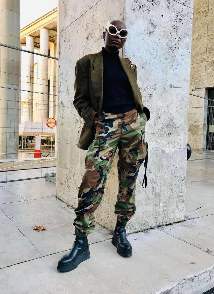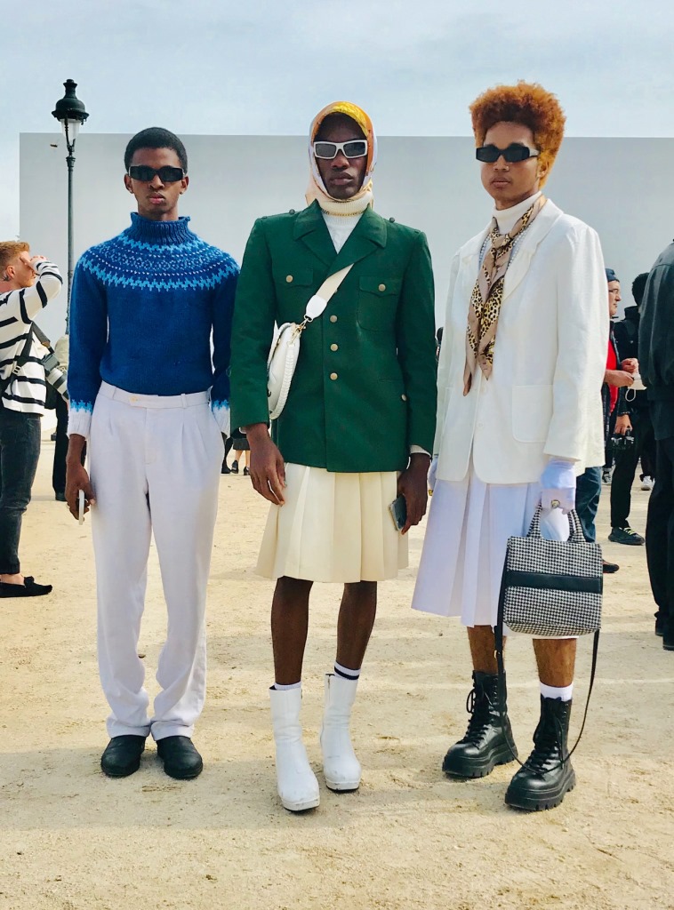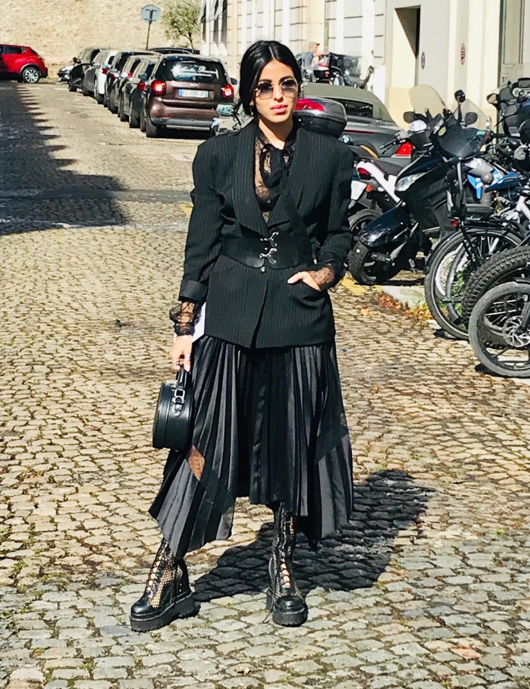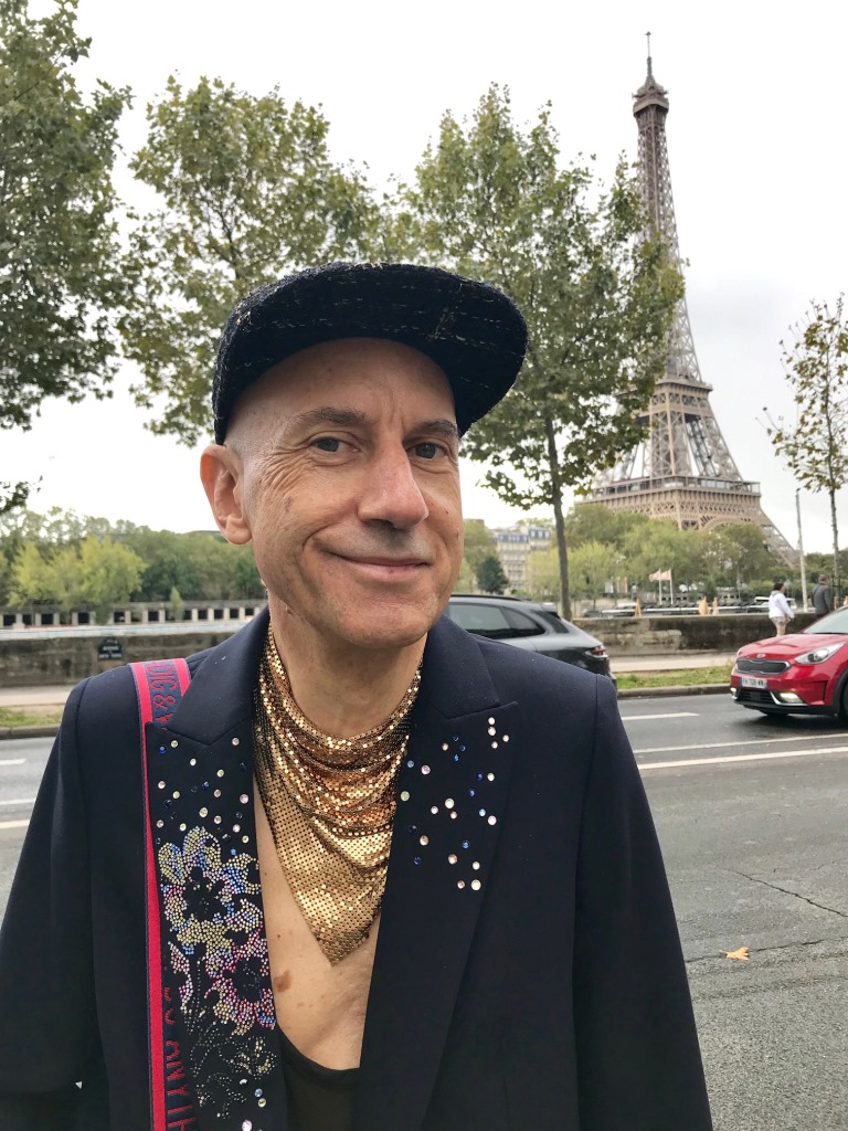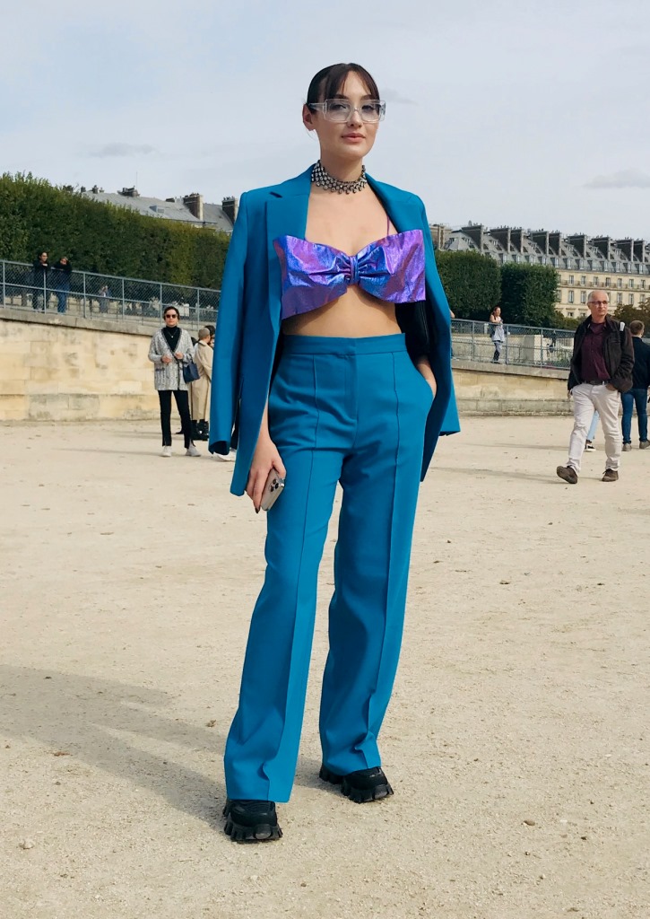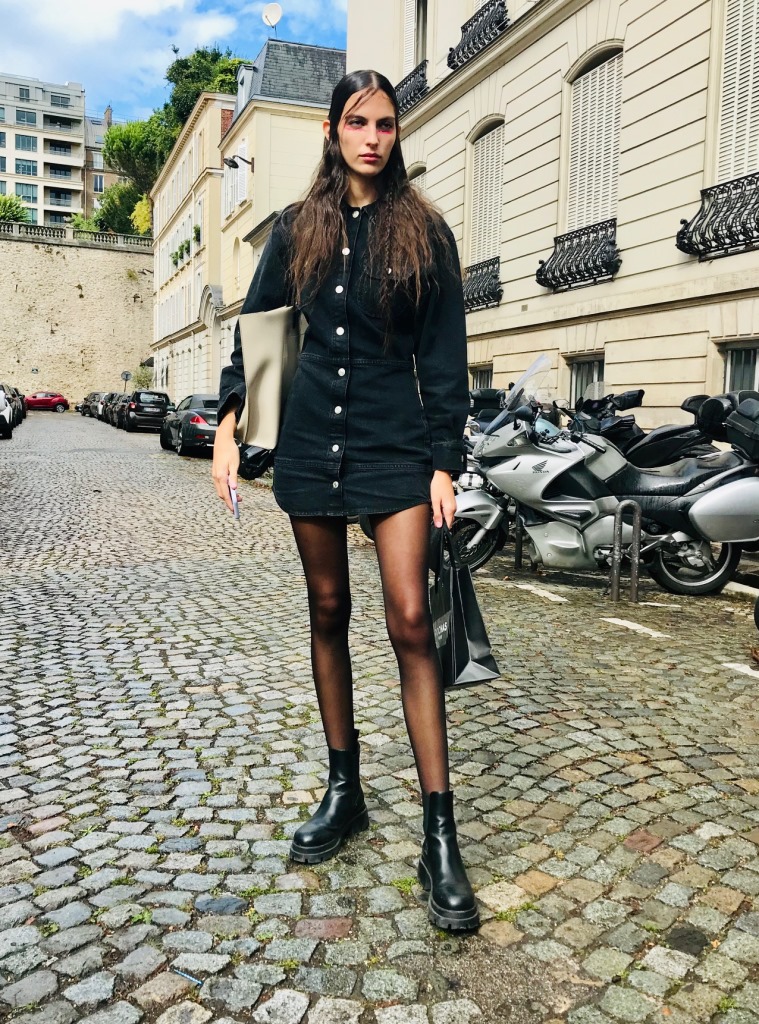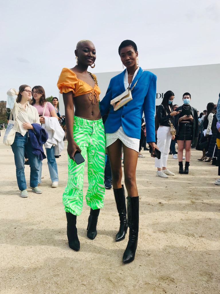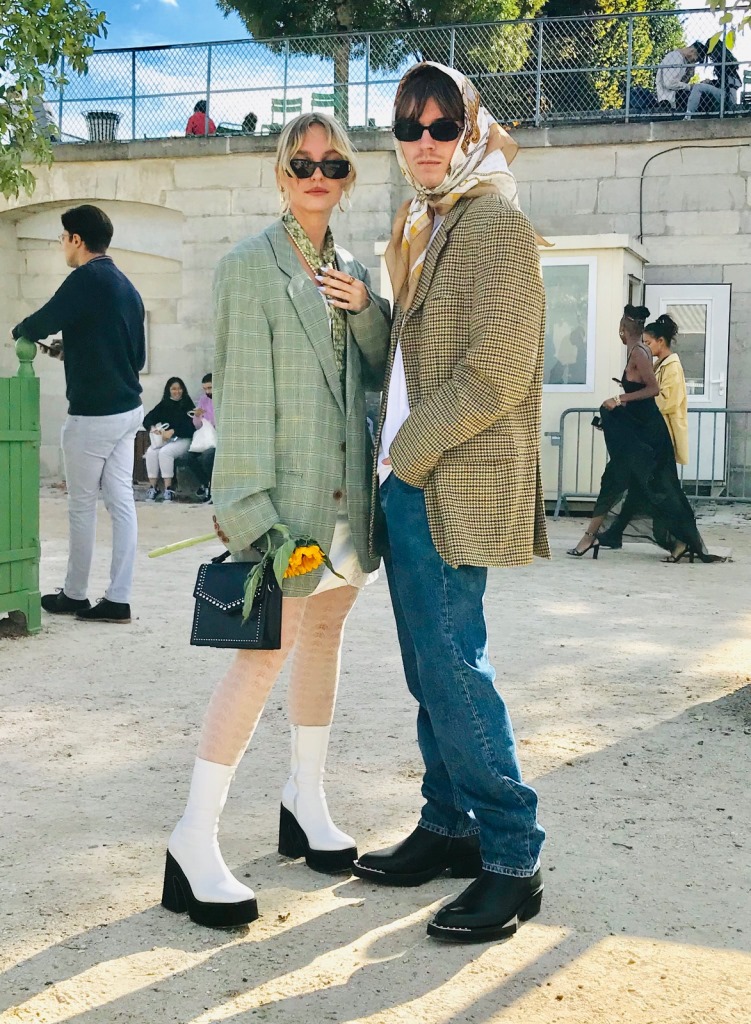 DEFILE RICK OWENS SUR LE PARVIS DU PALAIS DE TOKYO: Le créateur d’origine californienne a retrouvé son lieu de défilé préféré avec en ouverture sa femme Michèle Lamy, magistrale dans une robe en cuir noir pleine de saillies évoquant des carcasses de voitures, avec une cape filet flottant sur ses épaules et de nouvelles cuissardes dragon avec talons en plexiglas et découpe tout le long de la tige. Puis, dans un décor toujours aussi impressionnant avec des machines qui embrument les fontaines et le public en propulsant une épaisse fumée blanche, des mages noirs postés sur les toits qui jettent des feuilles de jasmin dans le vide, les mannequins avancent conquérantes, dans des robes sculpturales abstraites en denim japonais tissé sur des métiers anciens, ou en coton bio certifié GOTS, chaussées de cuissardes compensées de maîtresse dominatrice. Les robes toile d’araignée en mohair, avec des trous mobiles et amovibles, sont surprenantes. Lunettes de science-fiction pour un voyage vers un autre monde. Envoûtant comme toujours!
