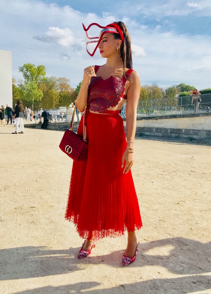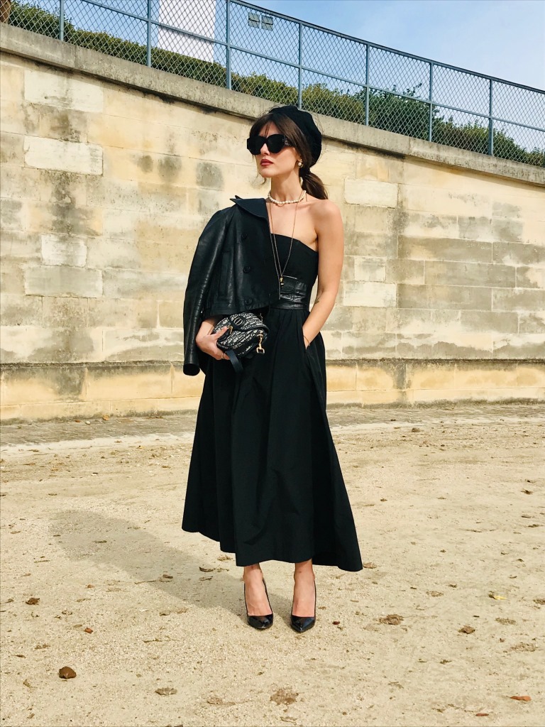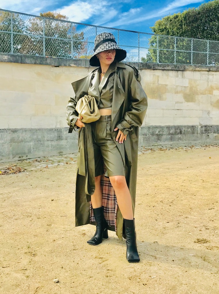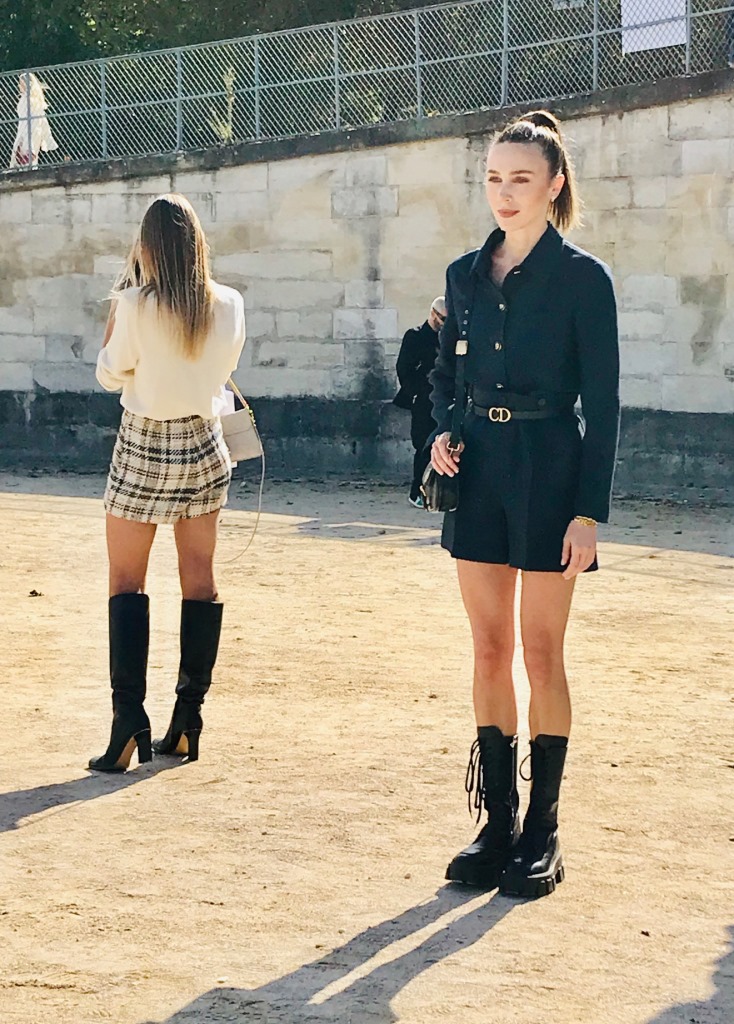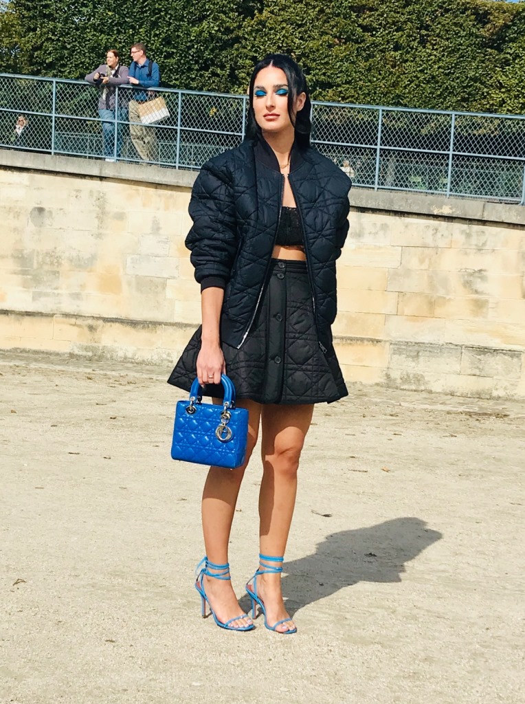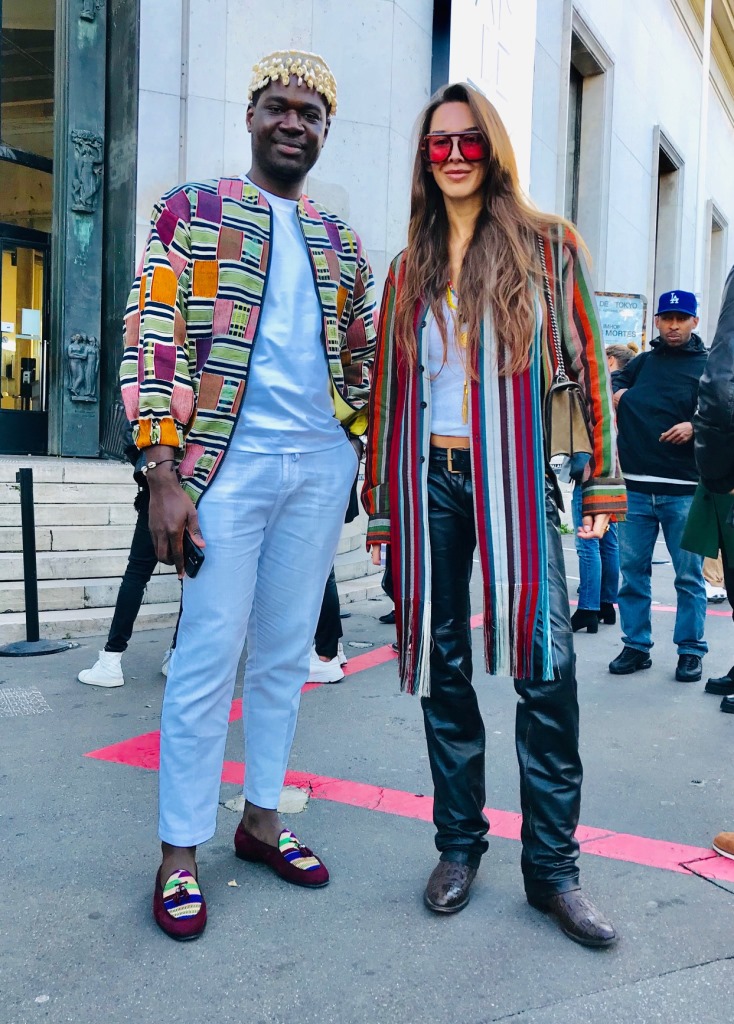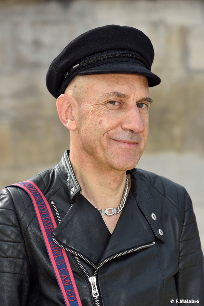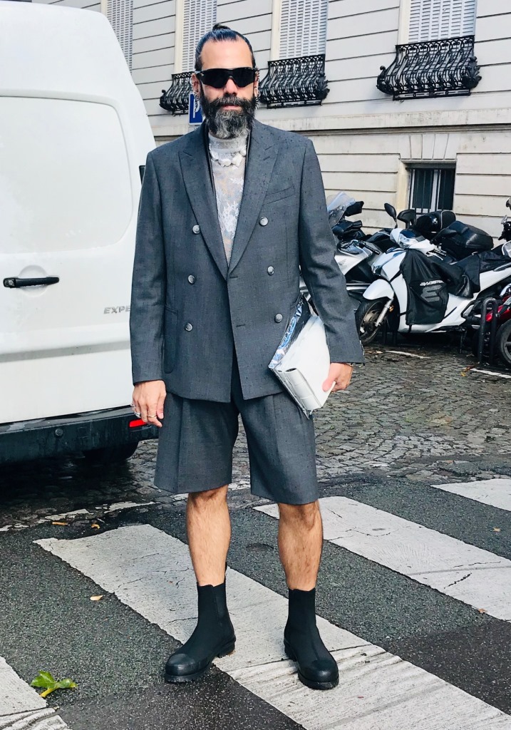 DEFILE RICK OWENS SUR LE PARVIS DU PALAIS DE TOKYO: Le créateur d’origine californienne a retrouvé son lieu de défilé préféré avec en ouverture sa femme Michèle Lamy, magistrale dans une robe en cuir noir pleine de saillies évoquant des carcasses de voitures, avec une cape filet flottant sur ses épaules et de nouvelles cuissardes dragon avec talons en plexiglas et découpe tout le long de la tige. Puis, dans un décor toujours aussi impressionnant avec des machines qui embrument les fontaines et le public en propulsant une épaisse fumée blanche, des mages noirs postés sur les toits qui jettent des feuilles de jasmin dans le vide, les mannequins avancent conquérantes, dans des robes sculpturales abstraites en denim japonais tissé sur des métiers anciens, ou en coton bio certifié GOTS, chaussées de cuissardes compensées de maîtresse dominatrice. Les robes toile d’araignée en mohair, avec des trous mobiles et amovibles, sont surprenantes. Lunettes de science-fiction pour un voyage vers un autre monde. Envoûtant comme toujours!