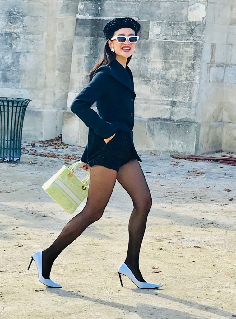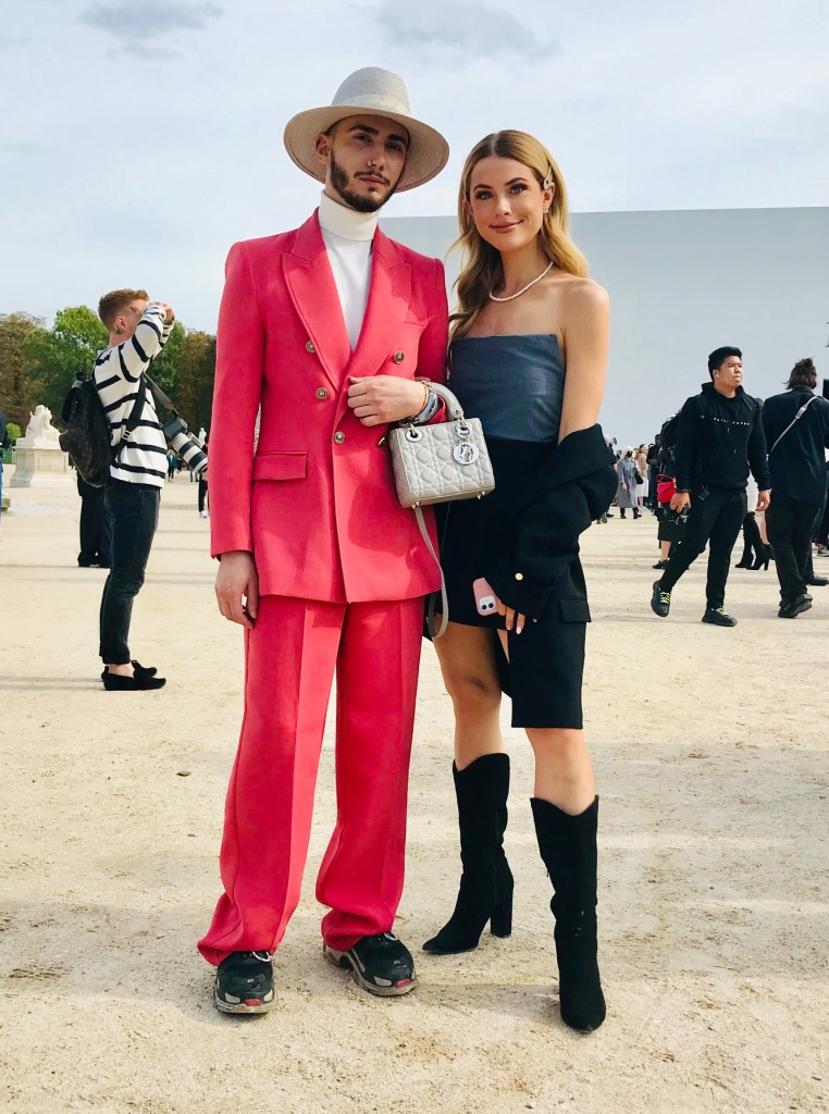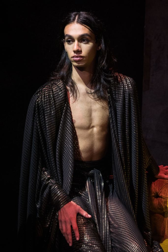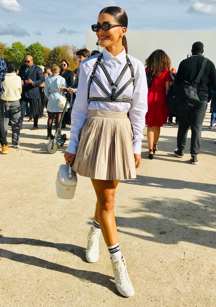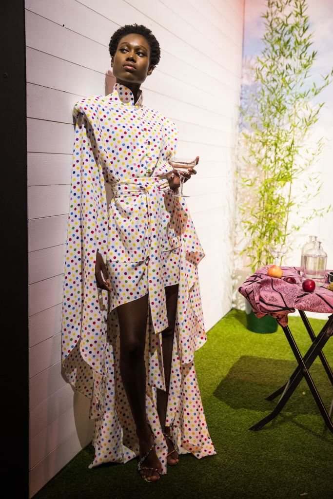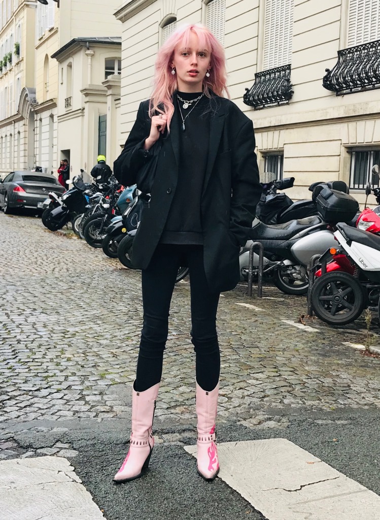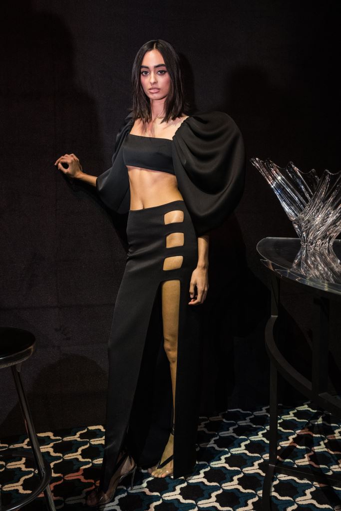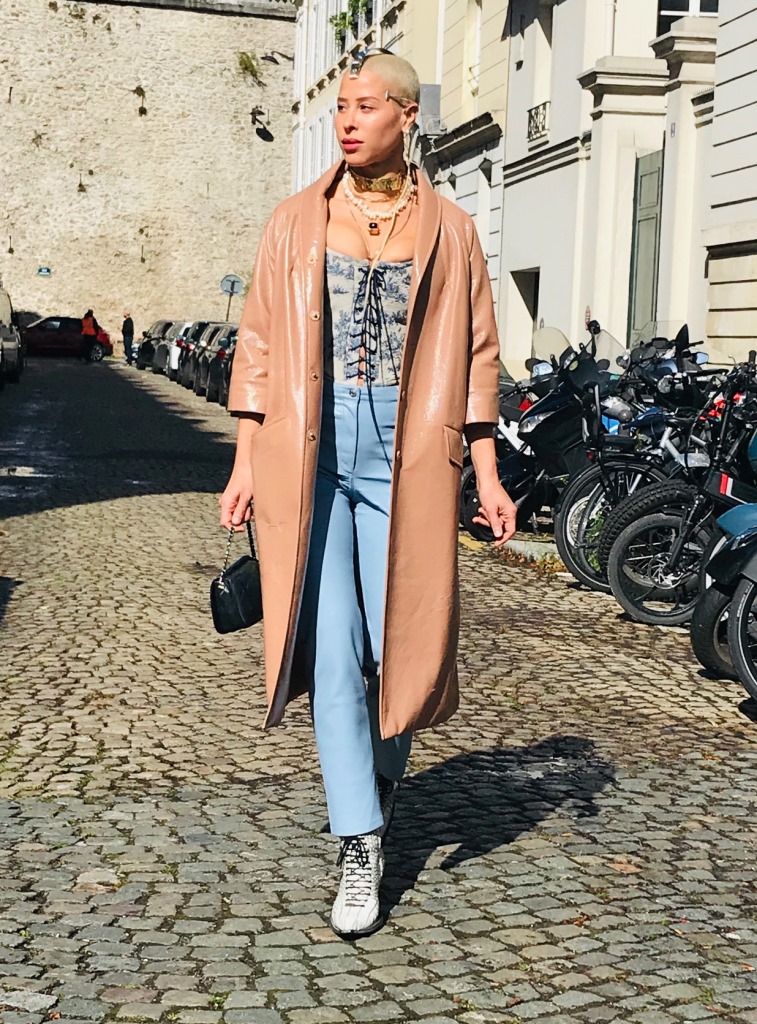 DEFILE RICK OWENS SUR LE PARVIS DU PALAIS DE TOKYO: Le créateur d’origine californienne a retrouvé son lieu de défilé préféré avec en ouverture sa femme Michèle Lamy, magistrale dans une robe en cuir noir pleine de saillies évoquant des carcasses de voitures, avec une cape filet flottant sur ses épaules et de nouvelles cuissardes dragon avec talons en plexiglas et découpe tout le long de la tige. Puis, dans un décor toujours aussi impressionnant avec des machines qui embrument les fontaines et le public en propulsant une épaisse fumée blanche, des mages noirs postés sur les toits qui jettent des feuilles de jasmin dans le vide, les mannequins avancent conquérantes, dans des robes sculpturales abstraites en denim japonais tissé sur des métiers anciens, ou en coton bio certifié GOTS, chaussées de cuissardes compensées de maîtresse dominatrice. Les robes toile d’araignée en mohair, avec des trous mobiles et amovibles, sont surprenantes. Lunettes de science-fiction pour un voyage vers un autre monde. Envoûtant comme toujours!