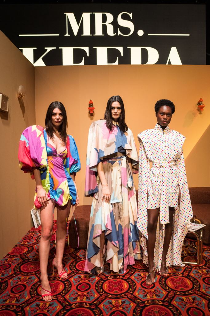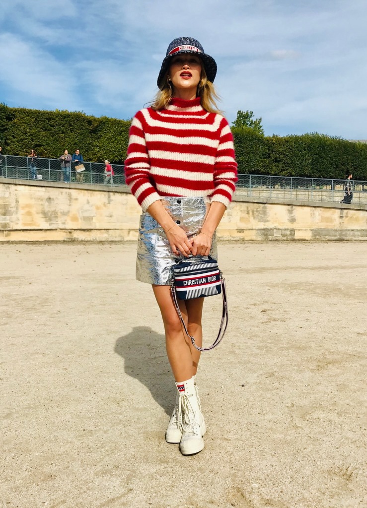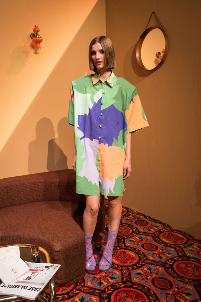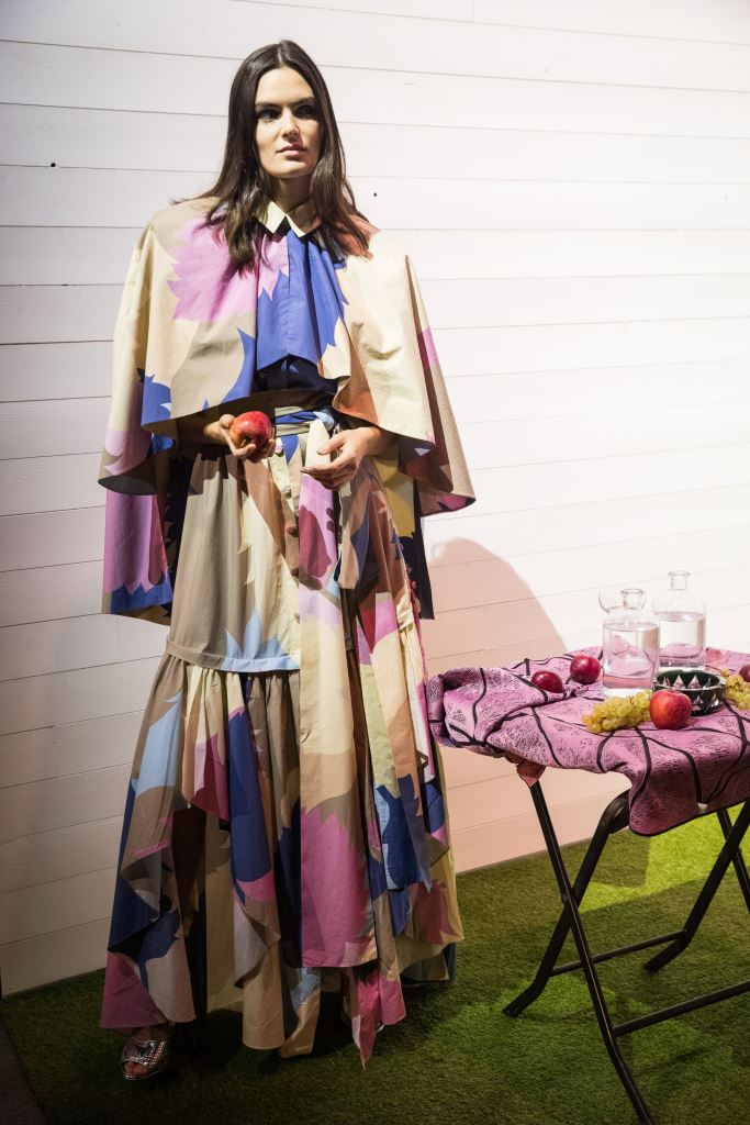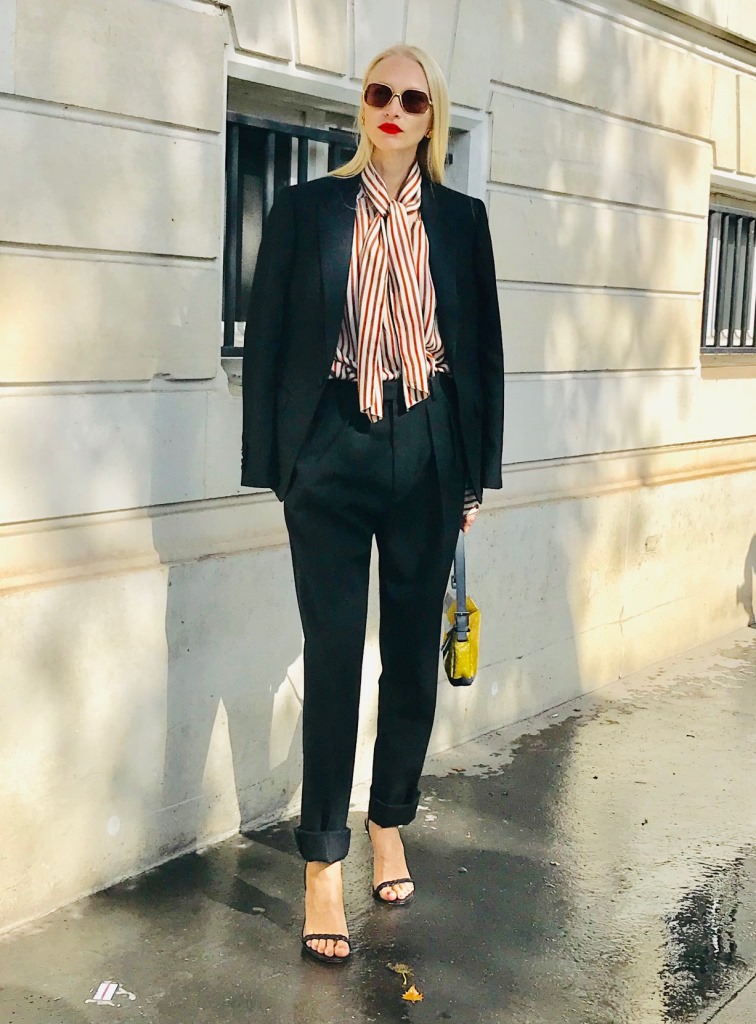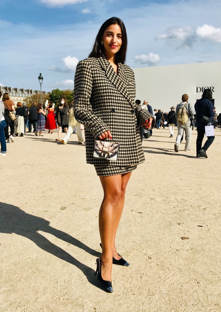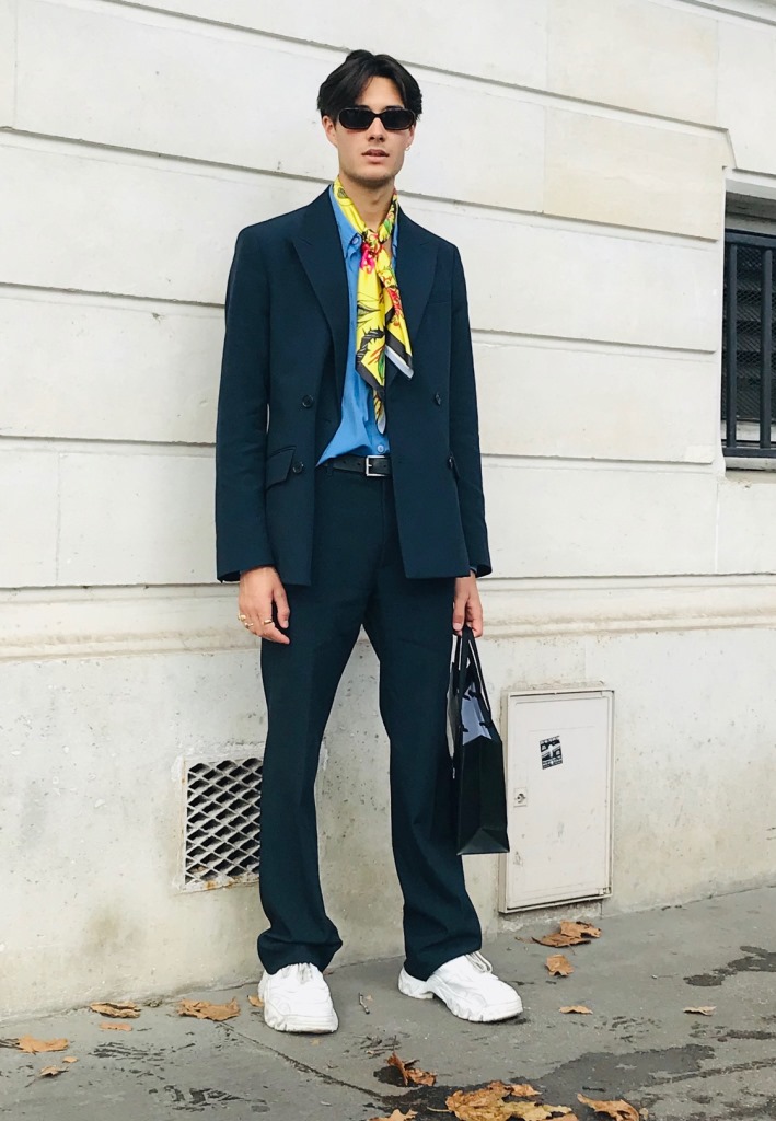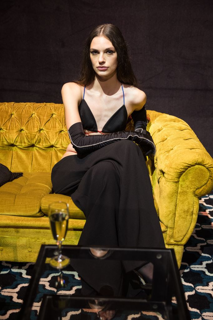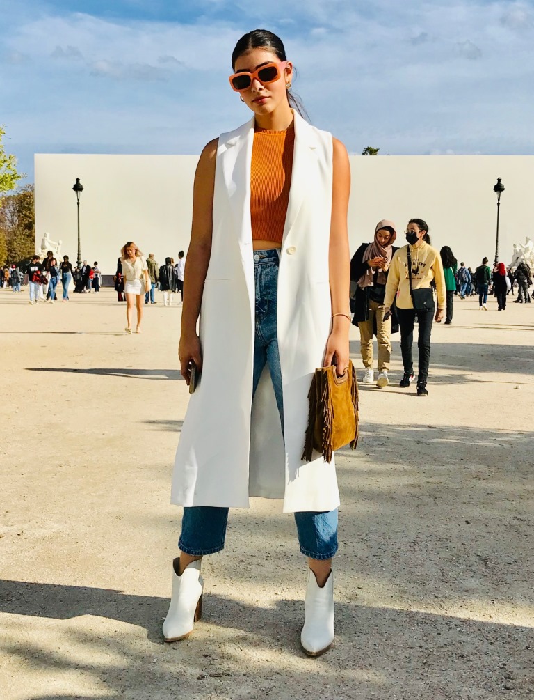 DEFILE RICK OWENS SUR LE PARVIS DU PALAIS DE TOKYO: Le créateur d’origine californienne a retrouvé son lieu de défilé préféré avec en ouverture sa femme Michèle Lamy, magistrale dans une robe en cuir noir pleine de saillies évoquant des carcasses de voitures, avec une cape filet flottant sur ses épaules et de nouvelles cuissardes dragon avec talons en plexiglas et découpe tout le long de la tige. Puis, dans un décor toujours aussi impressionnant avec des machines qui embrument les fontaines et le public en propulsant une épaisse fumée blanche, des mages noirs postés sur les toits qui jettent des feuilles de jasmin dans le vide, les mannequins avancent conquérantes, dans des robes sculpturales abstraites en denim japonais tissé sur des métiers anciens, ou en coton bio certifié GOTS, chaussées de cuissardes compensées de maîtresse dominatrice. Les robes toile d’araignée en mohair, avec des trous mobiles et amovibles, sont surprenantes. Lunettes de science-fiction pour un voyage vers un autre monde. Envoûtant comme toujours!