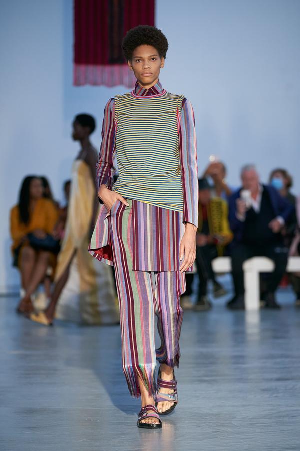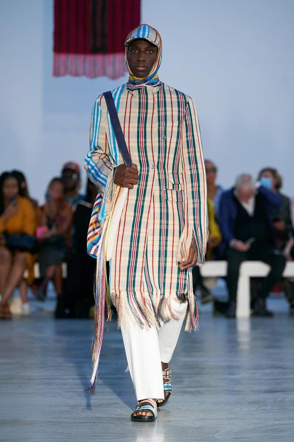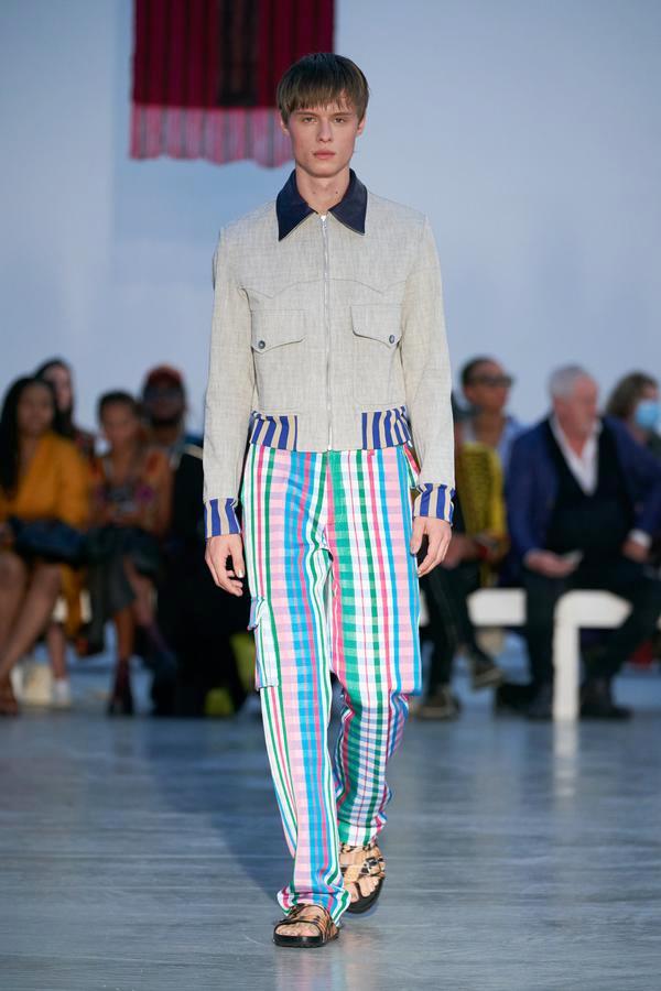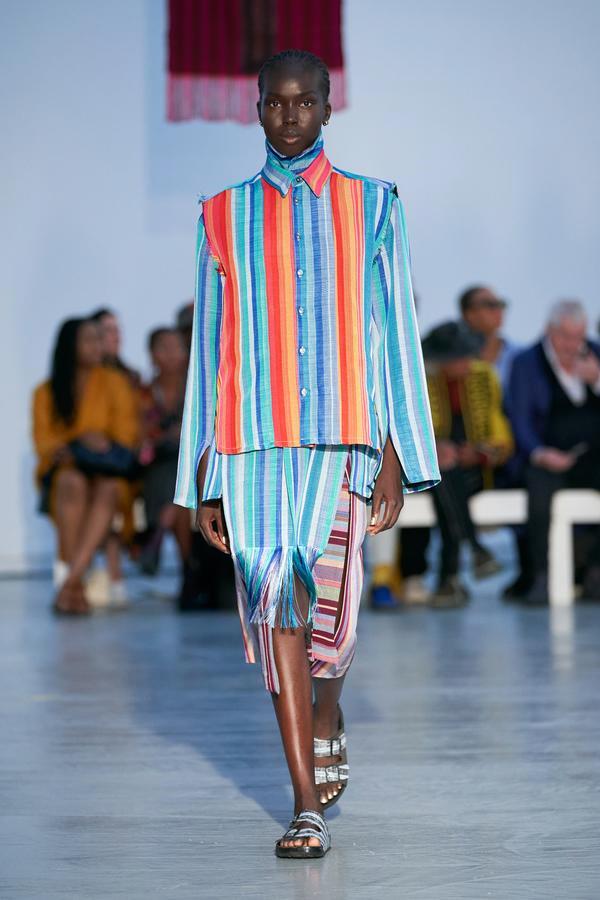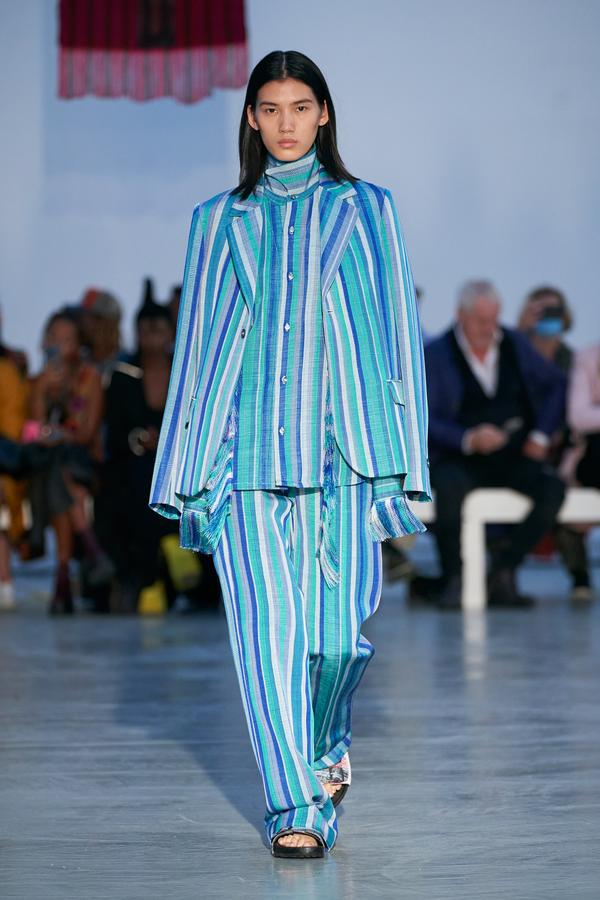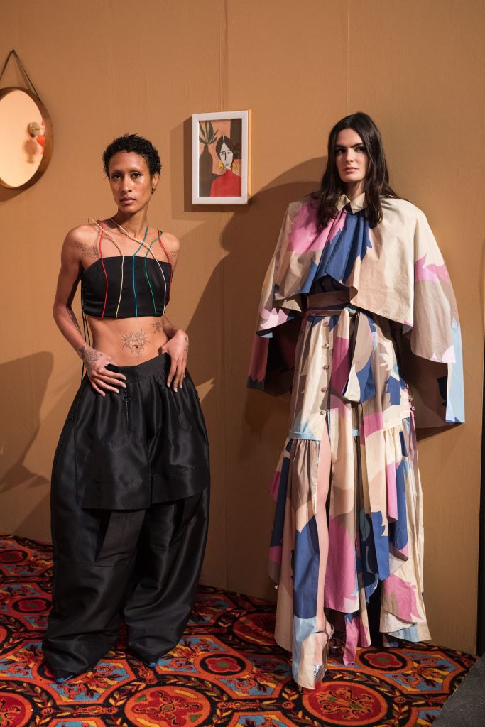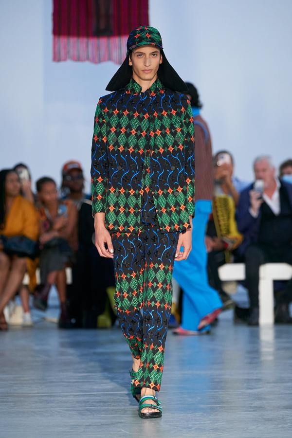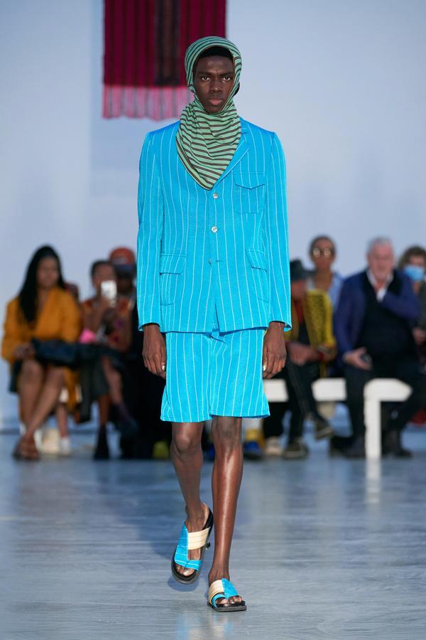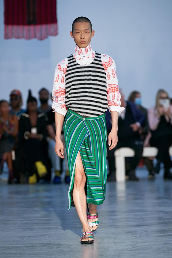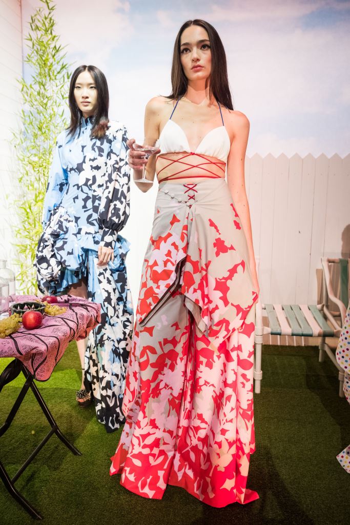 DEFILE RICK OWENS SUR LE PARVIS DU PALAIS DE TOKYO: Le créateur d’origine californienne a retrouvé son lieu de défilé préféré avec en ouverture sa femme Michèle Lamy, magistrale dans une robe en cuir noir pleine de saillies évoquant des carcasses de voitures, avec une cape filet flottant sur ses épaules et de nouvelles cuissardes dragon avec talons en plexiglas et découpe tout le long de la tige. Puis, dans un décor toujours aussi impressionnant avec des machines qui embrument les fontaines et le public en propulsant une épaisse fumée blanche, des mages noirs postés sur les toits qui jettent des feuilles de jasmin dans le vide, les mannequins avancent conquérantes, dans des robes sculpturales abstraites en denim japonais tissé sur des métiers anciens, ou en coton bio certifié GOTS, chaussées de cuissardes compensées de maîtresse dominatrice. Les robes toile d’araignée en mohair, avec des trous mobiles et amovibles, sont surprenantes. Lunettes de science-fiction pour un voyage vers un autre monde. Envoûtant comme toujours!