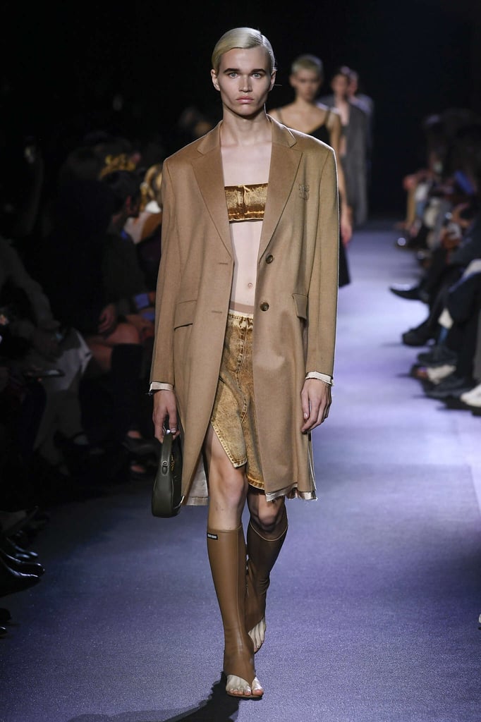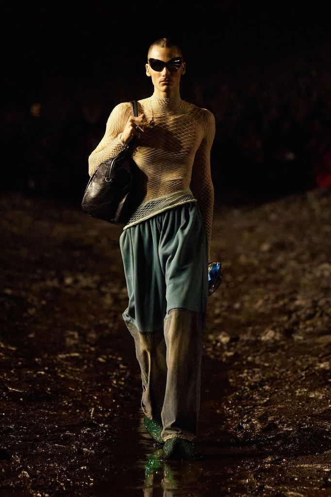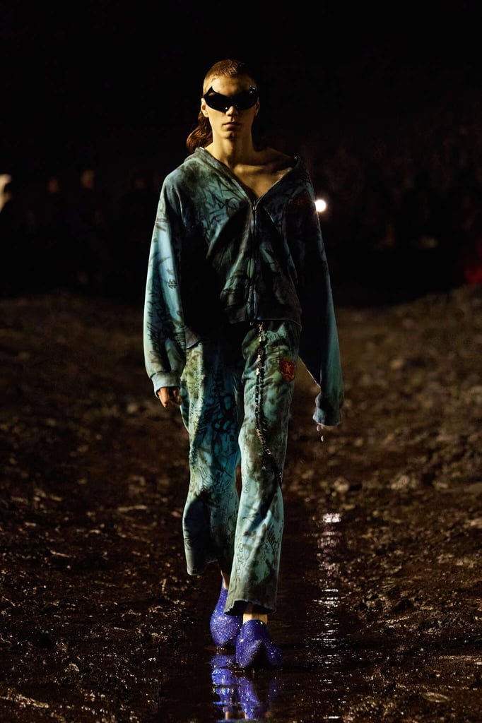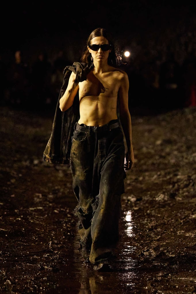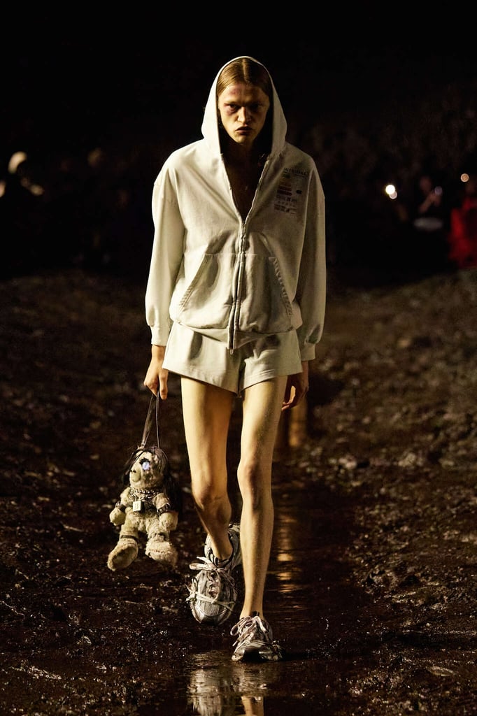 DEFILE BALENCIAGA AU PARC DES EXPOSITIONS DE VILLEPINTE: Le directeur artistique Demna (Gvasalia, qui se fait appeler par son prénom) a proposé une réflexion sur la mode, le luxe et l’état du monde en souhaitant tout de même transmettre une note d’espoir. Il a ainsi fait défiler ses mannequins (hommes et femmes) dans une fosse géante remplie de boue dont il a confié la réalisation à l’artiste Santiago Serra connu pour la radicalité de ses oeuvres, souvent polémiques. Plusieurs mannequins sont munis de porte-bébés contenant des poupées grandeur nature. D’autres portent des ours en peluche abîmés, des perles dans le nez et des bracelets au logo B dans le cou. La plupart des vêtements sont usés, boueux, tachés. Pulls à capuche et jeans baggy crasseux, joggings rapiécés, puis par opposition des robes au dos cape d’une grande pureté, des fourreaux pailletés et aussi des pulls sculptés qui donnent une forme étrange aux corps et des robes brillantes d’inspiration punk. Le maquillage est recherché avec des cornes, des pointes sortant des joues, des perles s’échappant des lèvres. Côté accessoires, un nouveau sac fourre-tout composé d’une manche assortie et d’un fourre-tout enroulé sous le bras. Certains sacs sont associés à des étoles de deux mètres de long ressemblant à des serpents. D’autres mannequins portent des sacs bouffants sur les bras ou des sacs serrés dans les mains.