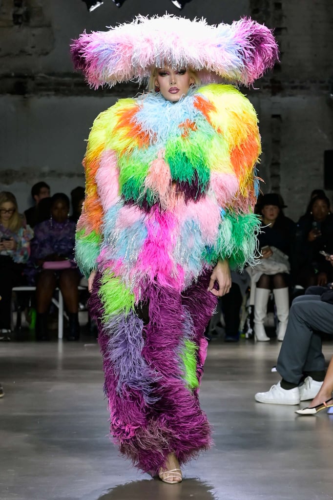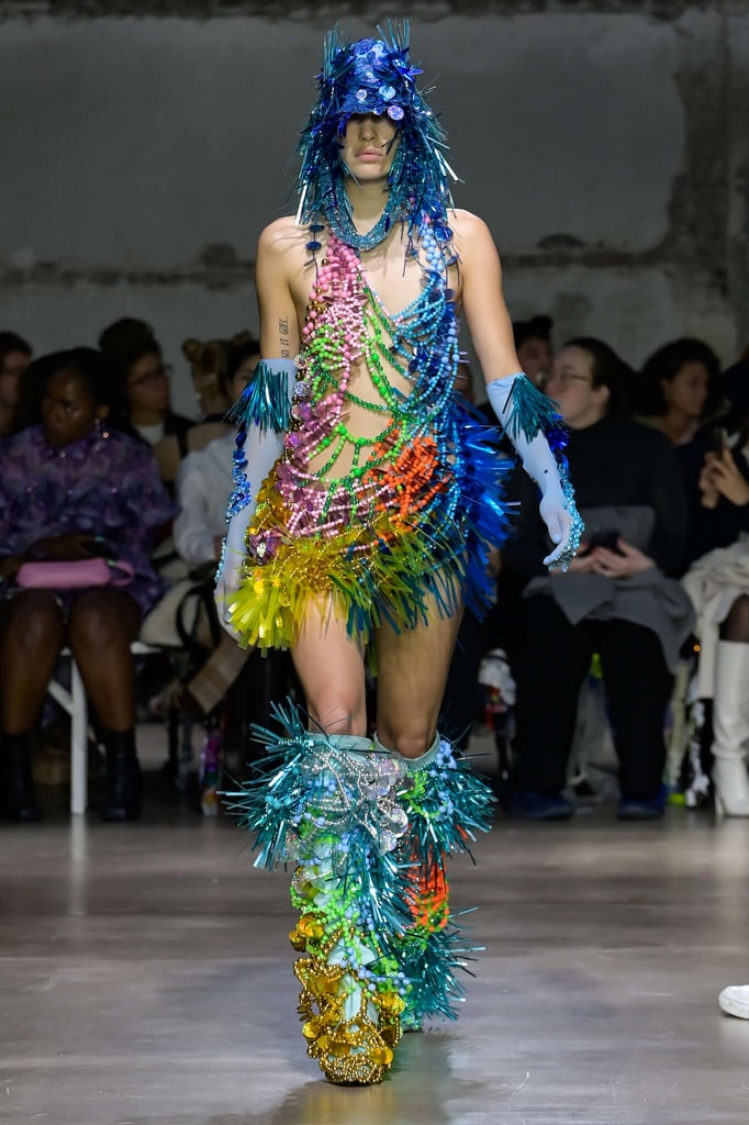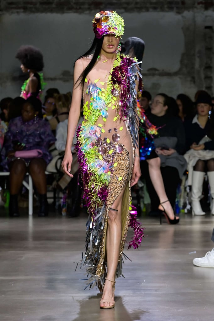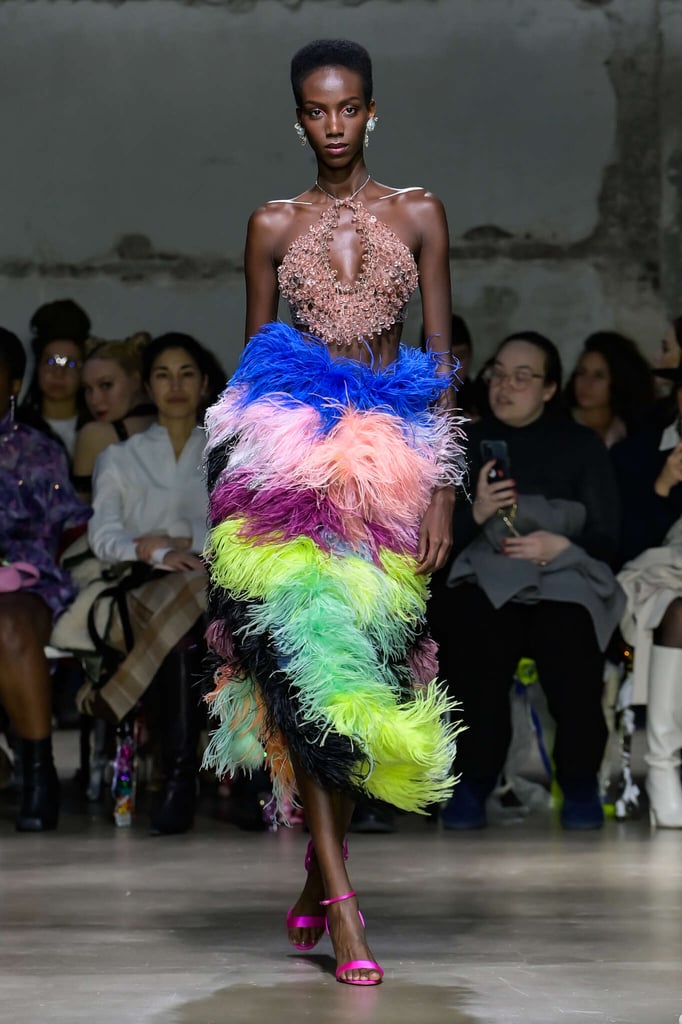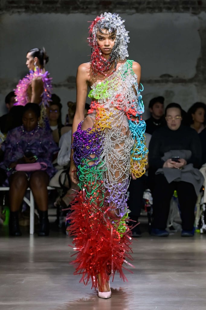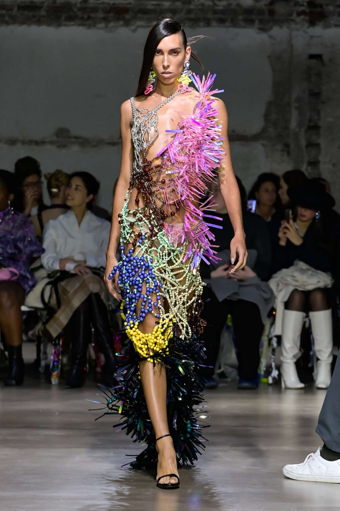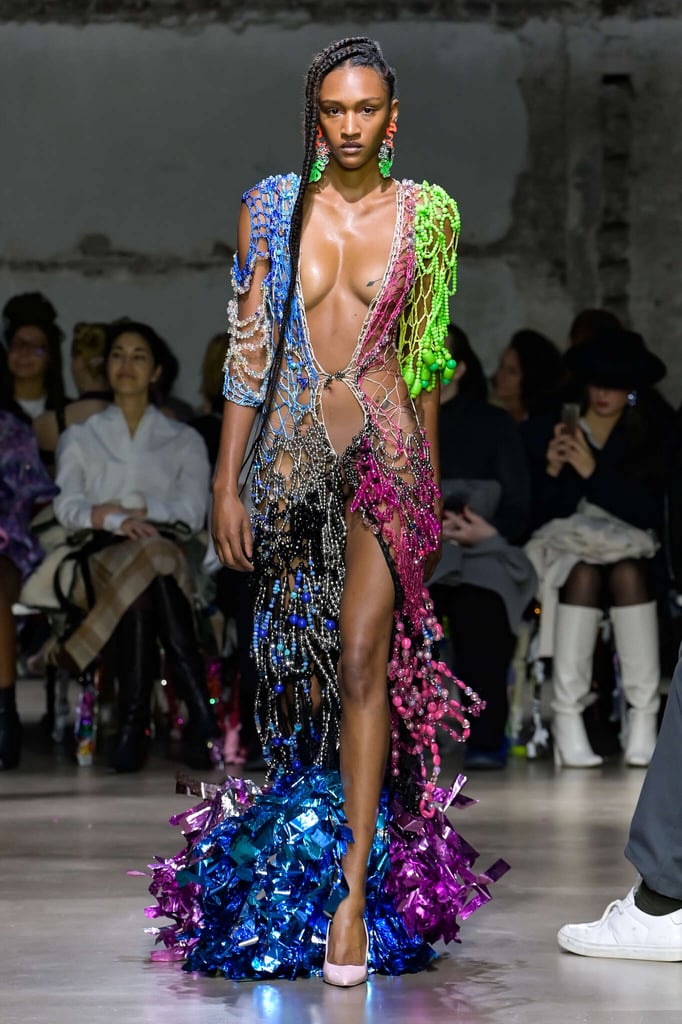 DEFILE GERMANIER AU PALAIS DE TOKYO: Le créateur suisse Kevin Germanier a présenté une collection multicolore exubérante et festive, tout à la fois glamour et éthique. Le fondateur de la marque manie lui-même les ciseaux pour lacérer des chemises et des costumes dont les trous sont ensuite garnis de silicone pailleté. Il redessine les formes sur des tuniques en tulle couleur chair, dont certaines parties sont décorées par une accumulation d’ornements hétéroclites, tandis que d’autres sont laissées nues. Le styliste prend tout ce qui lui tombe sous la main pour confectionner ses tenues féeriques recyclées: plumes, paillettes, strass, franges en papier ou en tissu, pierreries, perles. Ces différents éléments sont agencés selon leurs couleurs et leurs formes, en grandes guirlandes ou en volume. Des robes en résille emprisonnent toutes sortes de décorations comme une toile d’araignée. D’autres robes sont entièrement constituées de colliers en plastique multicolores. De légères plumes d’autruche arc-en-ciel composent une majestueuse capote avec une grande coiffe flottante assortie pour le look final porté impérialement par la drag queen La Grande Dame.