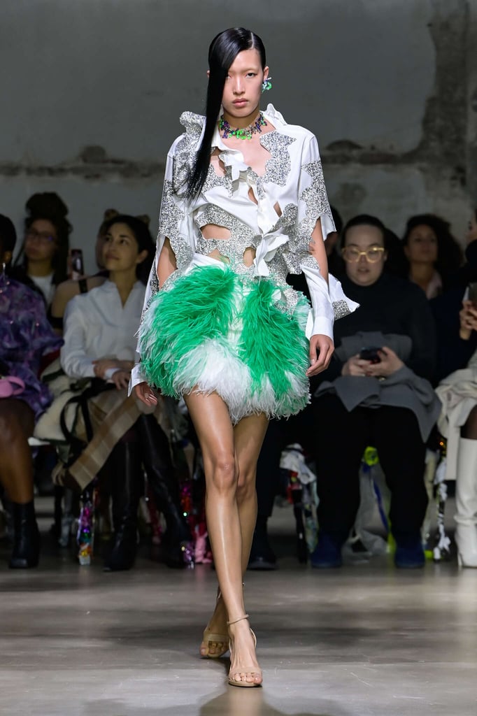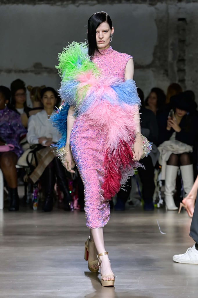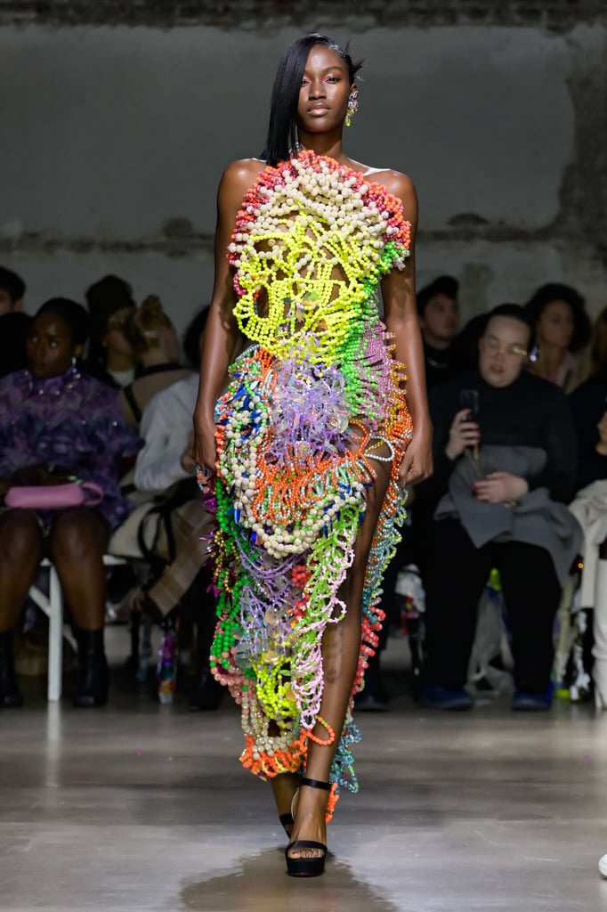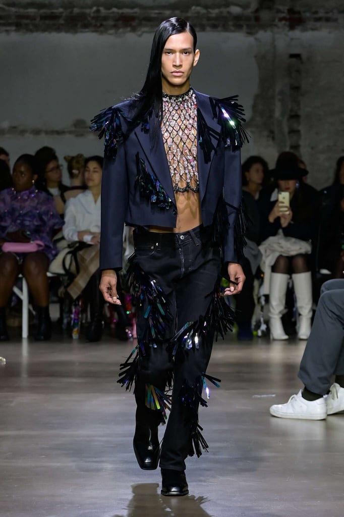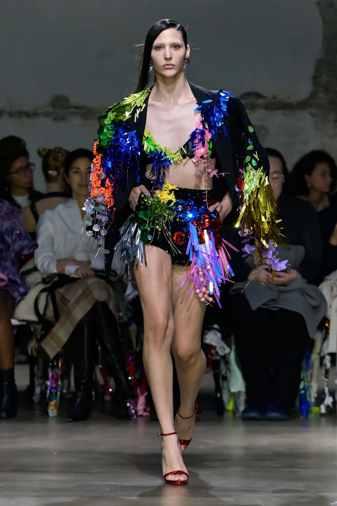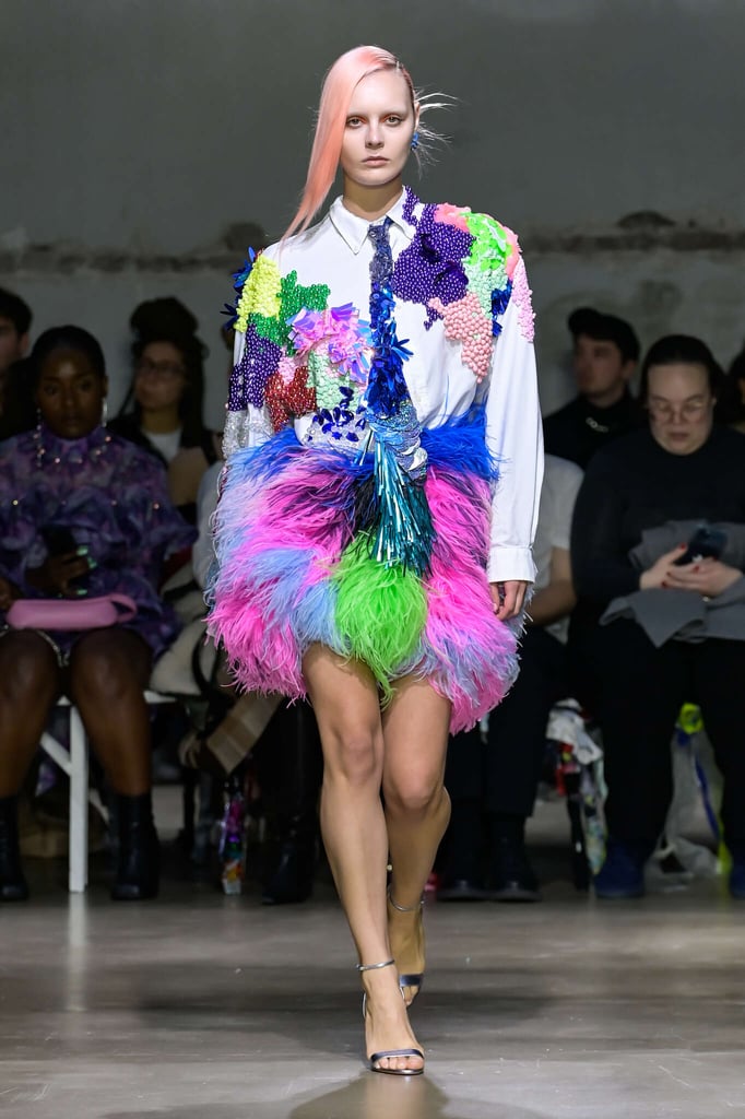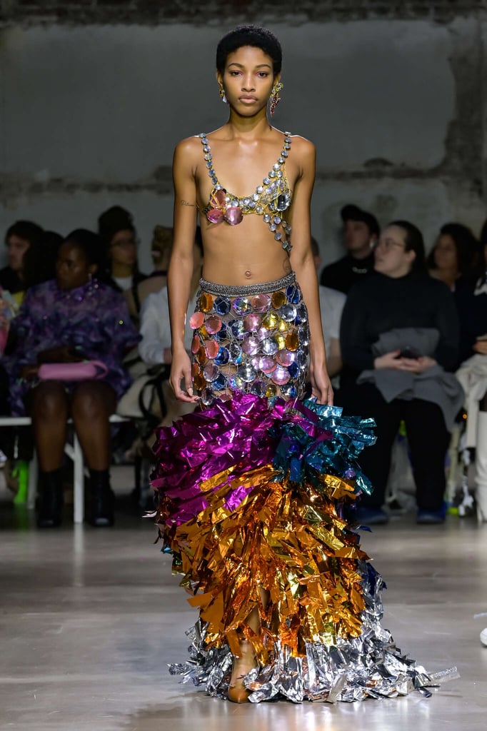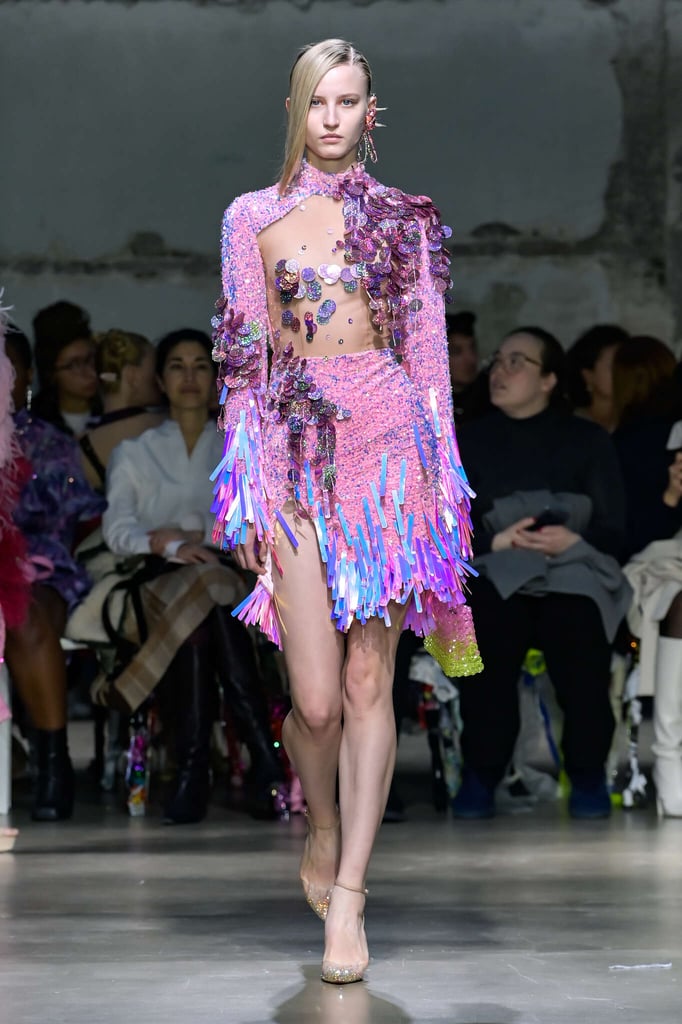 DEFILE GERMANIER AU PALAIS DE TOKYO: Le créateur suisse Kevin Germanier a présenté une collection multicolore exubérante et festive, tout à la fois glamour et éthique. Le fondateur de la marque manie lui-même les ciseaux pour lacérer des chemises et des costumes dont les trous sont ensuite garnis de silicone pailleté. Il redessine les formes sur des tuniques en tulle couleur chair, dont certaines parties sont décorées par une accumulation d’ornements hétéroclites, tandis que d’autres sont laissées nues. Le styliste prend tout ce qui lui tombe sous la main pour confectionner ses tenues féeriques recyclées: plumes, paillettes, strass, franges en papier ou en tissu, pierreries, perles. Ces différents éléments sont agencés selon leurs couleurs et leurs formes, en grandes guirlandes ou en volume. Des robes en résille emprisonnent toutes sortes de décorations comme une toile d’araignée. D’autres robes sont entièrement constituées de colliers en plastique multicolores. De légères plumes d’autruche arc-en-ciel composent une majestueuse capote avec une grande coiffe flottante assortie pour le look final porté impérialement par la drag queen La Grande Dame.