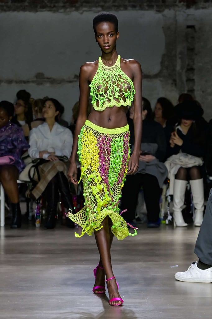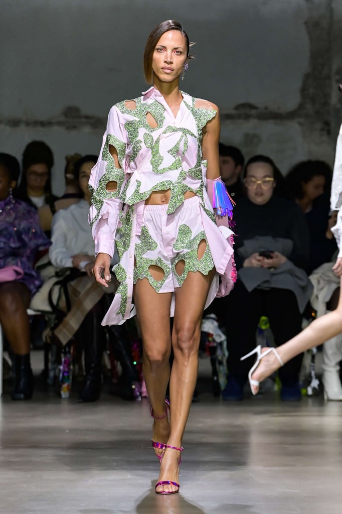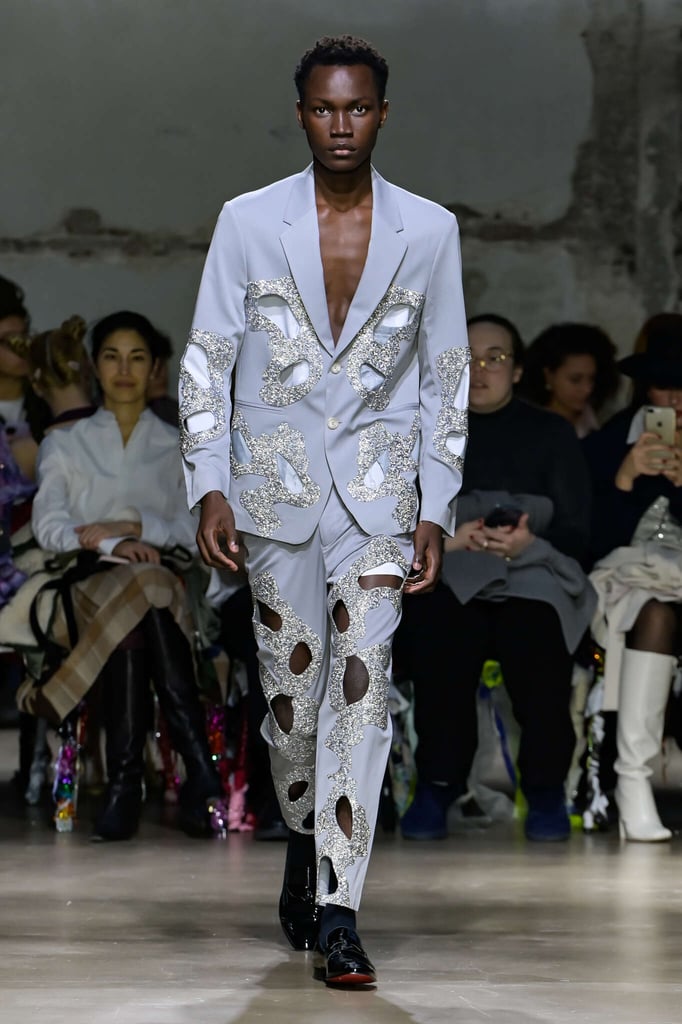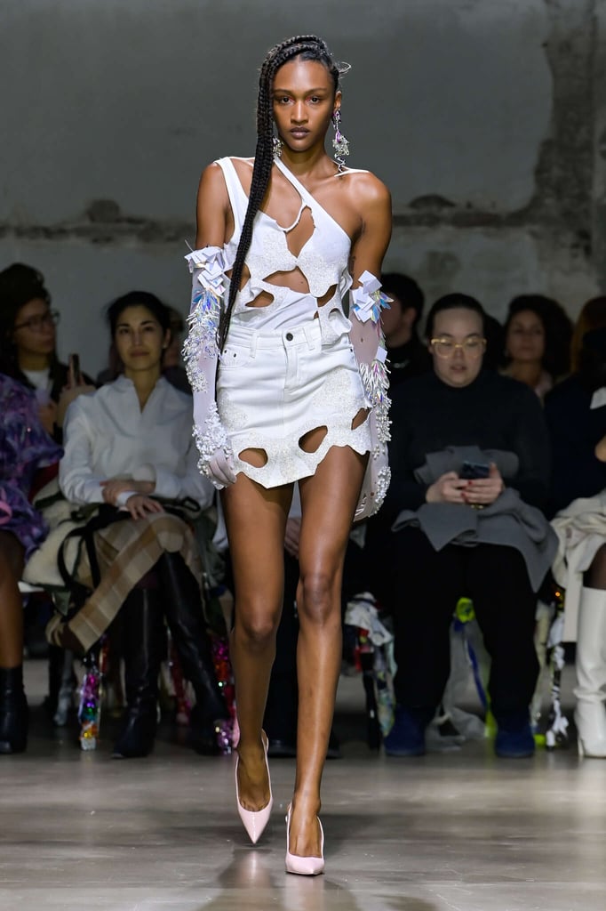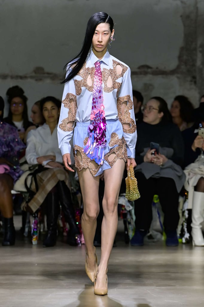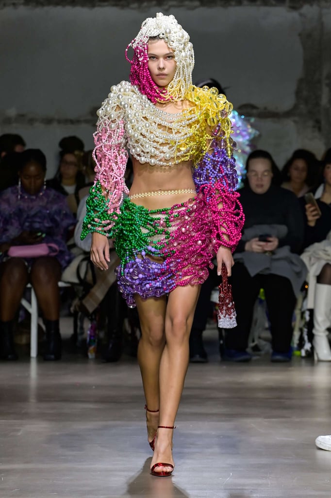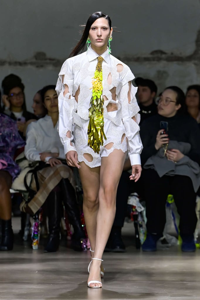 DEFILE GERMANIER AU PALAIS DE TOKYO: Le créateur suisse Kevin Germanier a présenté une collection multicolore exubérante et festive, tout à la fois glamour et éthique. Le fondateur de la marque manie lui-même les ciseaux pour lacérer des chemises et des costumes dont les trous sont ensuite garnis de silicone pailleté. Il redessine les formes sur des tuniques en tulle couleur chair, dont certaines parties sont décorées par une accumulation d’ornements hétéroclites, tandis que d’autres sont laissées nues. Le styliste prend tout ce qui lui tombe sous la main pour confectionner ses tenues féeriques recyclées: plumes, paillettes, strass, franges en papier ou en tissu, pierreries, perles. Ces différents éléments sont agencés selon leurs couleurs et leurs formes, en grandes guirlandes ou en volume. Des robes en résille emprisonnent toutes sortes de décorations comme une toile d’araignée. D’autres robes sont entièrement constituées de colliers en plastique multicolores. De légères plumes d’autruche arc-en-ciel composent une majestueuse capote avec une grande coiffe flottante assortie pour le look final porté impérialement par la drag queen La Grande Dame.