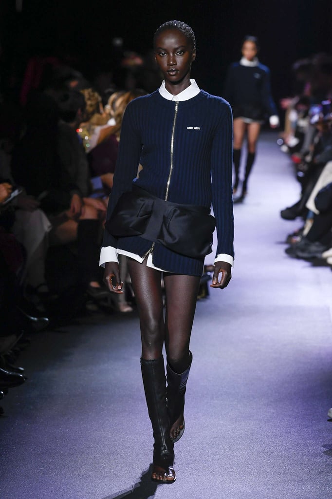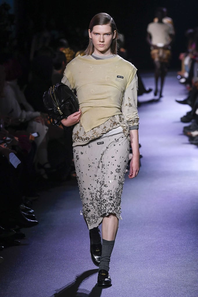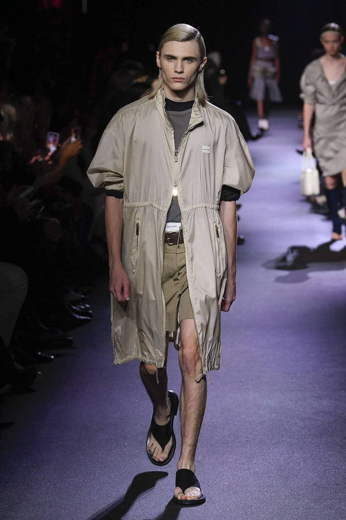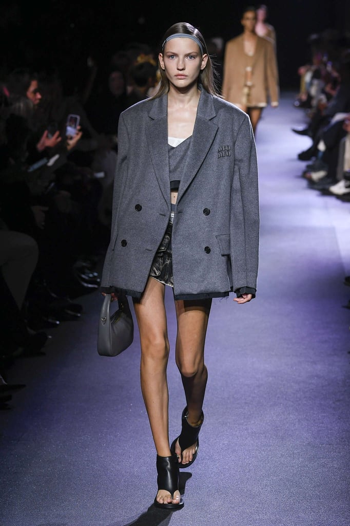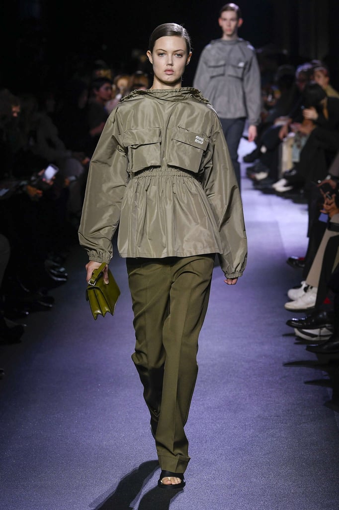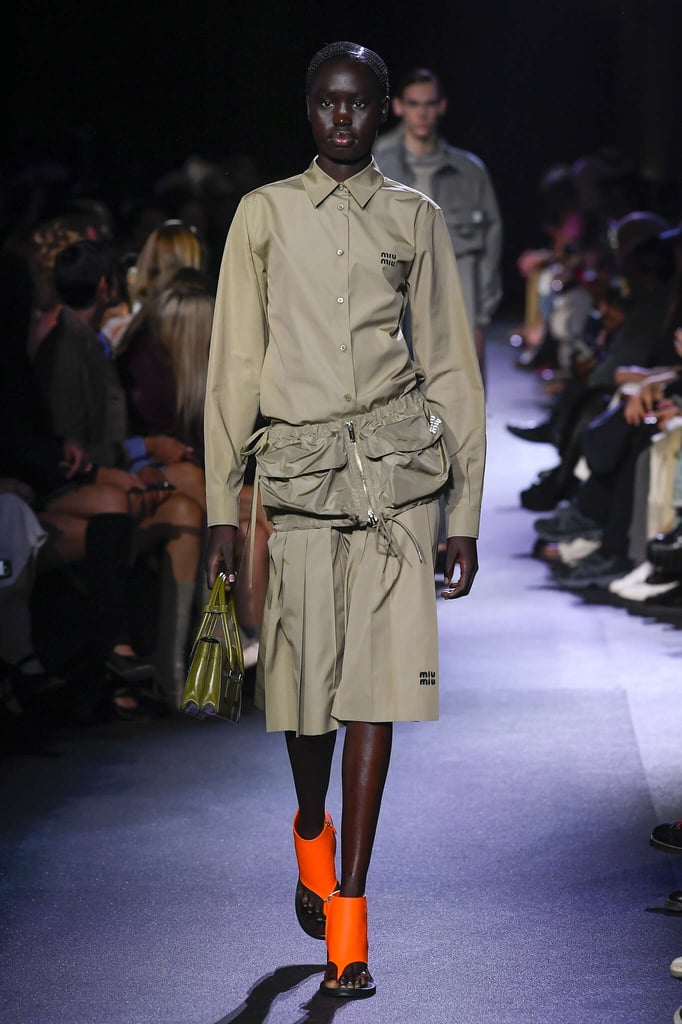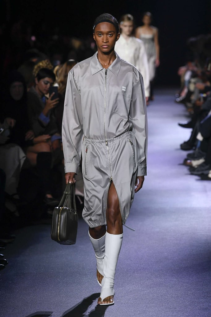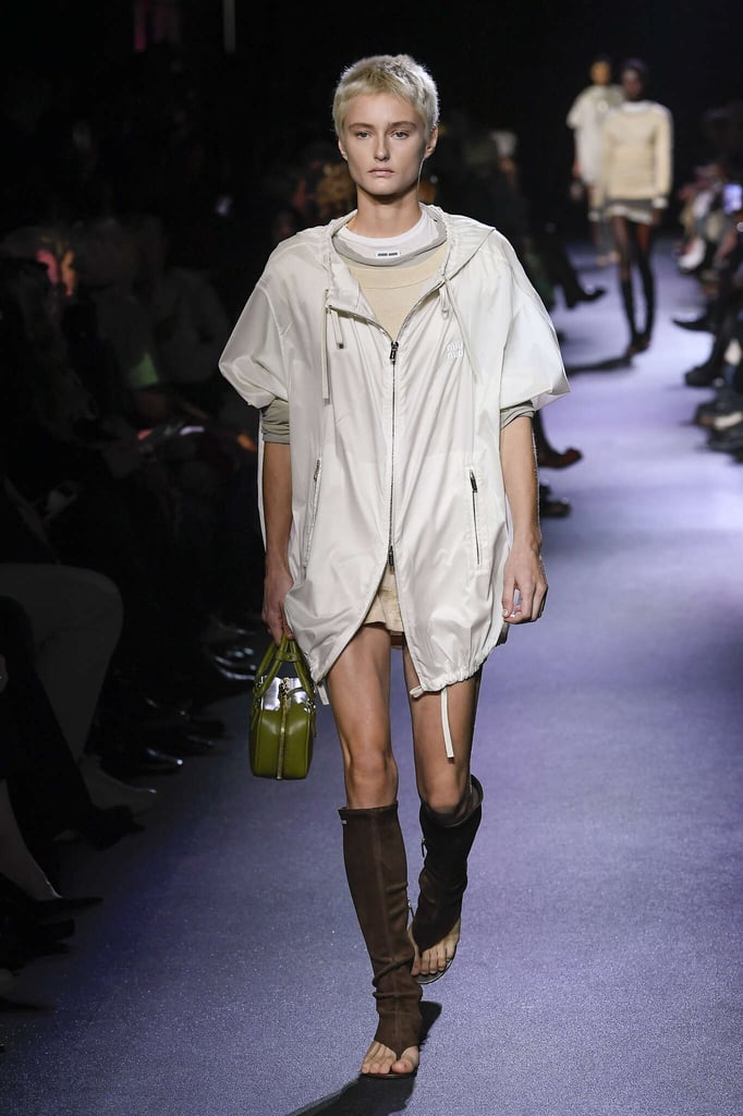 DEFILE MIU MIU AU PALAIS IENA: Afin de s’inscrire pleinement dans le contexte actuel Miuccia Prada a imaginé une garde-robe fonctionnelle, tout à la fois facile et spéciale, sport et chic. Elle part de ses pièces les plus classiques (veste, manteau, chemise, jupe plissée, mailles) qu’elle mélange et revisite avec subtilité. La silhouette se construit en toute simplicité à partir d’une stratification de tee-shirts blancs et gris superposés à des tricots en maille très fine beige ou gris clair. La veste d’homme s’enfile sur une brassière et une jupe à plis ou portefeuille dans des flanelles grises et des laines noires. Le nylon emblématique de la maison est décliné en blanc sur des chemises, jupes et petites robes zippées sur le devant ou dans le dos, ou sur des robes à bretelles froncées dans le décolleté; il se retrouve aussi en coupe-vent sur des modèles dotés de col de chemise ou en version kaki portés à l’envers pour un effet blouse. Le cuir est également très présent: d’abord par petites touches sur des sur-jupes agrémentées de grosses poches plaquées comme un sac banane, puis sous forme de vieux cuir usé sur des grands manteaux, gilets et vestons eux aussi garnis de maxi-poches. Un cuir lisse et plus léger apparaît sur des chemises, jupes, pantalons et shorts de différentes couleurs. D’autres pièces sont taillées dans du denim délavé pour lui donner cette même usure du cuir. Pour le soir, de la légèreté avec des transparences parfois illuminées de pierres et de cristaux.