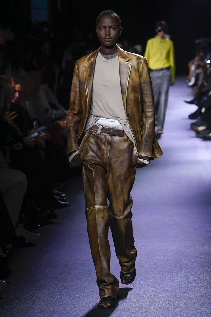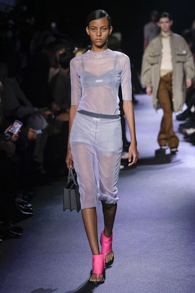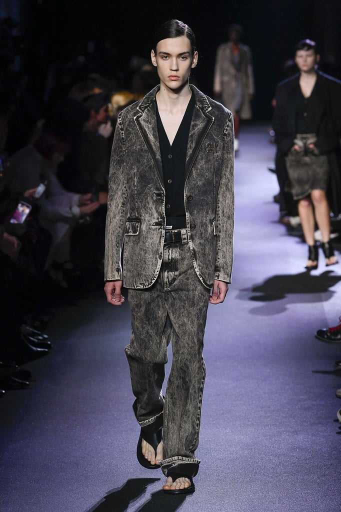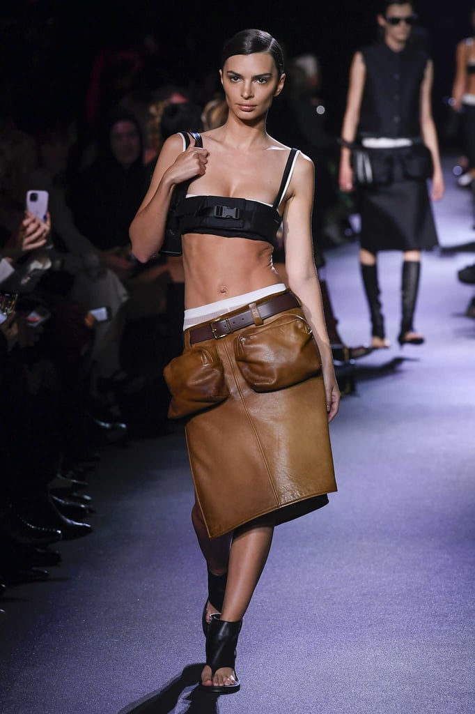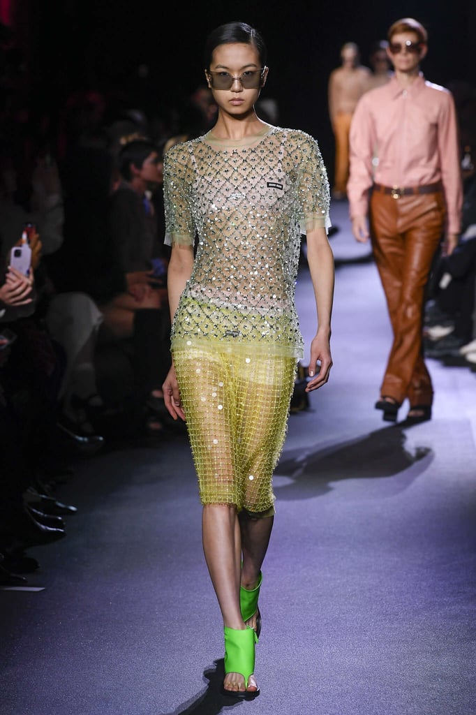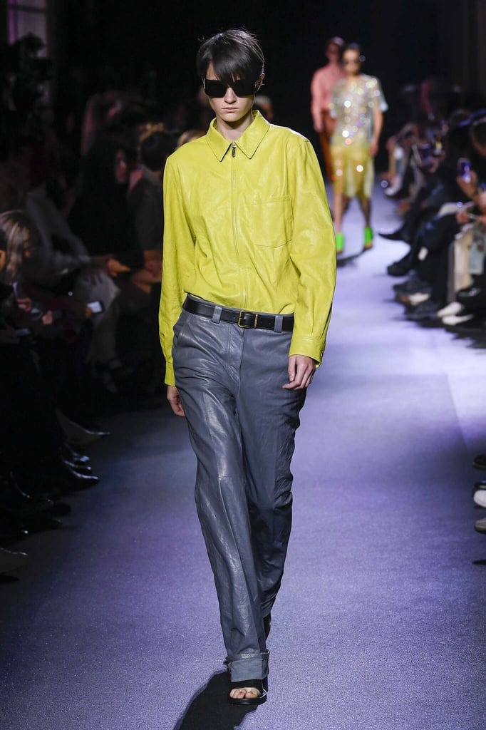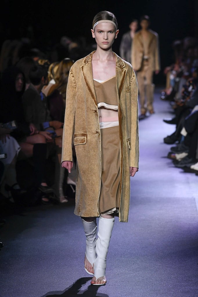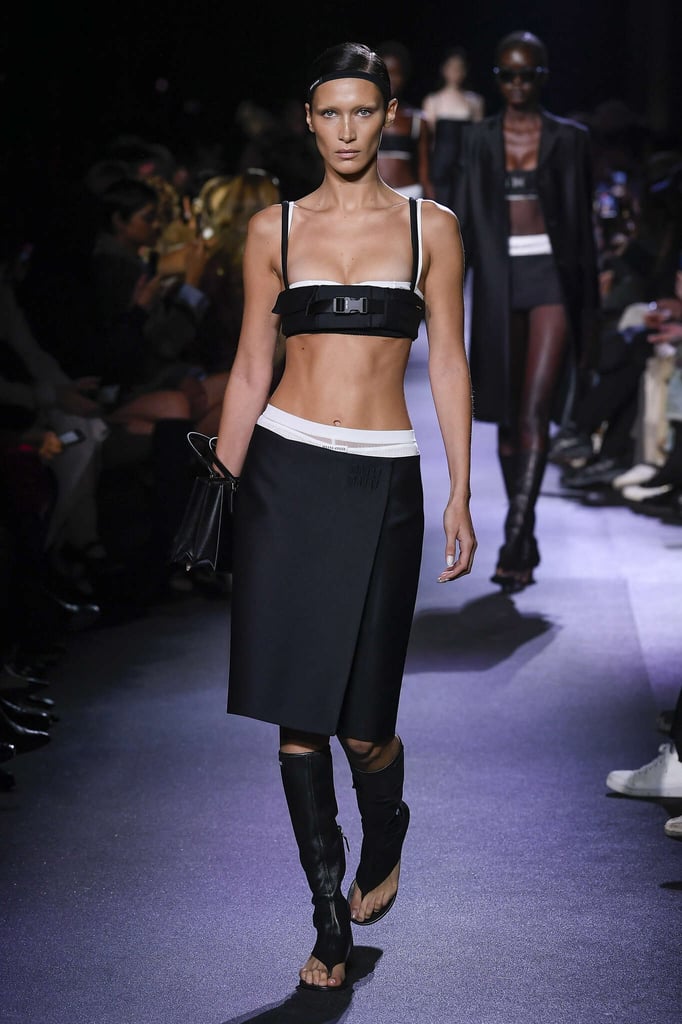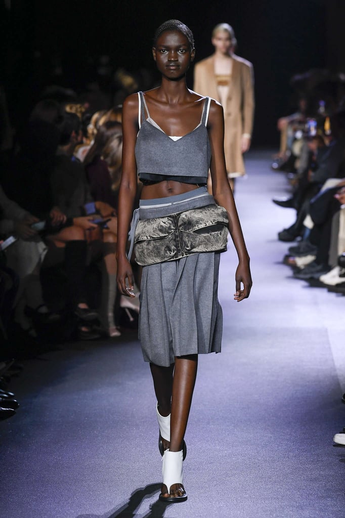 DEFILE MIU MIU AU PALAIS IENA: Afin de s’inscrire pleinement dans le contexte actuel Miuccia Prada a imaginé une garde-robe fonctionnelle, tout à la fois facile et spéciale, sport et chic. Elle part de ses pièces les plus classiques (veste, manteau, chemise, jupe plissée, mailles) qu’elle mélange et revisite avec subtilité. La silhouette se construit en toute simplicité à partir d’une stratification de tee-shirts blancs et gris superposés à des tricots en maille très fine beige ou gris clair. La veste d’homme s’enfile sur une brassière et une jupe à plis ou portefeuille dans des flanelles grises et des laines noires. Le nylon emblématique de la maison est décliné en blanc sur des chemises, jupes et petites robes zippées sur le devant ou dans le dos, ou sur des robes à bretelles froncées dans le décolleté; il se retrouve aussi en coupe-vent sur des modèles dotés de col de chemise ou en version kaki portés à l’envers pour un effet blouse. Le cuir est également très présent: d’abord par petites touches sur des sur-jupes agrémentées de grosses poches plaquées comme un sac banane, puis sous forme de vieux cuir usé sur des grands manteaux, gilets et vestons eux aussi garnis de maxi-poches. Un cuir lisse et plus léger apparaît sur des chemises, jupes, pantalons et shorts de différentes couleurs. D’autres pièces sont taillées dans du denim délavé pour lui donner cette même usure du cuir. Pour le soir, de la légèreté avec des transparences parfois illuminées de pierres et de cristaux.