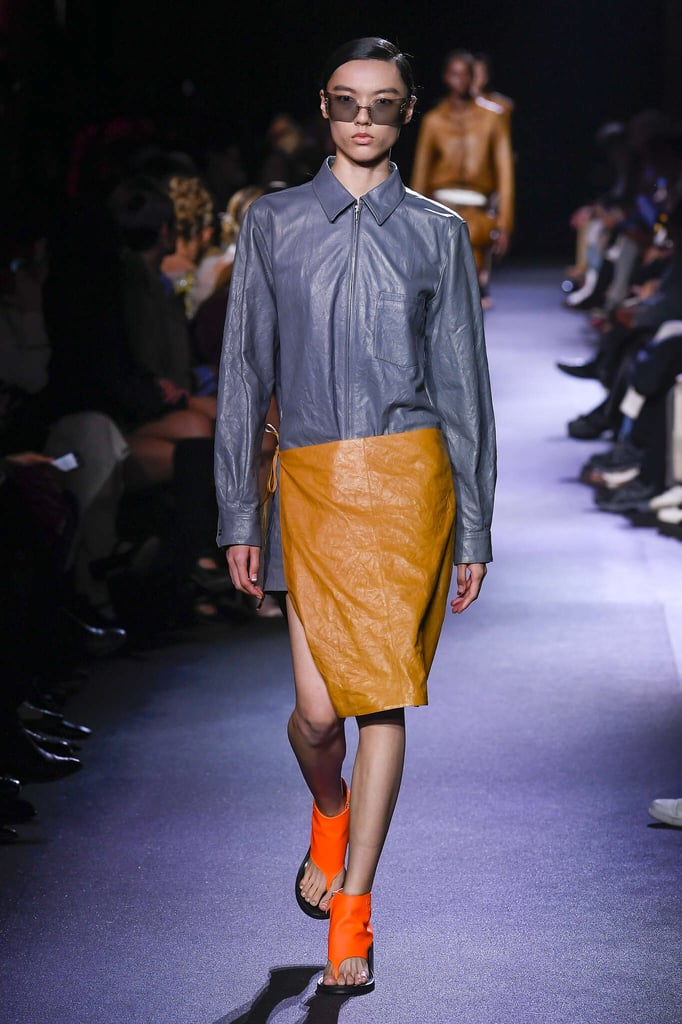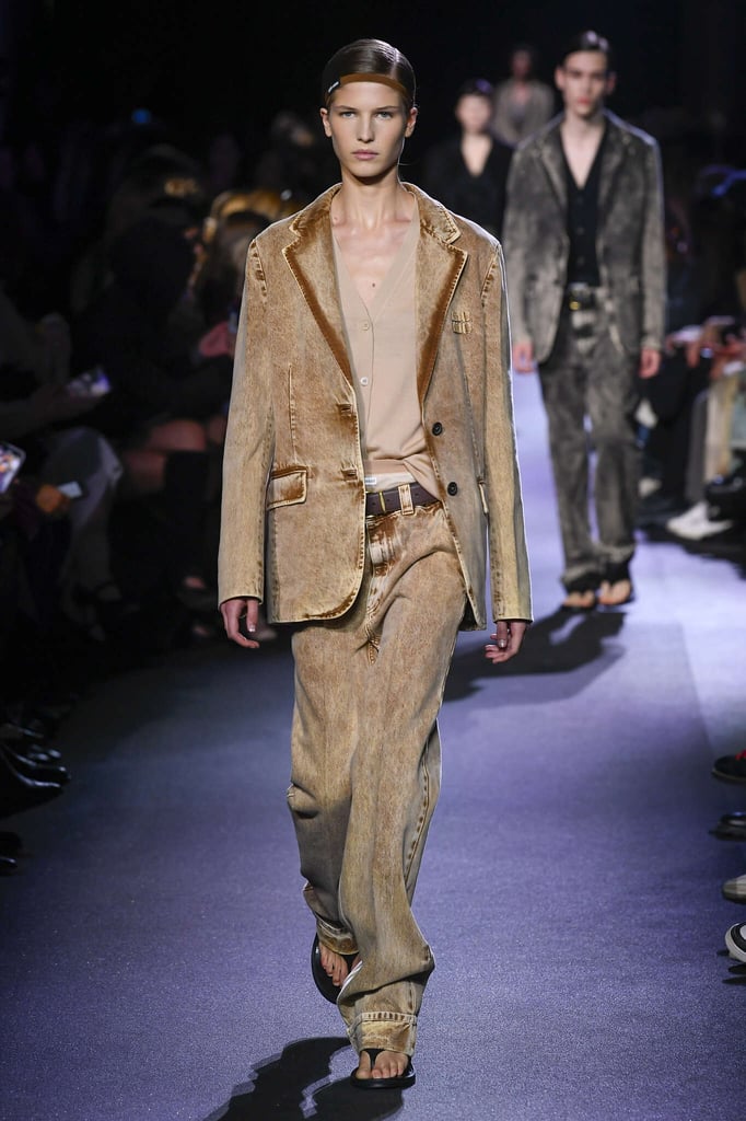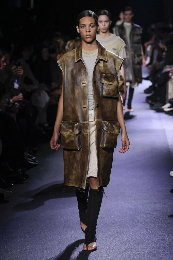 DEFILE HERMES AU TENNIS CLUB DE PARIS: Nadège Vanhée-Cybulski, directrice artistique des collections femme d’Hermès, propose une collection qui incarne « la liberté, la sensualité, la conscience de son corps ». Dans un décor reproduisant une dune de sable éclairée par des lumières rosées elle imagine une rave party en plein désert. Les mannequins s’élancent dans des tenues simples et pratiques aux couleurs de la terre (beige, orangé, brun, caramel). Elles sont comme suspendues en apesanteur sur des chaussures rehaussées d’une semelle vide réalisée dans une plaque carbone, qui leur donne une sensation de légèreté et de flottement. Manteaux, shorts à taille haute, pantalons, cape à capuche, parkas, blousons, trenchs: la garde-robe, taillée dans différentes peaux du veau lisse au cuir d’agneau en passant par le veau velours double face à effet suédé, et dans de robustes toiles techniques déperlantes, est composée de vêtements utilitaires dans un esprit randonnée. Le gilet en cuir intègre dans son dos un sac-à-dos, les emmanchures des débardeurs sont très larges comme celles des maillots de sport, les poches sont ornées d’une boucle métallique rappelant l’univers de l’escalade, tout comme ces cordons nautiques ou de rappel. Ils sont parfois noués à la taille en ceinture, ou bien ils s’enfilent dans des oeillets métalliques, bordant les jambes d’une combinaison pantalon terre de Sienne, ou dans des attaches en tissu pour composer une longue robe à étages à partir de trois pans de coton blanc ou de soie colorée. Pour la fête, de belles robes où le jersey de soie glisse sur le corps et dévoile une épaule, ou un ensemble en cuir brillant noir ajouré façon filet qui crée un jeu d’ombres sur l’épiderme.