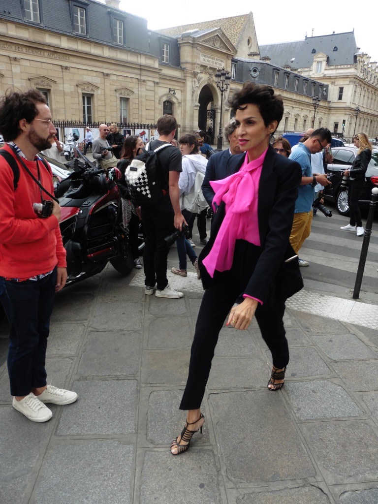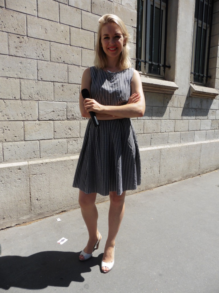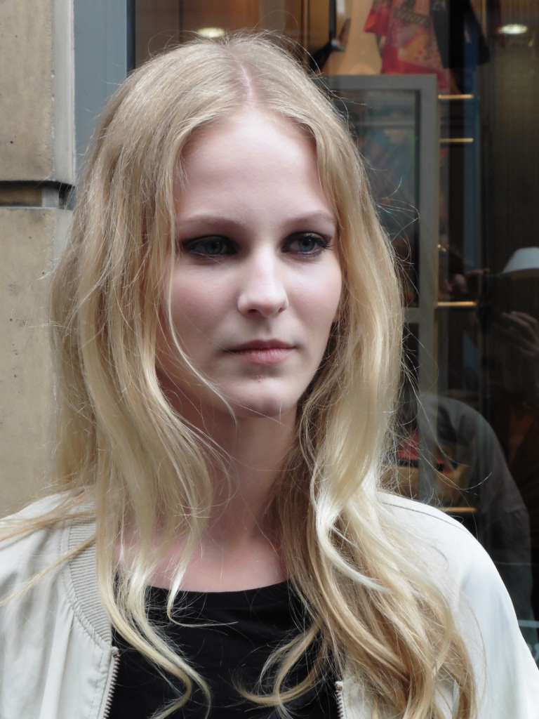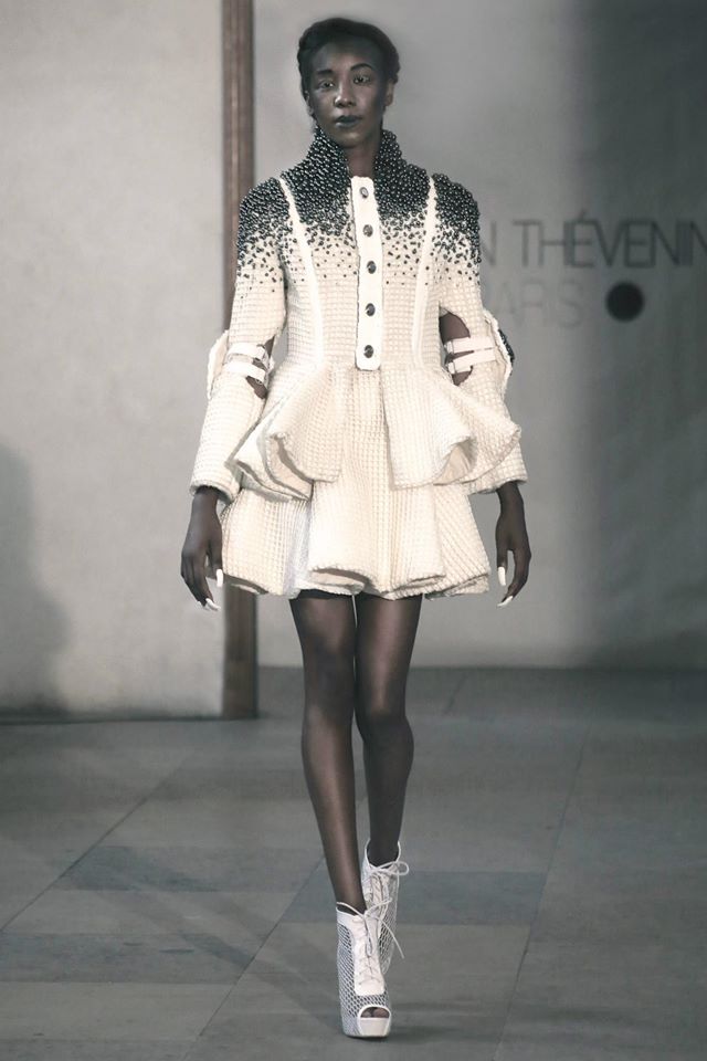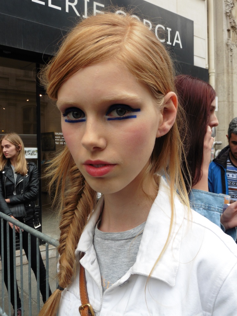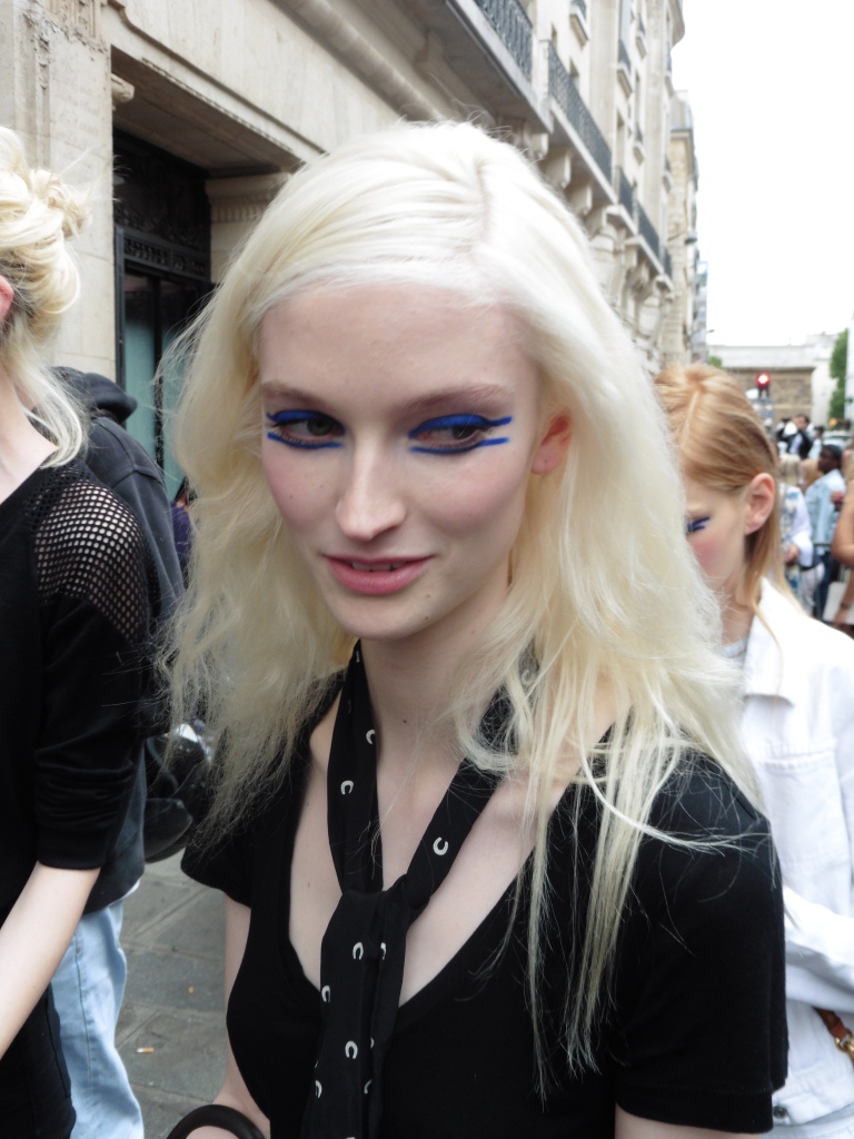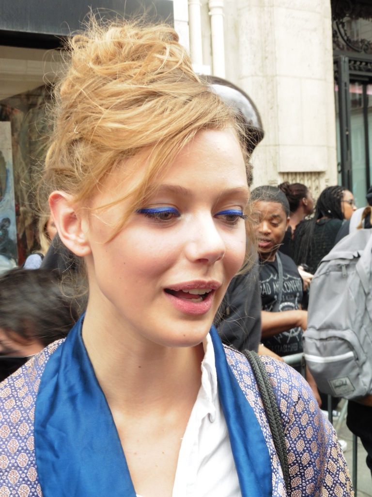 Défilé Coppélia Pique à la Salle des Colonnes (Eglise Saint-Eustache): la créatrice Axelle Migé nous propose une collection « La toile de Louise », inspirée de la vie et de l’oeuvre de l’artiste Louise Bourgeois, laquelle avait dû affronter un conflit familial avec son père désireux d’avoir un fils. Axelle Migé nous présente ainsi une femme libre et rebelle, sensuelle et androgyne. Blanc dominant, relevé par du bleu et du rouge. Motifs géométriques sur certaines silhouettes.Robes aux larges volumes, manteaux imposants et majestueux.