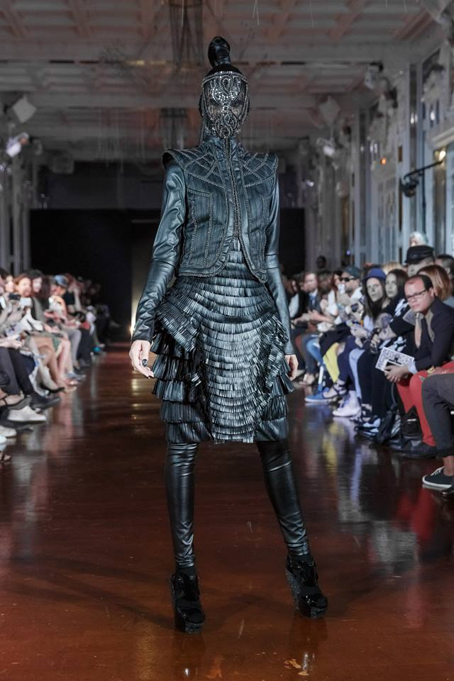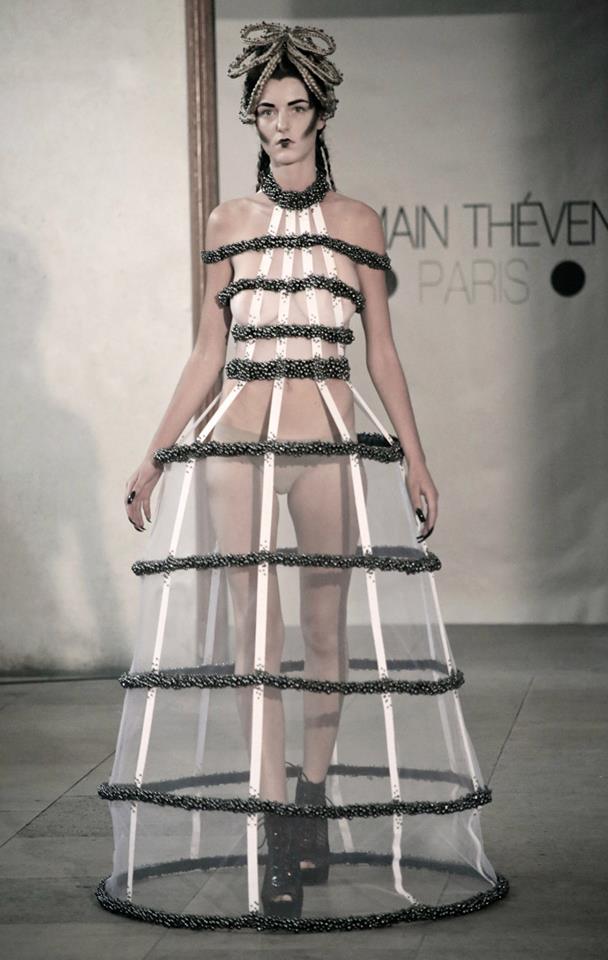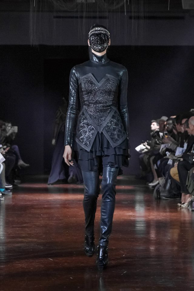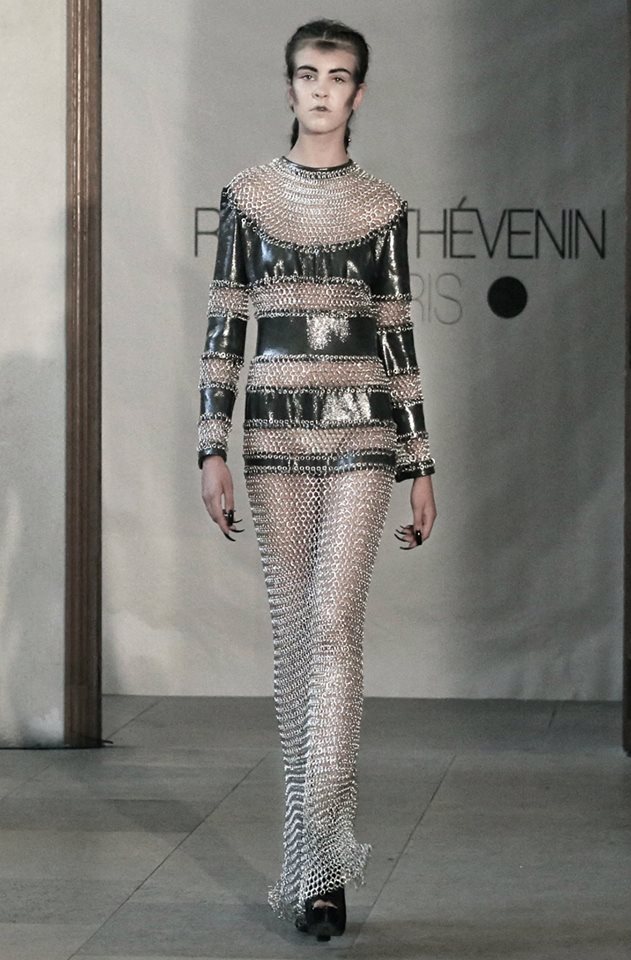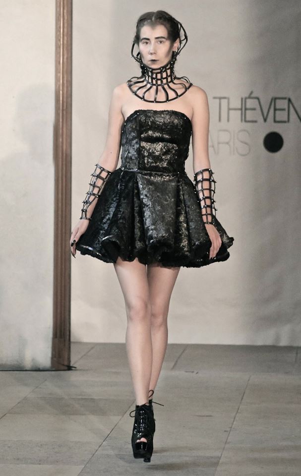 Défilé Zvonko Markovic dans la Nef du Palais Brongniart: premier défilé officiel à Paris pour le couturier serbe, qui présente une collection intitulée » Midnight Butterfly » et qui vise à célébrer le voyage de la chenille se transformant en papillon de nuit. Cela se traduit par des mélanges de soie déchirée, crêpe georgette, tulle de soie, satin, dentelle… et de cuir et peaux d’Anaconda. Chaque partie de ce périple est figurée dans des tons noir, or, noisette et bronze. Il en ressort une femme séduisante, sûre d’elle, résolument moderne.