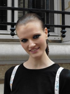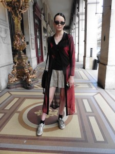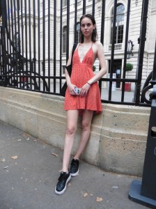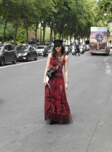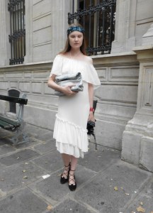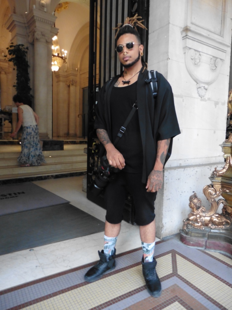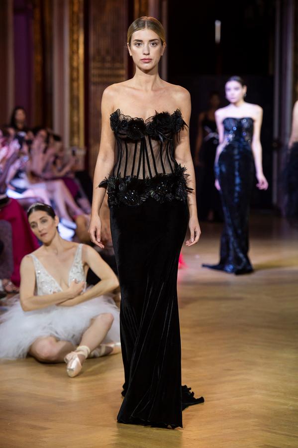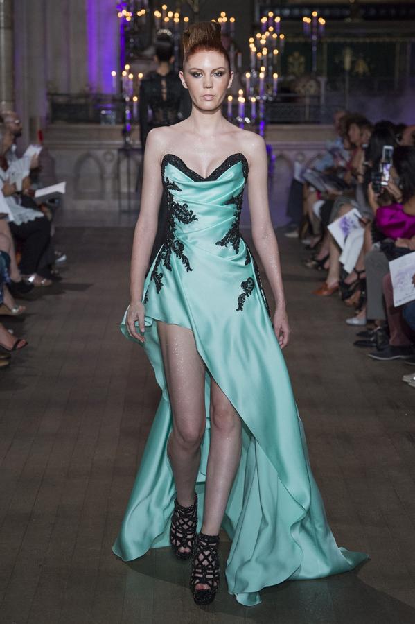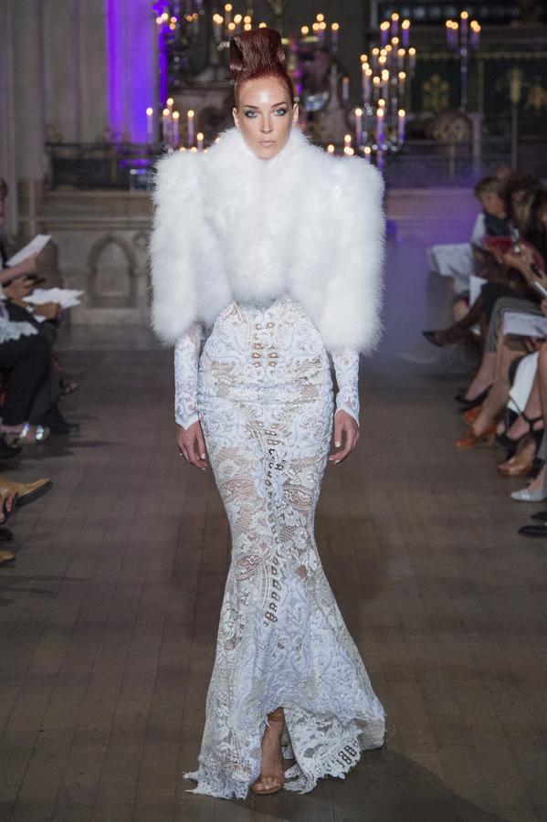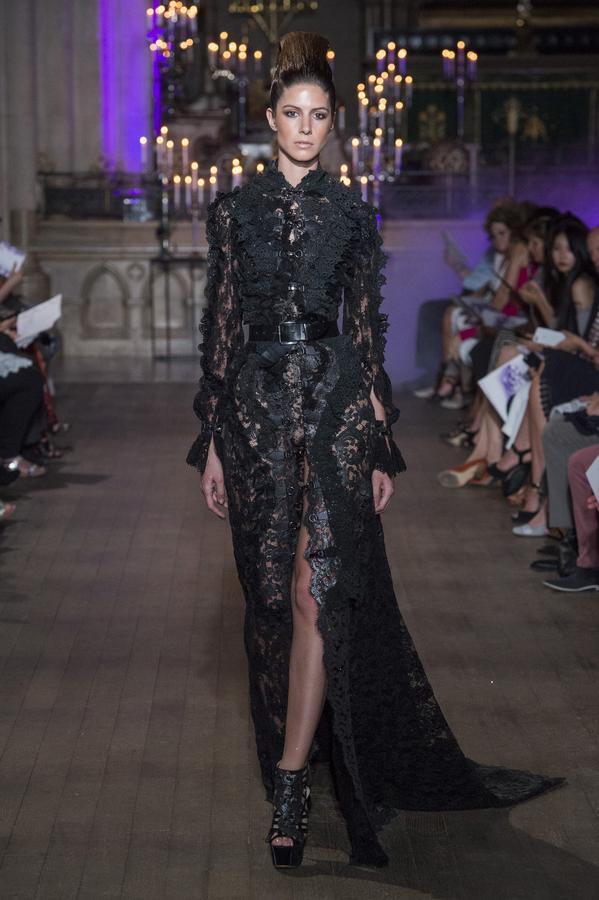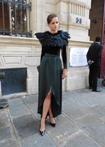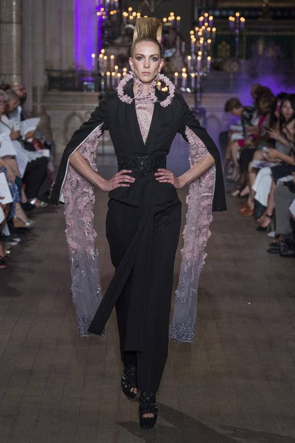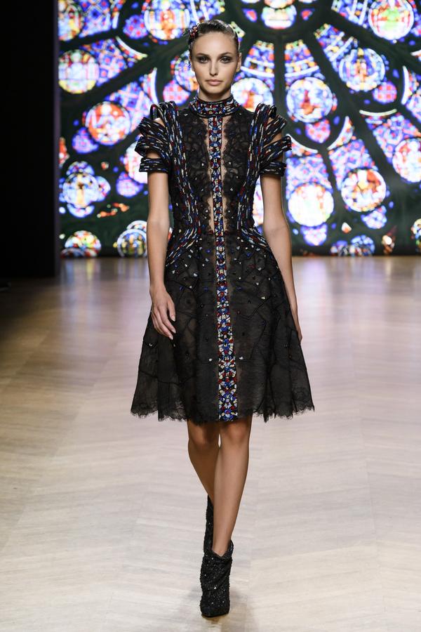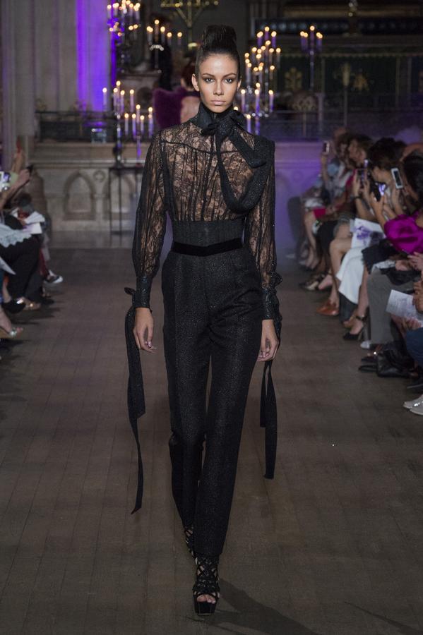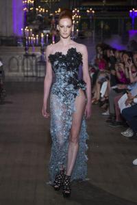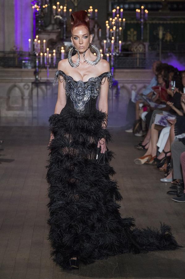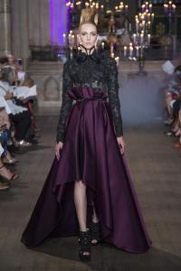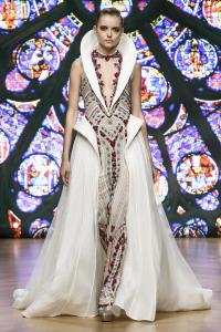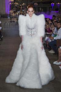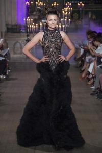 DEFILE EYMERIC FRANCOIS A LA CATHEDRALE AMERICAINE DE PARIS: Le créateur français a présenté sa nouvelle collection intitulée « Sortilèges » dans une ambiance mystique instillée par un décor de toute beauté constitué de grands chandeliers et de troublantes fumées violettes. Les silhouettes majestueuses sont généralement sombres, marquées à la taille sous l’effets de corsets, et épaulées. Les matières sont multiples et contrastées: mousseline de soie, dentelle de Calais, tulle, crêpe et satin de soie se combinent à d’impressionnantes pièces en plumes. Le noir est dominant, mais se décline en de nombreuses nuances, mat, satiné ou brillant. Des violets sombres et quelques teintes pastel (rose poudré, vert clair, beige) viennent compléter la palette de couleurs de cette collection mélancolique, toute en émotion. On remarquait aussi les coiffures spectaculaires réalisées par Frédéric Pavard pour Alexandre de Paris.