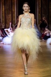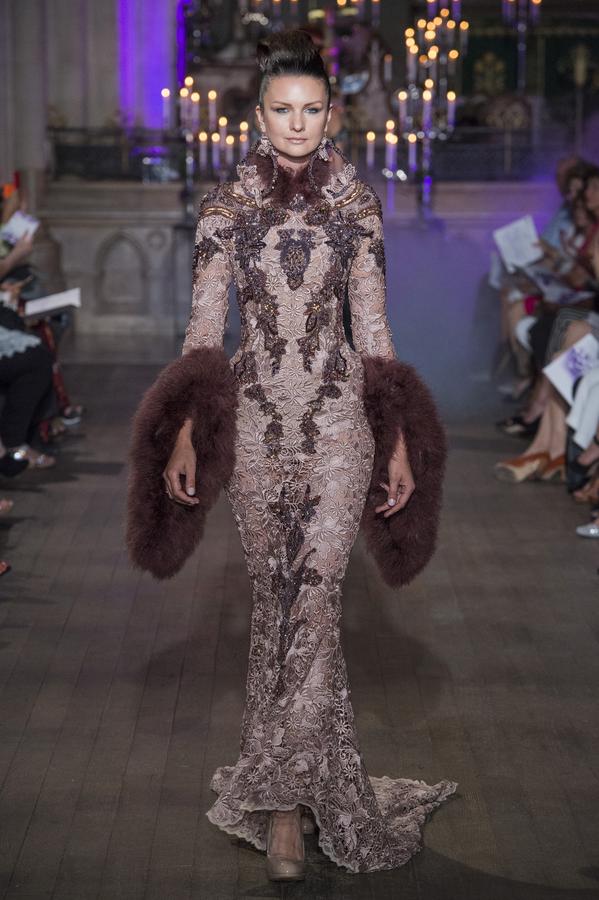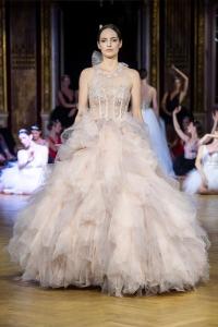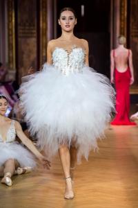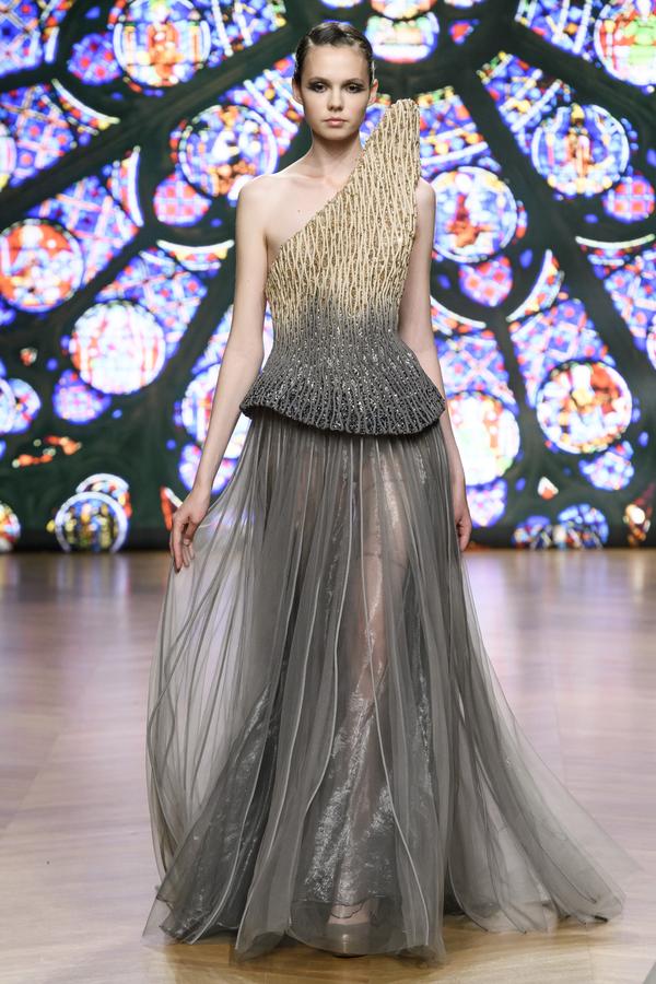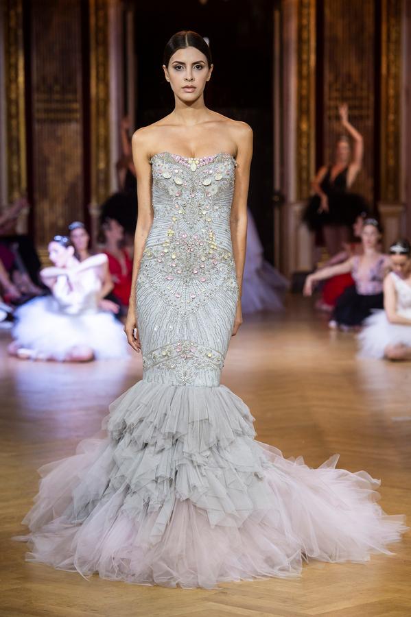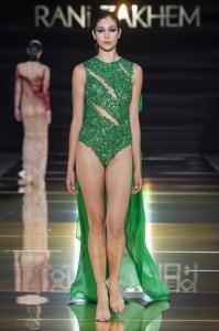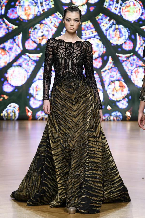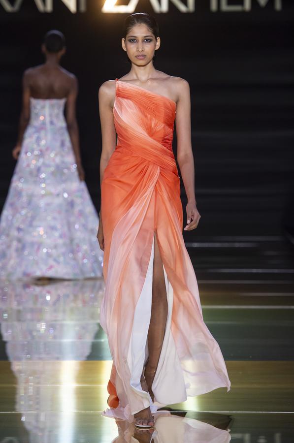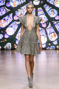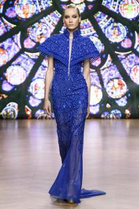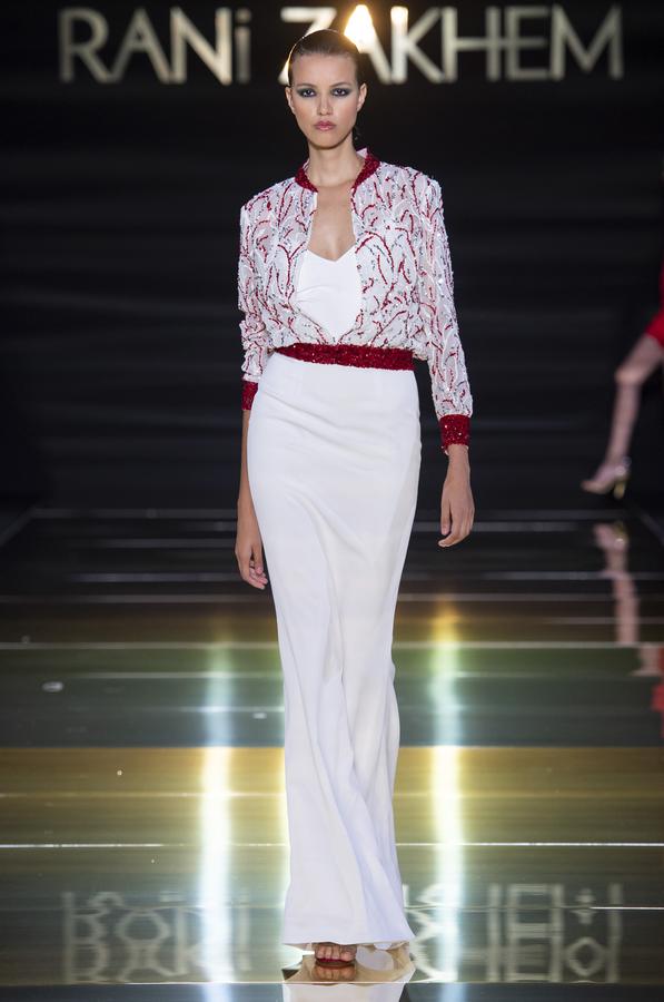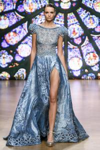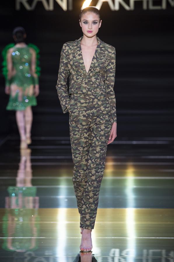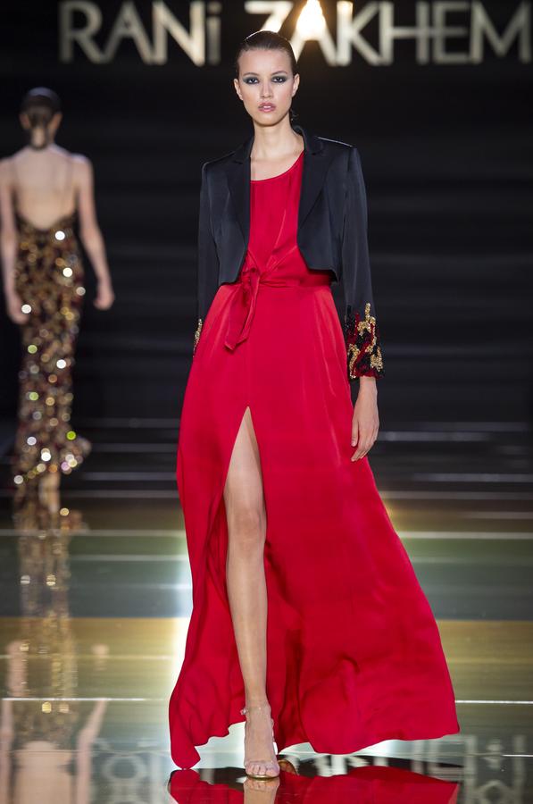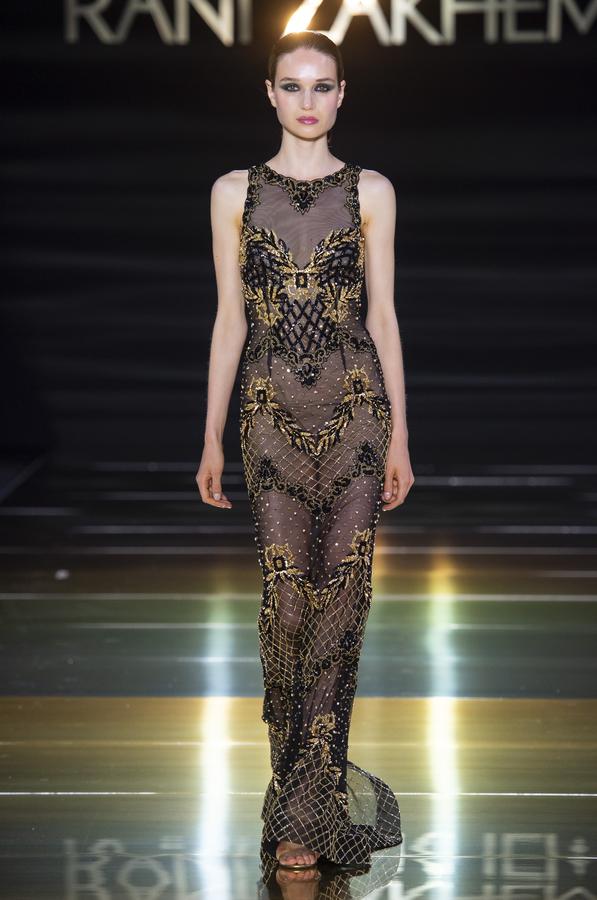 DEFILE RANI ZAKHEM AU PAVILLON CAMBON: Le couturier libanais a intitulé sa nouvelle collection « Telle une déesse guerrière dans son armure de cristaux » et a voulu en faire un hommage à la femme combattante et combative, « glamazone » à la fois séduisante et déterminée. Le motif camouflage est réinterprété et transformé en ornement somptueux brodé en relief dans de nouvelles tonalités: paillettes émeraude, bronze et or sur une jupe crayon; cristaux rouges, noirs et or en bouquets sur un fourreau brûlant ou sur les manches d’un spencer noir. On le retrouve également à l’état quasi brut, sérigraphié sur un crêpe de soie sable, sur un tailleur composé d’un spencer en V et d’un pantalon cigarette. Le galon militaire, surdimensionné, vient orner les manches d’une veste ou d’une robe. La « glamazone » traduit également toute la poésie d’une jungle imaginaire en se parant de fourreaux diaphanes colorés sur lesquels s’enchevêtrent des cascades de lianes brodées main de paillettes et de fils tressés, blanc, bronze, argent et or. Faune et flore se combinent dans un festival de couleurs aux dégradés remarquables et à renfort de tulle, crinoline et volants. Le minimalisme puissant d’une robe blanche sublimé par un léger ornement complète brillamment cet ensemble.