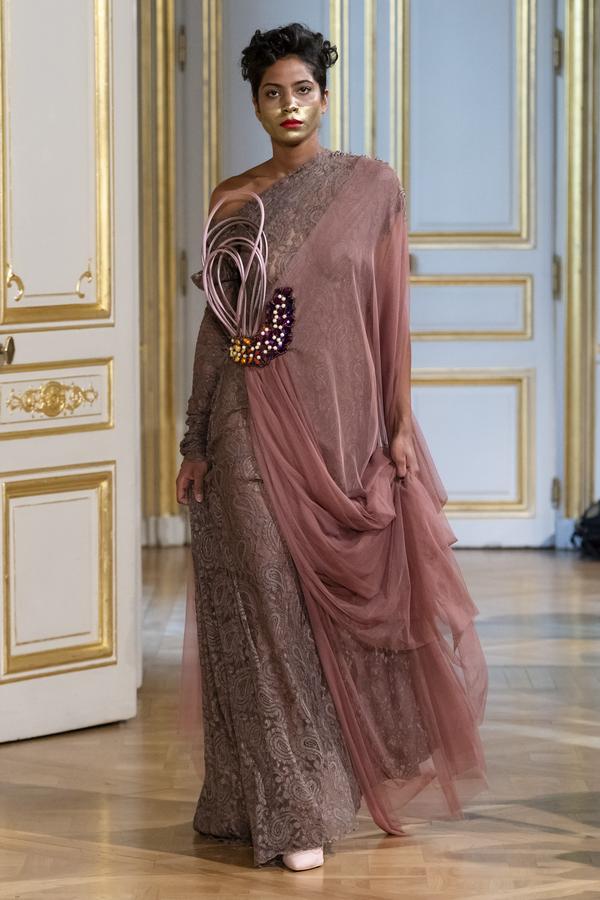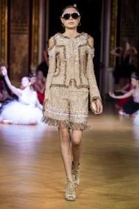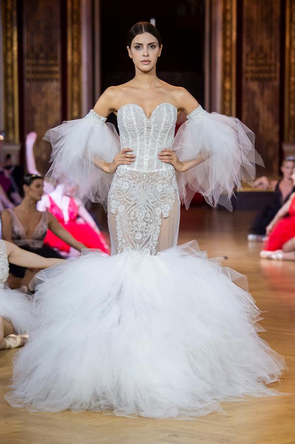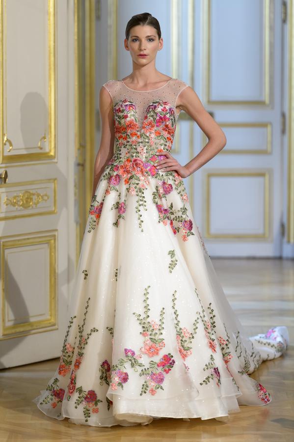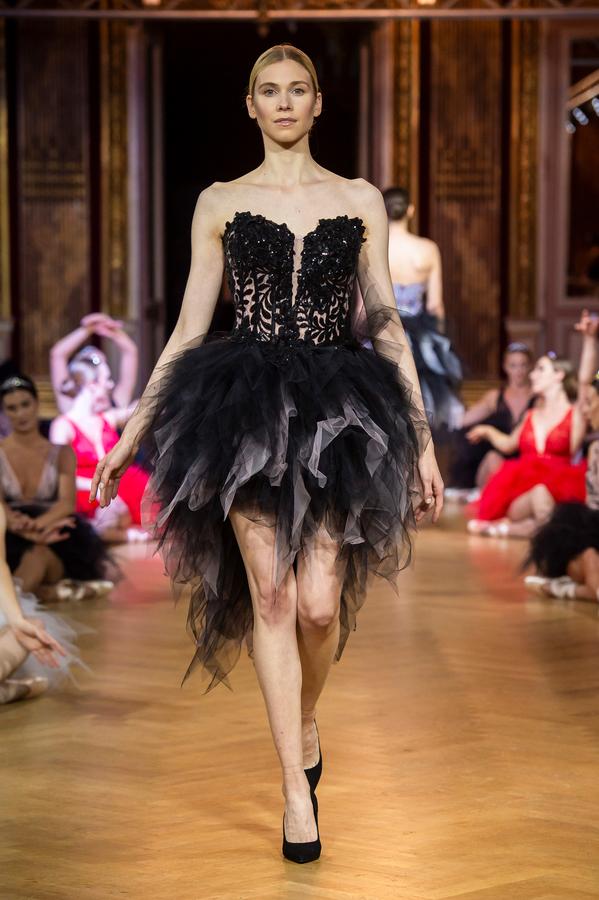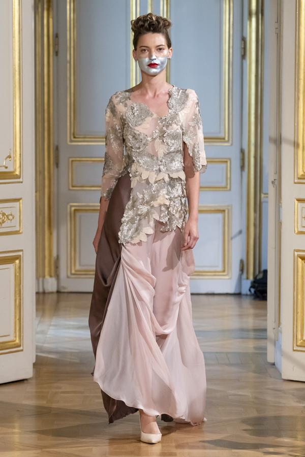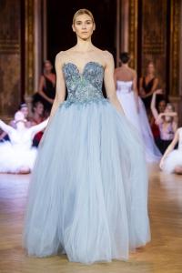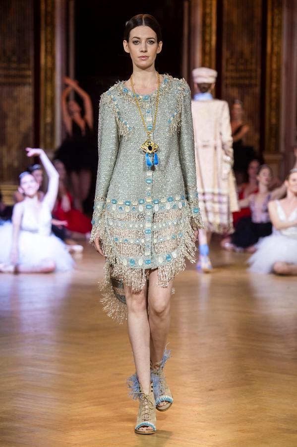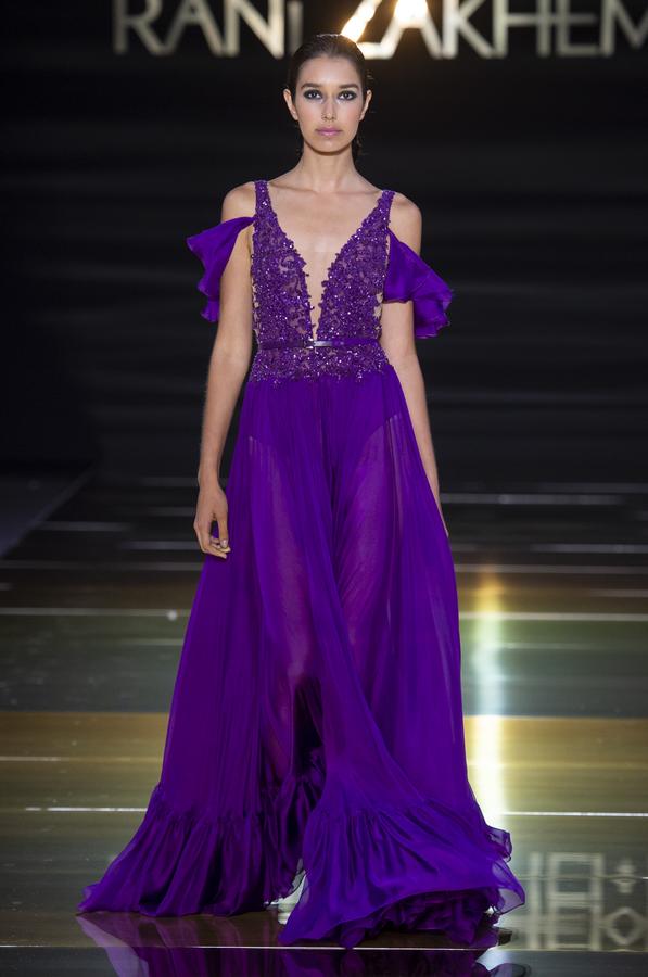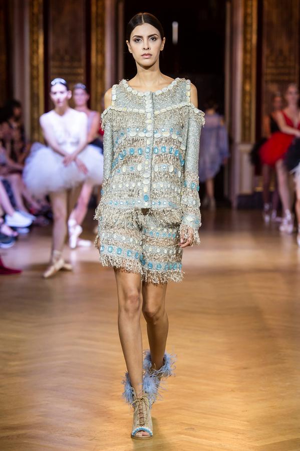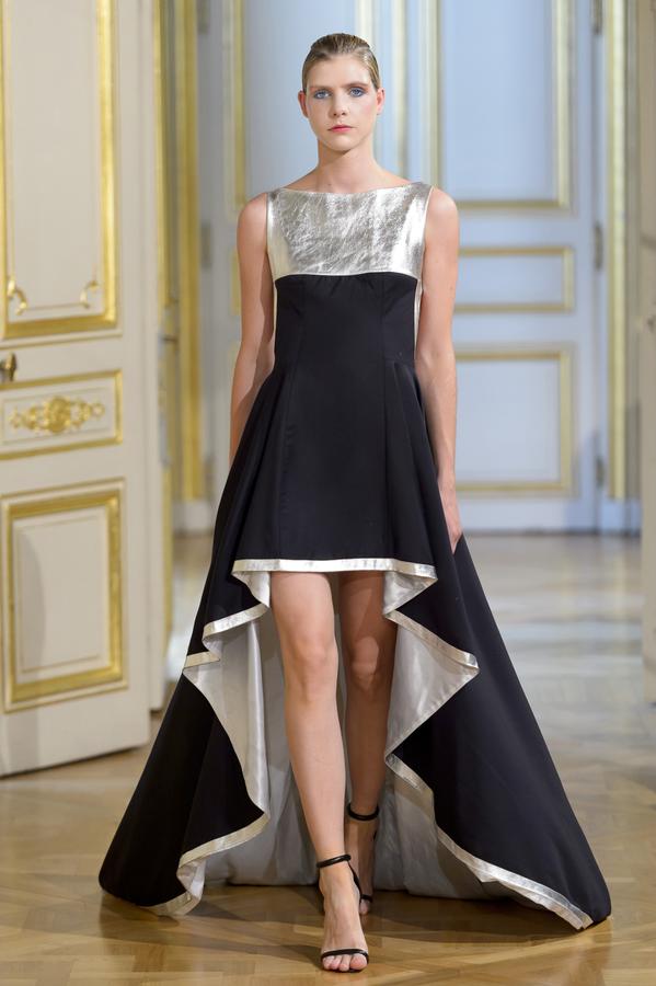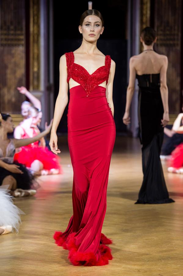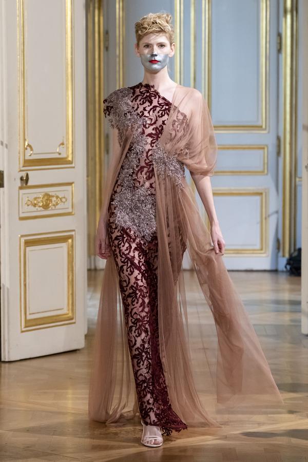 DEFILE RANI ZAKHEM AU PAVILLON CAMBON: Le couturier libanais a intitulé sa nouvelle collection « Telle une déesse guerrière dans son armure de cristaux » et a voulu en faire un hommage à la femme combattante et combative, « glamazone » à la fois séduisante et déterminée. Le motif camouflage est réinterprété et transformé en ornement somptueux brodé en relief dans de nouvelles tonalités: paillettes émeraude, bronze et or sur une jupe crayon; cristaux rouges, noirs et or en bouquets sur un fourreau brûlant ou sur les manches d’un spencer noir. On le retrouve également à l’état quasi brut, sérigraphié sur un crêpe de soie sable, sur un tailleur composé d’un spencer en V et d’un pantalon cigarette. Le galon militaire, surdimensionné, vient orner les manches d’une veste ou d’une robe. La « glamazone » traduit également toute la poésie d’une jungle imaginaire en se parant de fourreaux diaphanes colorés sur lesquels s’enchevêtrent des cascades de lianes brodées main de paillettes et de fils tressés, blanc, bronze, argent et or. Faune et flore se combinent dans un festival de couleurs aux dégradés remarquables et à renfort de tulle, crinoline et volants. Le minimalisme puissant d’une robe blanche sublimé par un léger ornement complète brillamment cet ensemble.