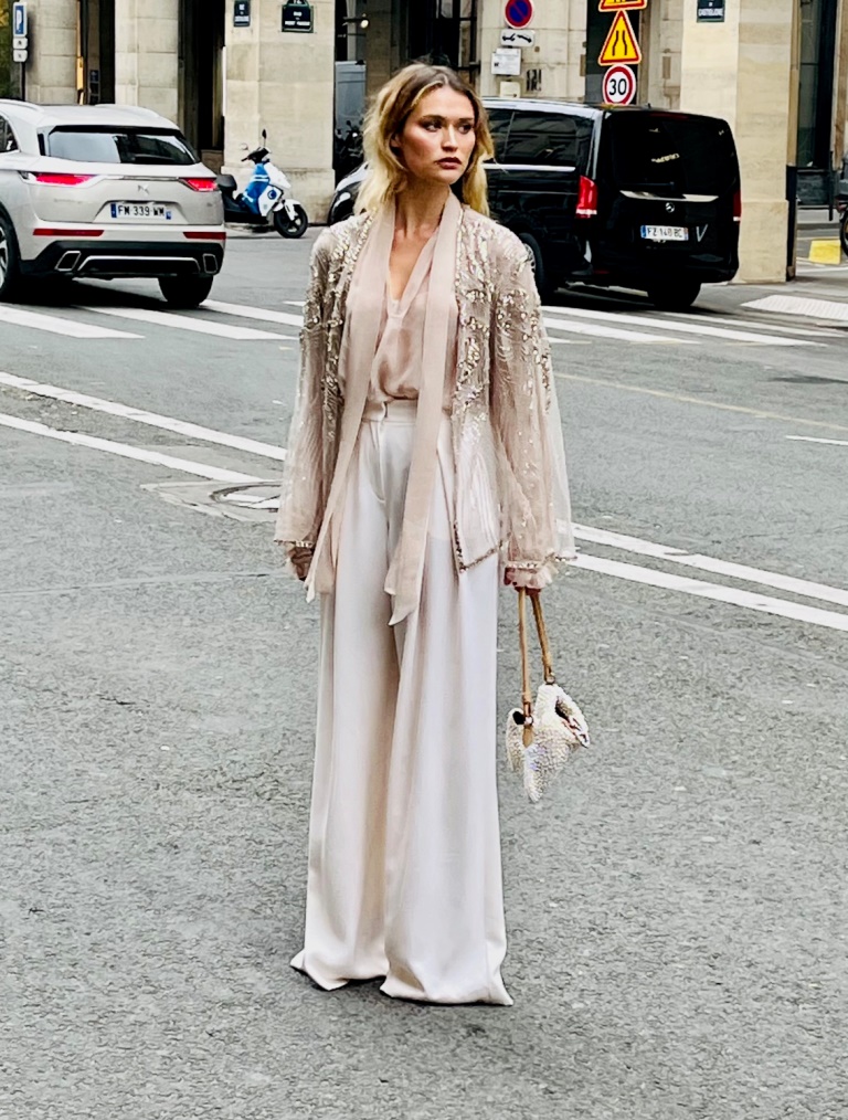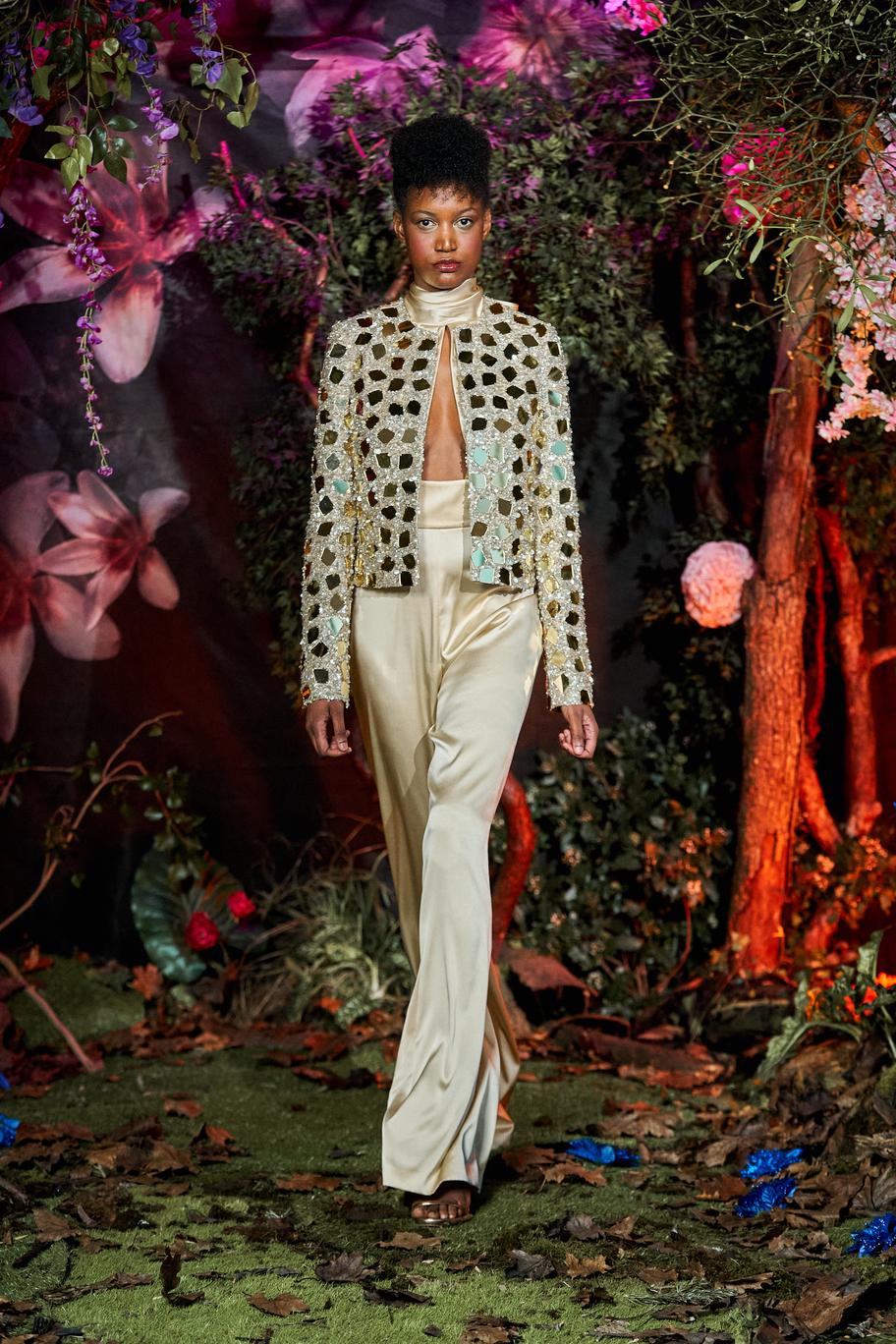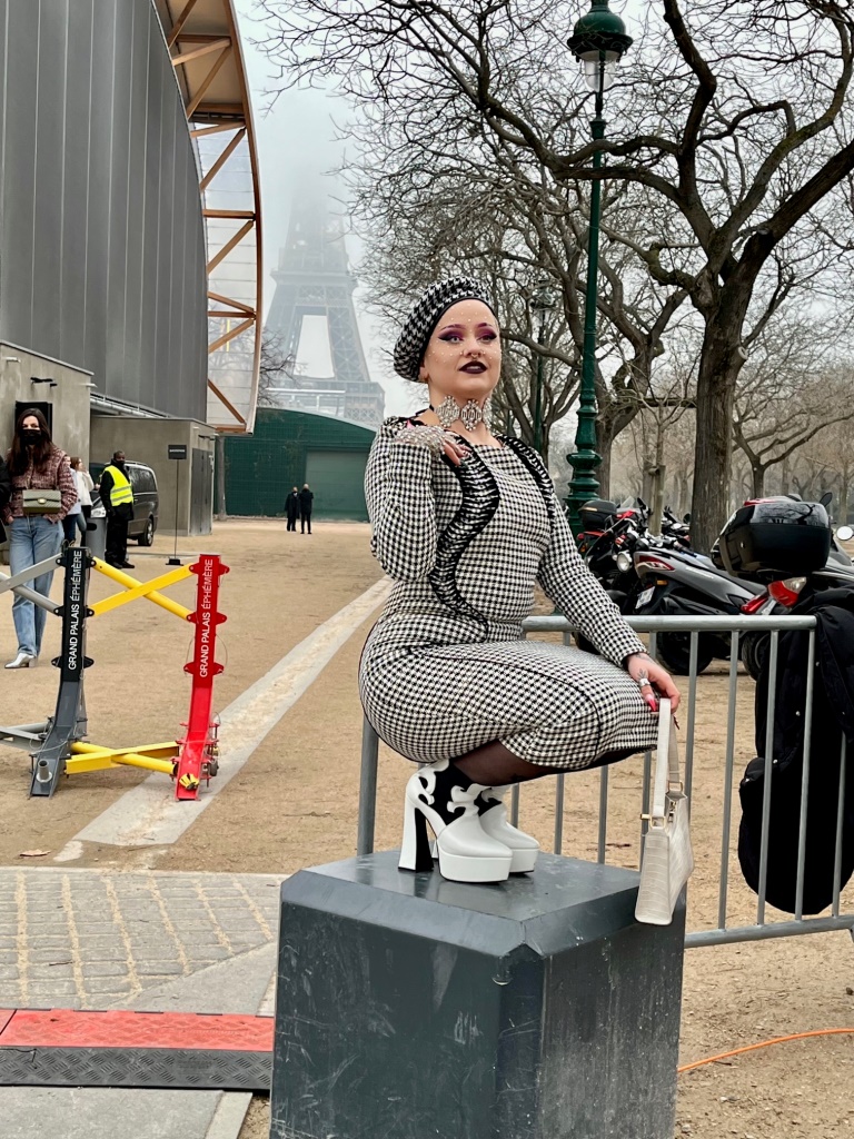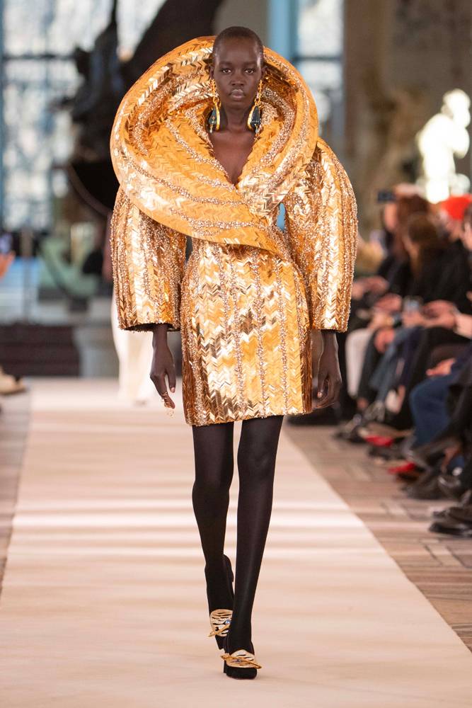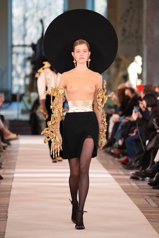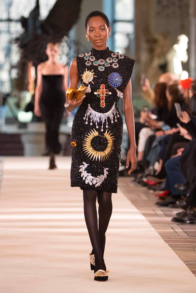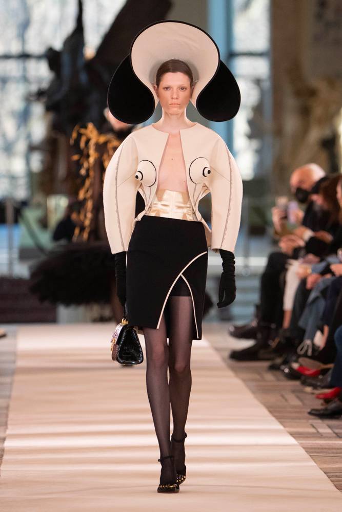 DEFILE SCHIAPARELLI AU PETIT PALAIS: Le couturier texan Daniel Roseberry, directeur artistique de Schiaparelli depuis 2019, a présenté une collection spectaculaire, portée vers le divin, qui donne assurément un nouvel élan à la maison parisienne fondée en 1927 par Elsa Schiaparelli. La palette de couleurs sommaire mais percutante (noir, blanc, or) met en valeur des silhouettes ultra structurées aux volumes impressionnants: les immenses chapeaux circulaires et couronnes dessinent des auréoles autour des têtes; les tailleurs, robes, vestes et pantalons, habilement coupés dans des matières rigides, ondulent autour des corps par leurs formes courbes et géométriques. Les lignes et reliefs du corps sont exagérés par des vestes courtes rappelant l’habit de lumière des toreros, l’ajout sur la poitrine de seins coniques, ou encore par des bustiers corsetés et une robe en velours noir drapé. Des ornements opulents garnissent les tenues: rubans bouclés en tulle noir en bordure des jupes, parure de plumes jaillissant d’une chevelure, créatures et plantes sculptées dans l’argile ou la mousse avant d’être dorées à la feuille d’or et brodées de cabochons et cristaux vintage.