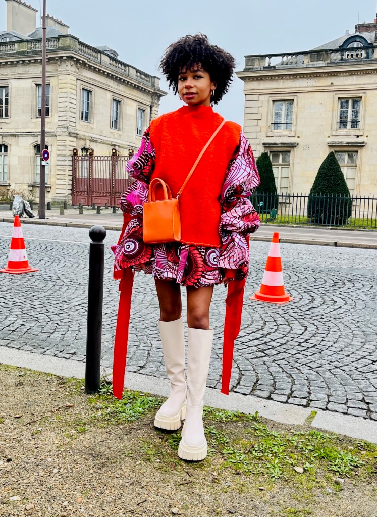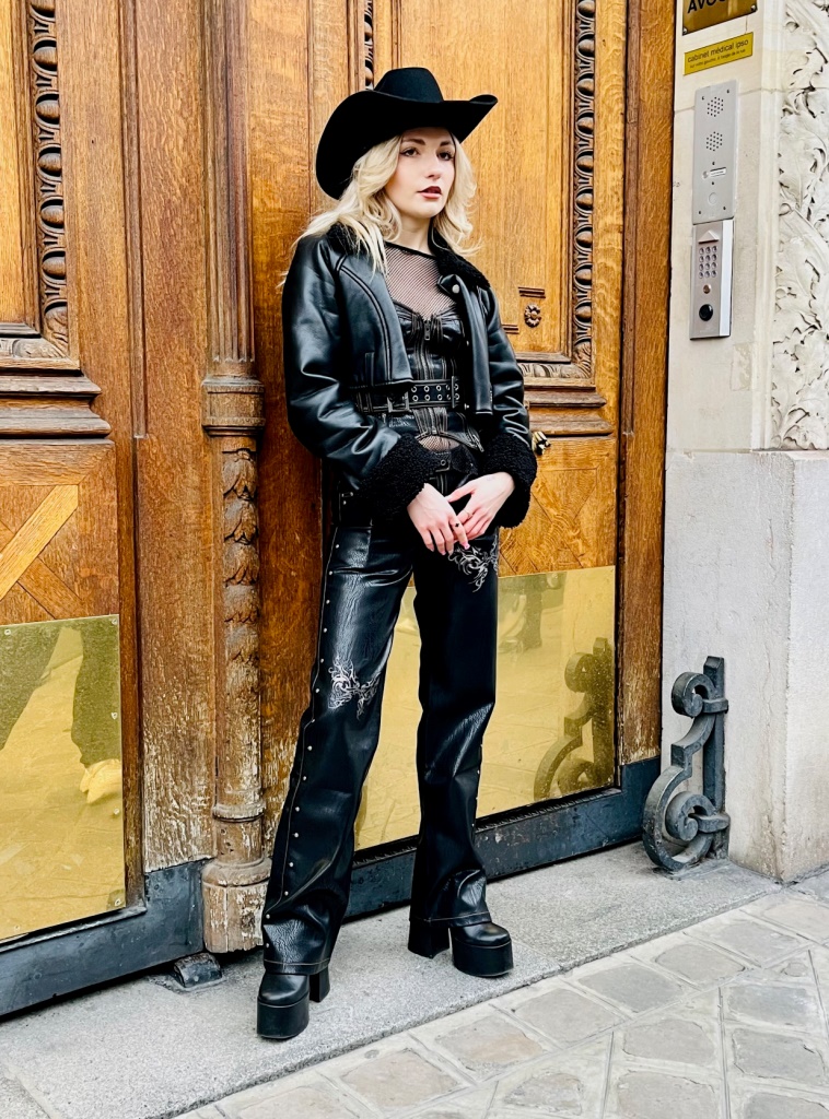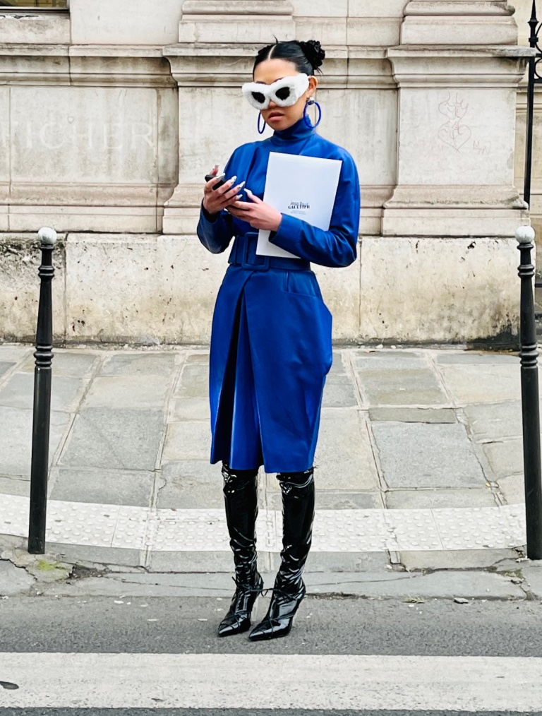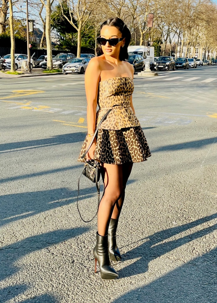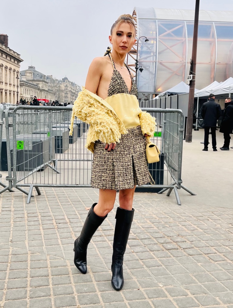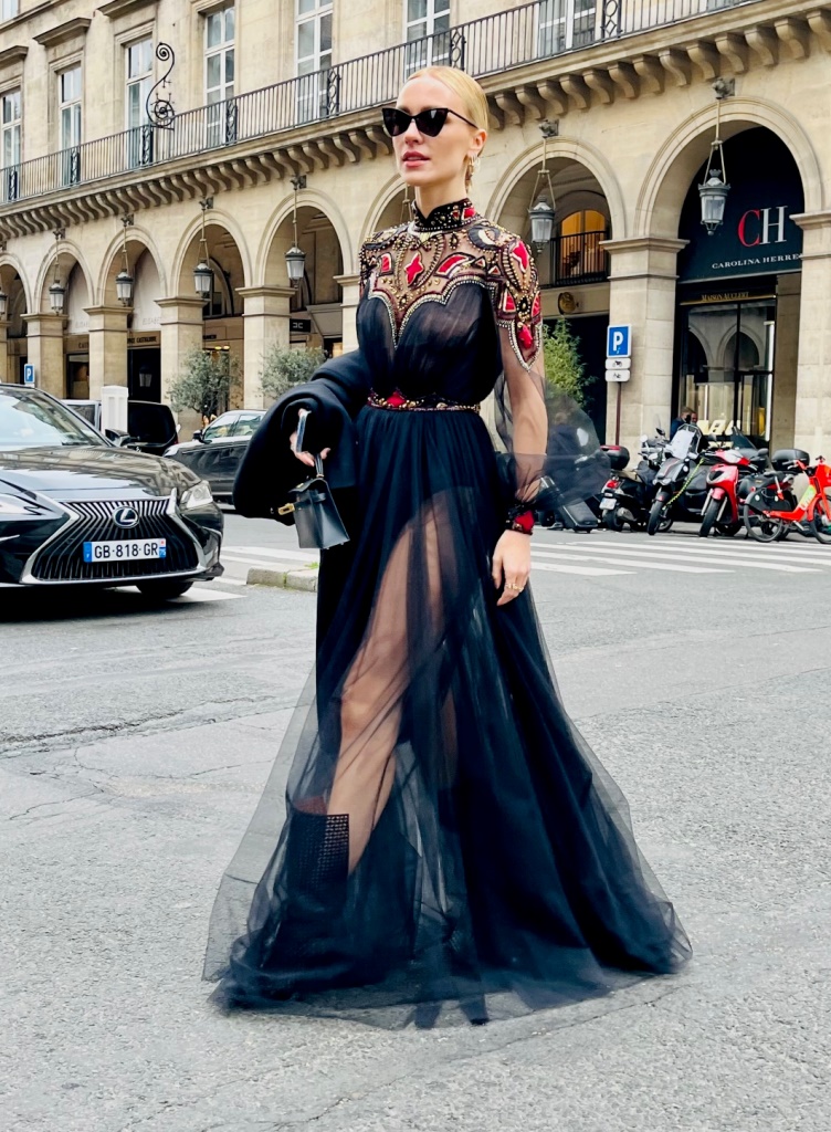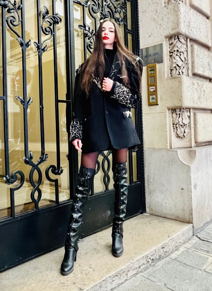 DEFILE SCHIAPARELLI AU PETIT PALAIS: Le couturier texan Daniel Roseberry, directeur artistique de Schiaparelli depuis 2019, a présenté une collection spectaculaire, portée vers le divin, qui donne assurément un nouvel élan à la maison parisienne fondée en 1927 par Elsa Schiaparelli. La palette de couleurs sommaire mais percutante (noir, blanc, or) met en valeur des silhouettes ultra structurées aux volumes impressionnants: les immenses chapeaux circulaires et couronnes dessinent des auréoles autour des têtes; les tailleurs, robes, vestes et pantalons, habilement coupés dans des matières rigides, ondulent autour des corps par leurs formes courbes et géométriques. Les lignes et reliefs du corps sont exagérés par des vestes courtes rappelant l’habit de lumière des toreros, l’ajout sur la poitrine de seins coniques, ou encore par des bustiers corsetés et une robe en velours noir drapé. Des ornements opulents garnissent les tenues: rubans bouclés en tulle noir en bordure des jupes, parure de plumes jaillissant d’une chevelure, créatures et plantes sculptées dans l’argile ou la mousse avant d’être dorées à la feuille d’or et brodées de cabochons et cristaux vintage.