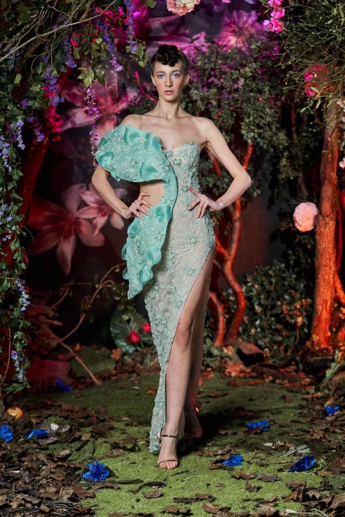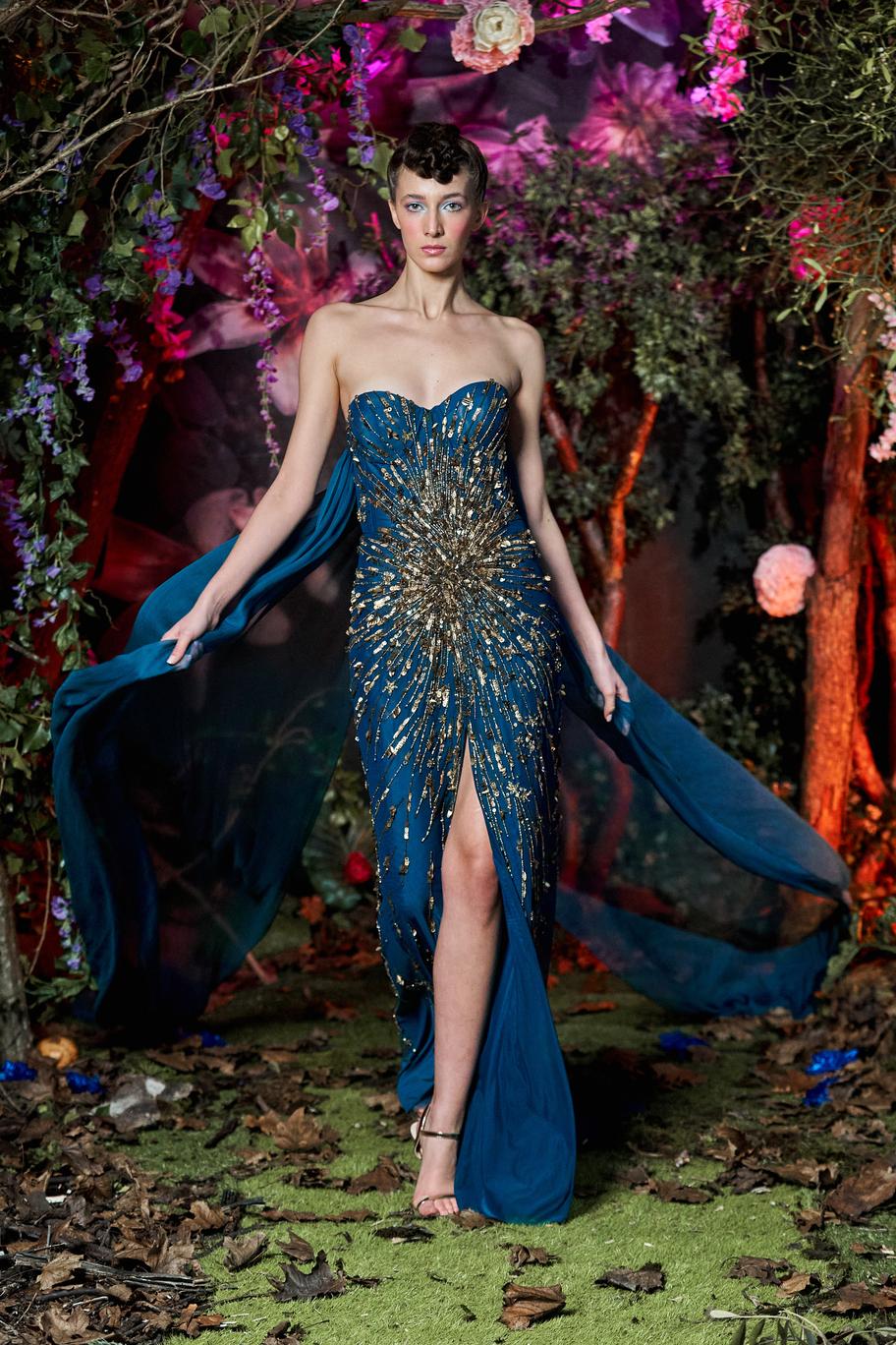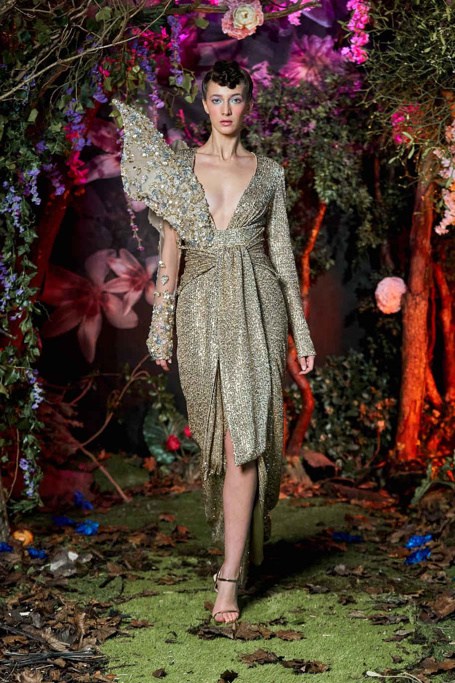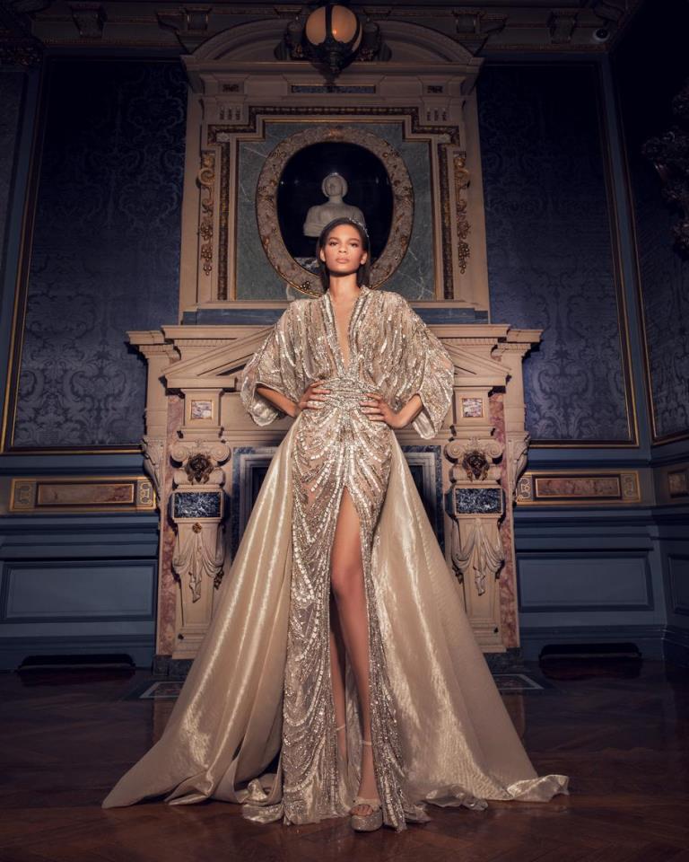 PRESENTATION ZIAD NAKAD EN DIGITAL: Le créateur libanais a présenté une nouvelle collection intitulée « MuZeum », qui comme à son habitude sublime les femmes, tissant autour du corps féminin un écrin précieux et intemporel. Il nous invite à découvrir une collection de muses, toutes différentes, cosmopolites, ayant pour point commun une féminité affirmée, avec un choix de mannequins venant du monde entier (France, Australie, Géorgie, Etats-Unis, Allemagne, Pays-Bas, Corée) destiné à montrer que la beauté est universelle. La robe d’ouverture est un symbole de lumière, qui naît des ténèbres et qui est une invitation à faire un voeu. La signature du couturier se retrouve sur l’ensemble de la collection: épaules oversize, tailles marquées et soulignées par des ceintures bijoux et des broderies. Les robes phare sont créées comme des mosaïques, cousues carré par carré dans son atelier de Beyrouth: un travail de six mois et un nombre incalculable d’heures par robe pour créer cette architecture parfaite moulant le corps de la femme. Tulle, taffetas et dentelle soulignent ça et là une silhouette élancée. Celles-ci sont complétées par une ligne d’accessoires, ceintures Swarovski et boucles d’oreille oversize.