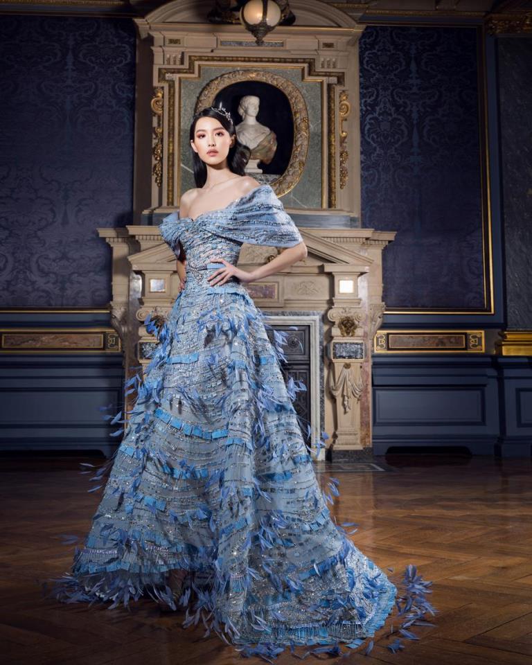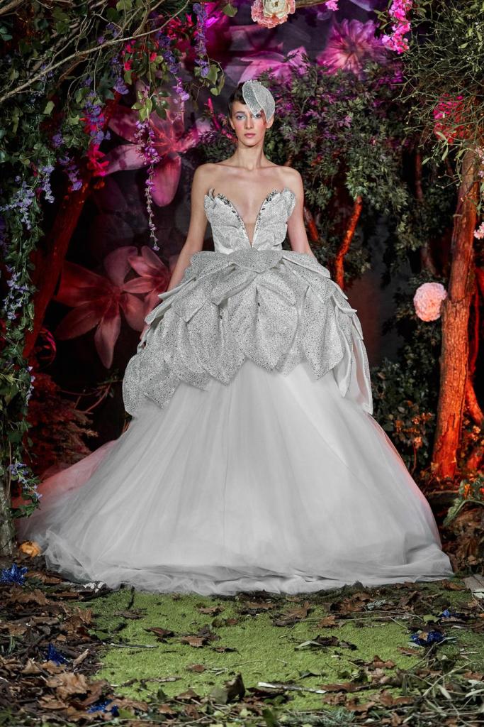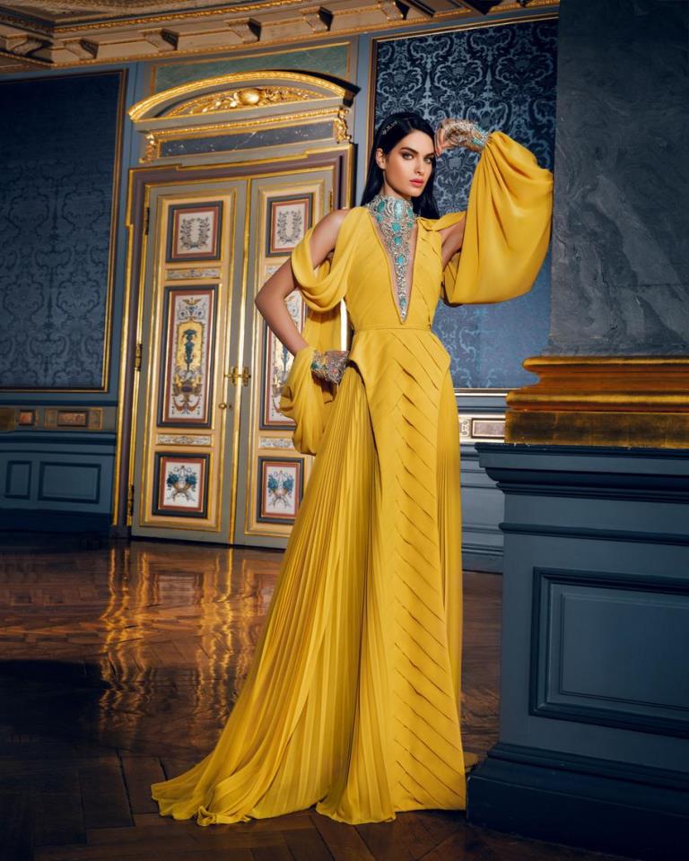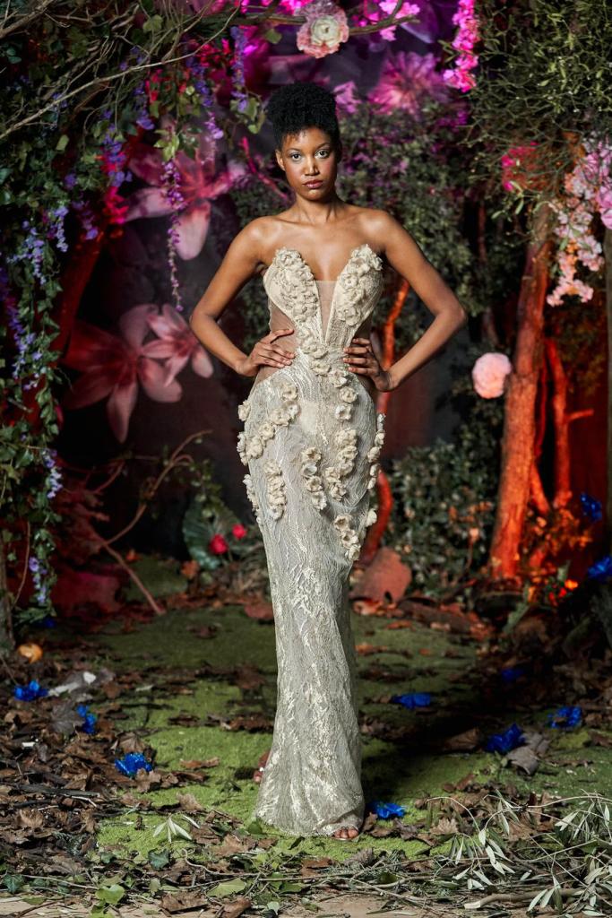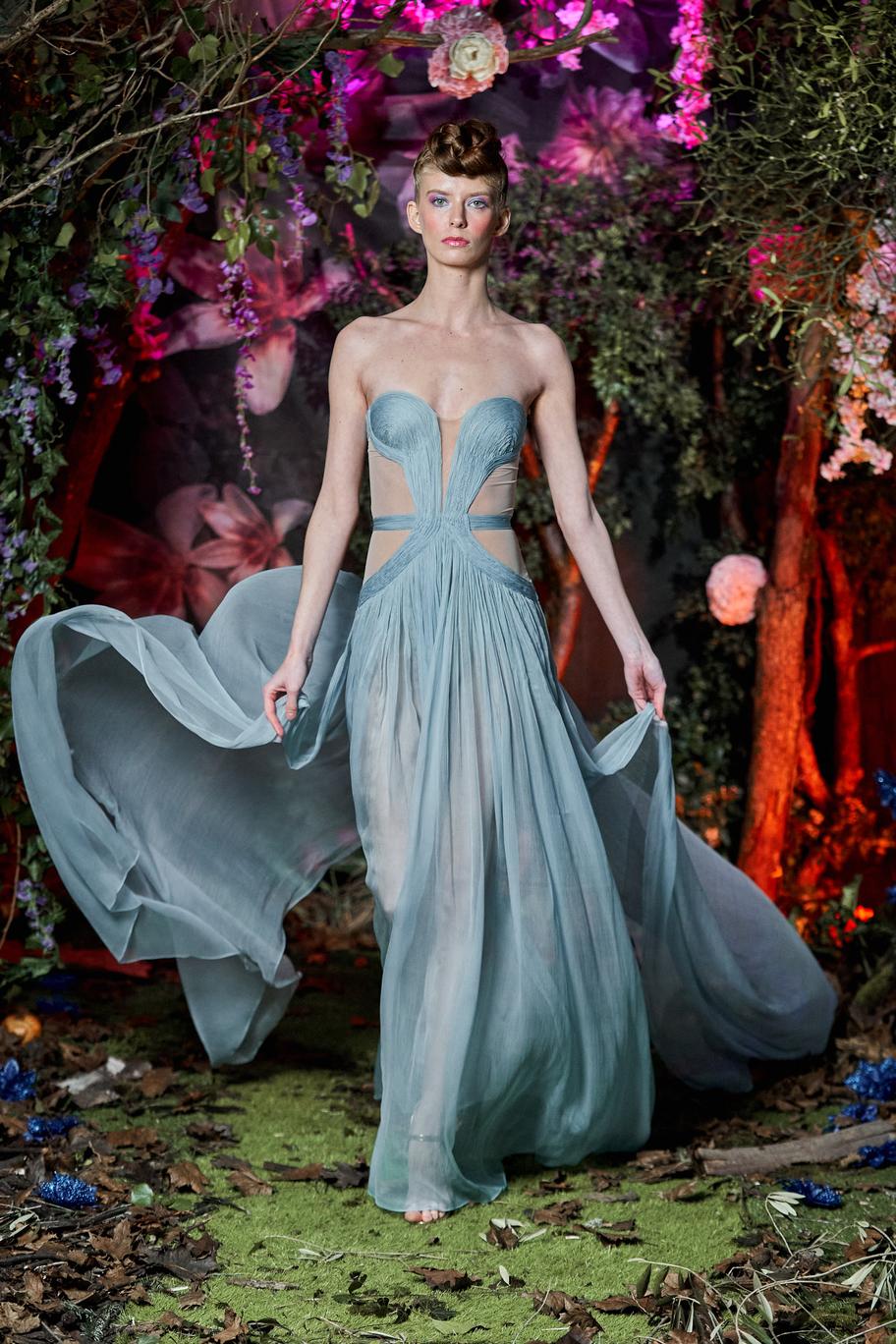 PRESENTATION LA METAMORPHOSE EN DIGITAL: Pour cette nouvelle collection intitulée « Le Triomphe des Fleurs », les deux créatrices polonaises (Ewa Gawkowska et sa soeur Malgorzata Szczena) ont puisé leur inspiration dans l’opéra ballet de Jean-Philippe Rameau « Les Indes Galantes », et tout particulièrement dans ces vers: « Triomphez, agréables fleurs! Répandez vos parfums, Ranimez vos couleurs! », »Papillon inconstant, Vole dans ton bocage! Arrête-toi, Suspends le cours de ta flamme volage! » Les broderies de fleurs ont nécessité un mois de travail, découpées et peintes à la main, un autre mois pour réaliser la broderie du tailleur pantalon, et deux mois pour le plissé des robes. Les coupes féériques au tombé impeccable opposent l’or solaire royal à la profondeur du bleu nuit et la légèreté du vert anis. Les matières utilisées sont exceptionnelles, made in France et respectueuses de l’environnement: dentelle Solstiss, soie, satin, tulle. Le résultat est à la hauteur du grand talent artistique des soeurs créatrices.