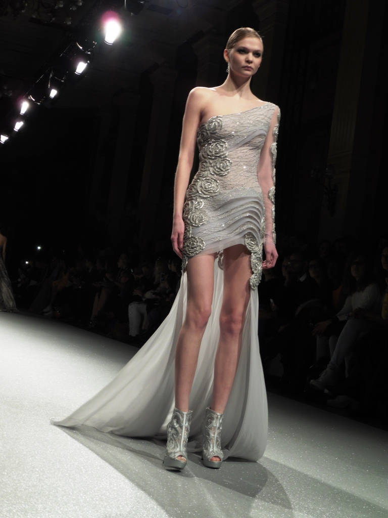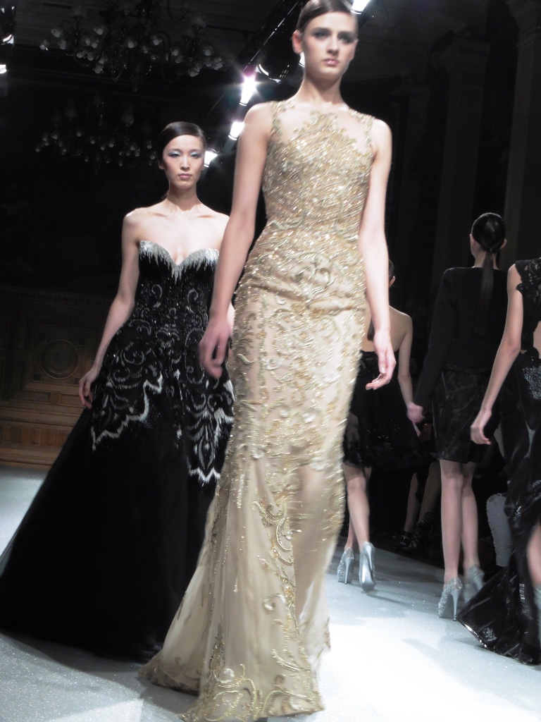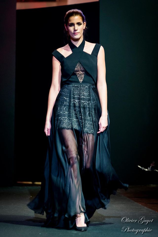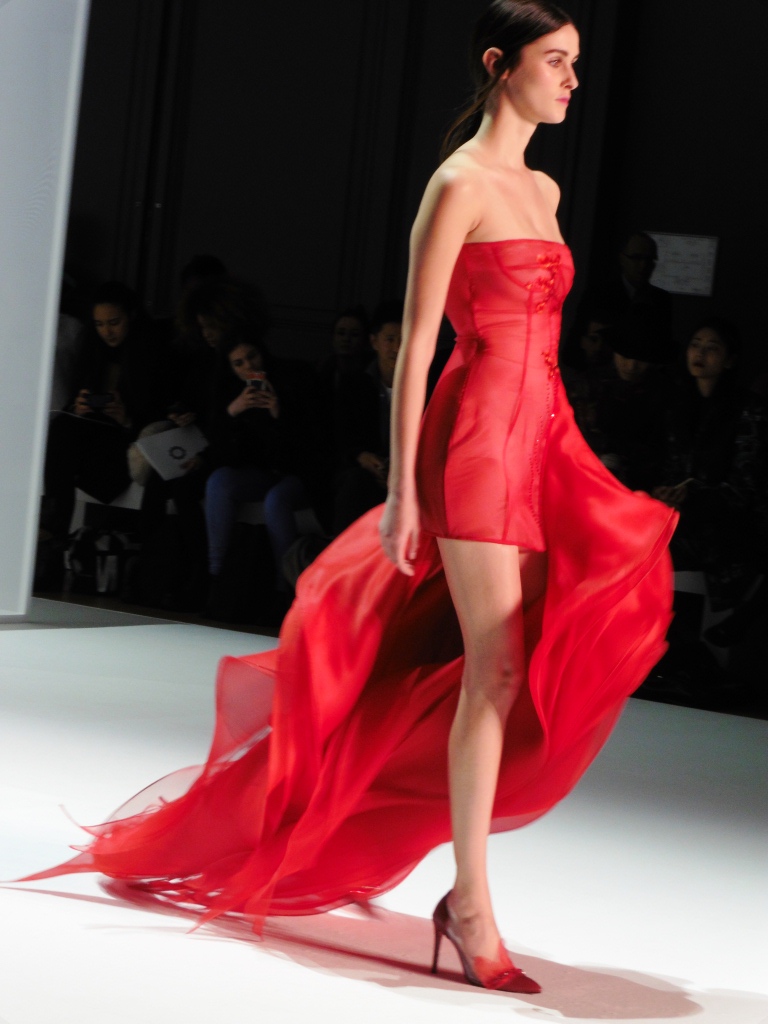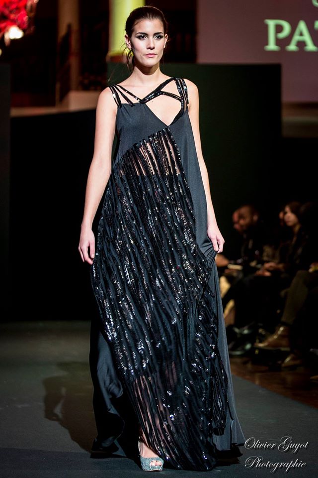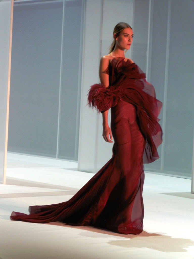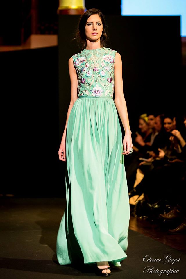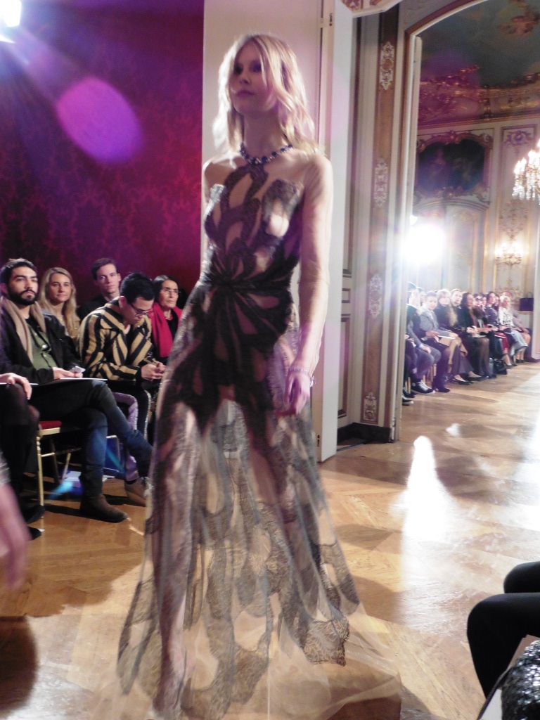 Défilé Alexandre Delima aux Salons France-Amériques: une collection qui bouscule certains codes de la haute couture. Robes longues ou non, mais aussi smoking, combinaison pantalon et short. Palette de couleurs tendre; opposition des ivoires à un noir profond. Transparence et opacité. Noblesse des tissus: crêpe-drap, gazar, organza, soie, chèvre velours. Capeline inspirée d’une casquette de basketteur portée sur une robe très féminine. On apprécie l’audace et cette élégance désinvolte toute en sensualité.