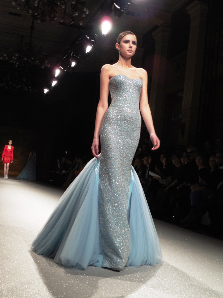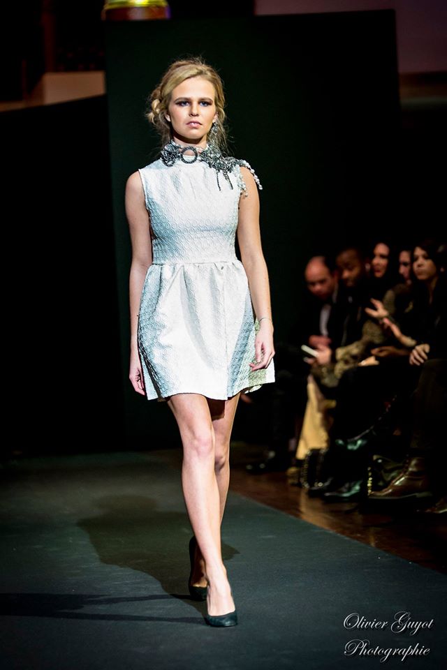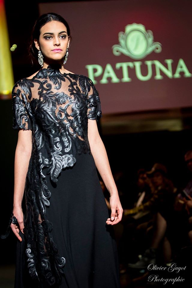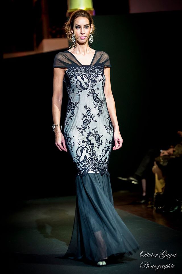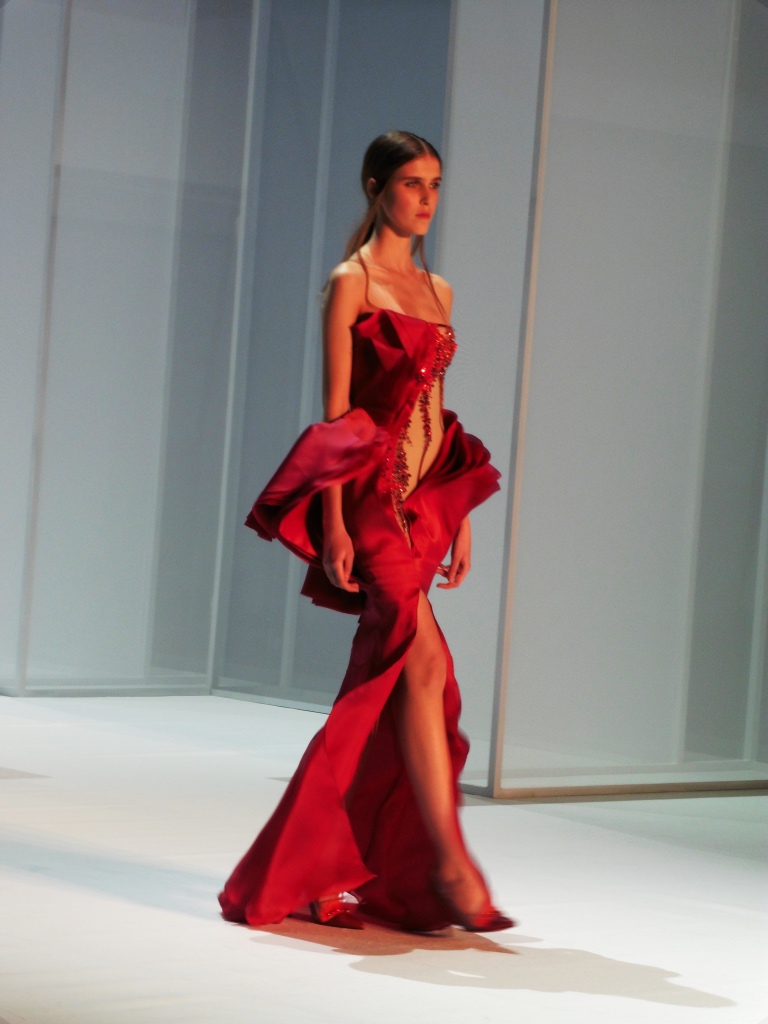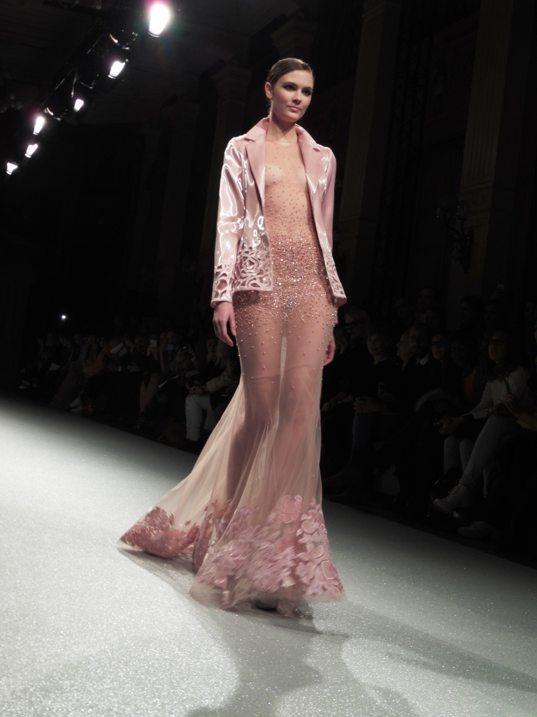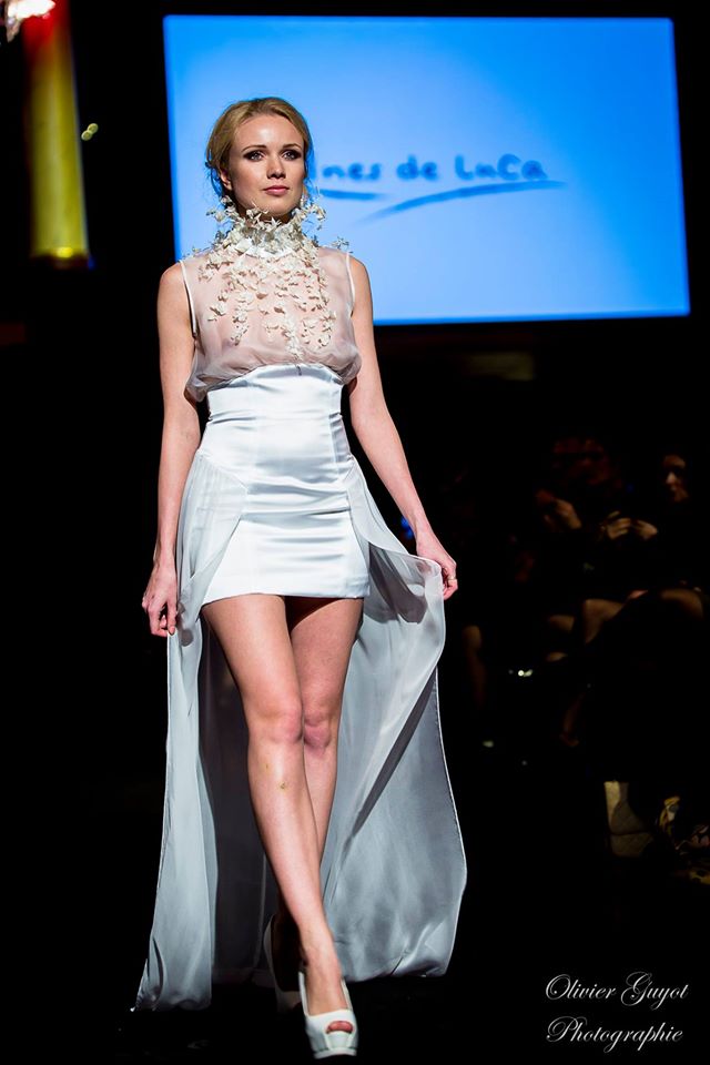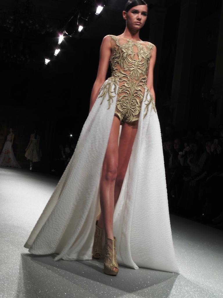 Défilé Alexandre Delima aux Salons France-Amériques: une collection qui bouscule certains codes de la haute couture. Robes longues ou non, mais aussi smoking, combinaison pantalon et short. Palette de couleurs tendre; opposition des ivoires à un noir profond. Transparence et opacité. Noblesse des tissus: crêpe-drap, gazar, organza, soie, chèvre velours. Capeline inspirée d’une casquette de basketteur portée sur une robe très féminine. On apprécie l’audace et cette élégance désinvolte toute en sensualité.
