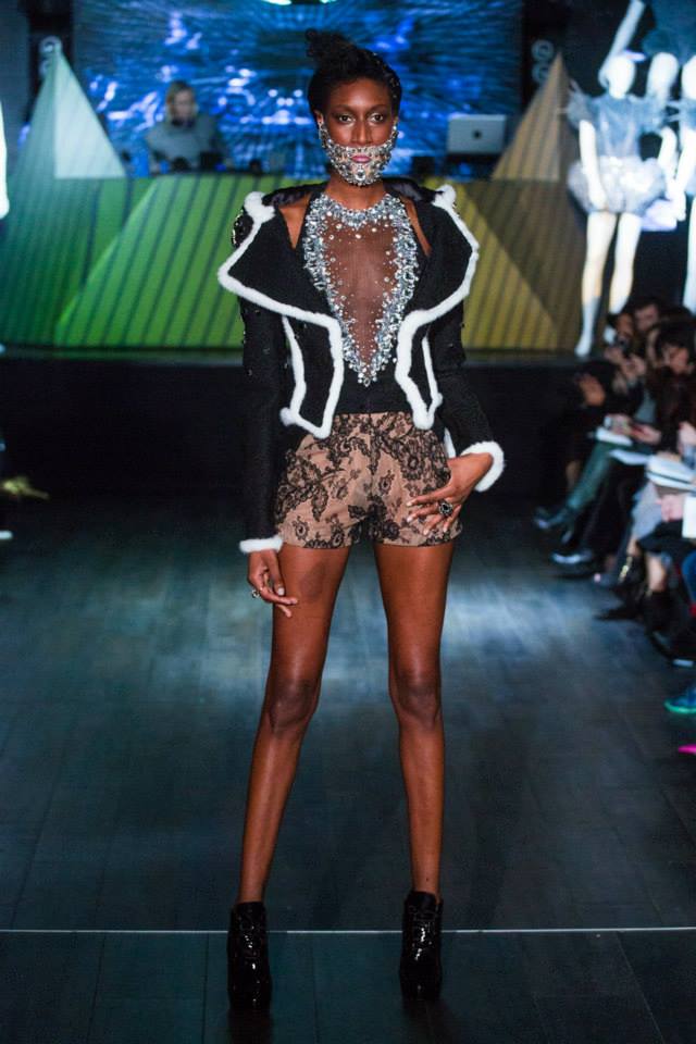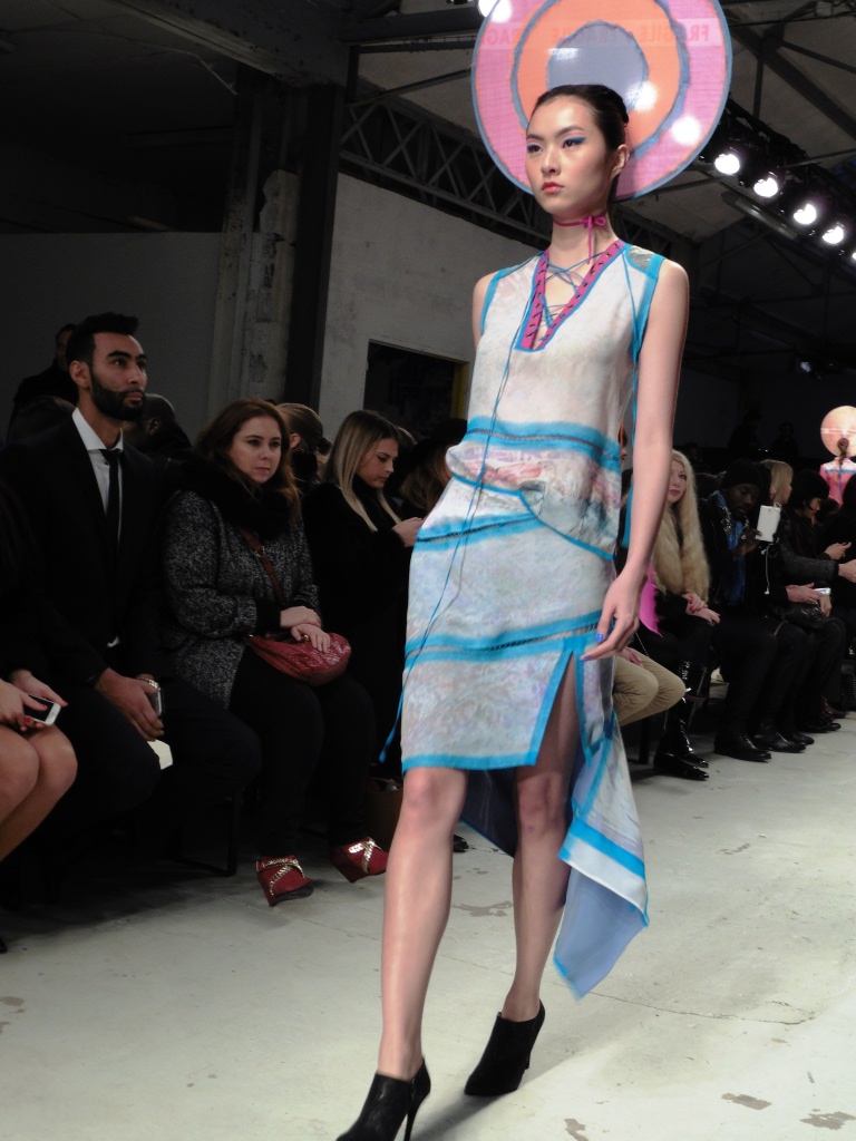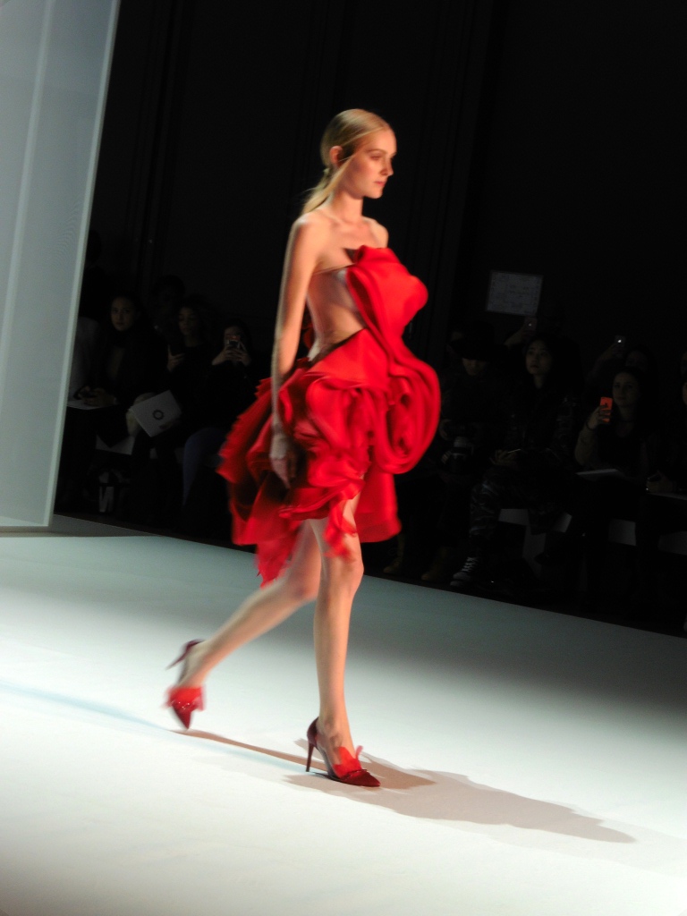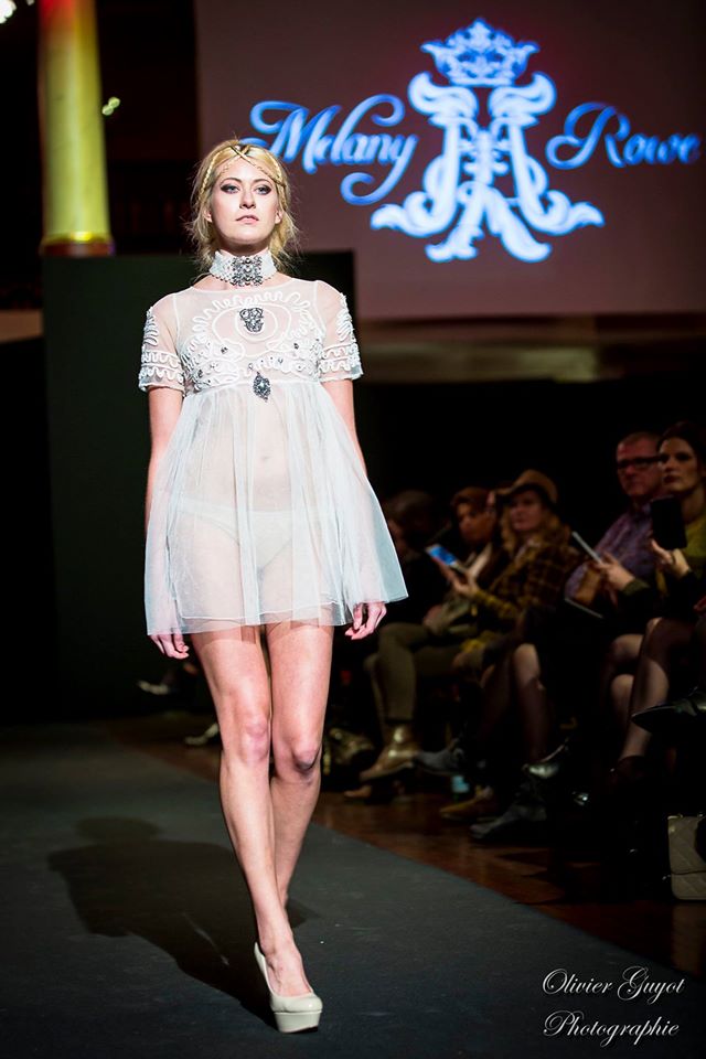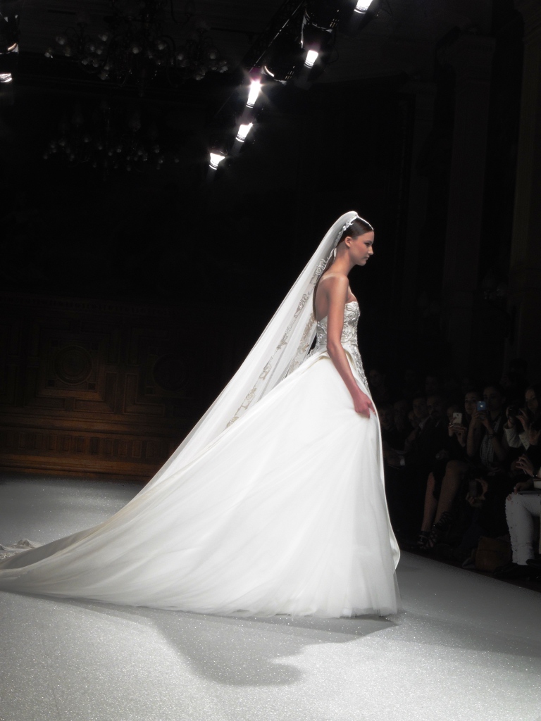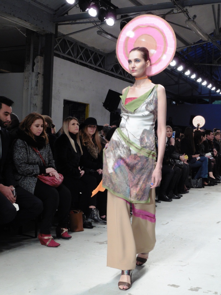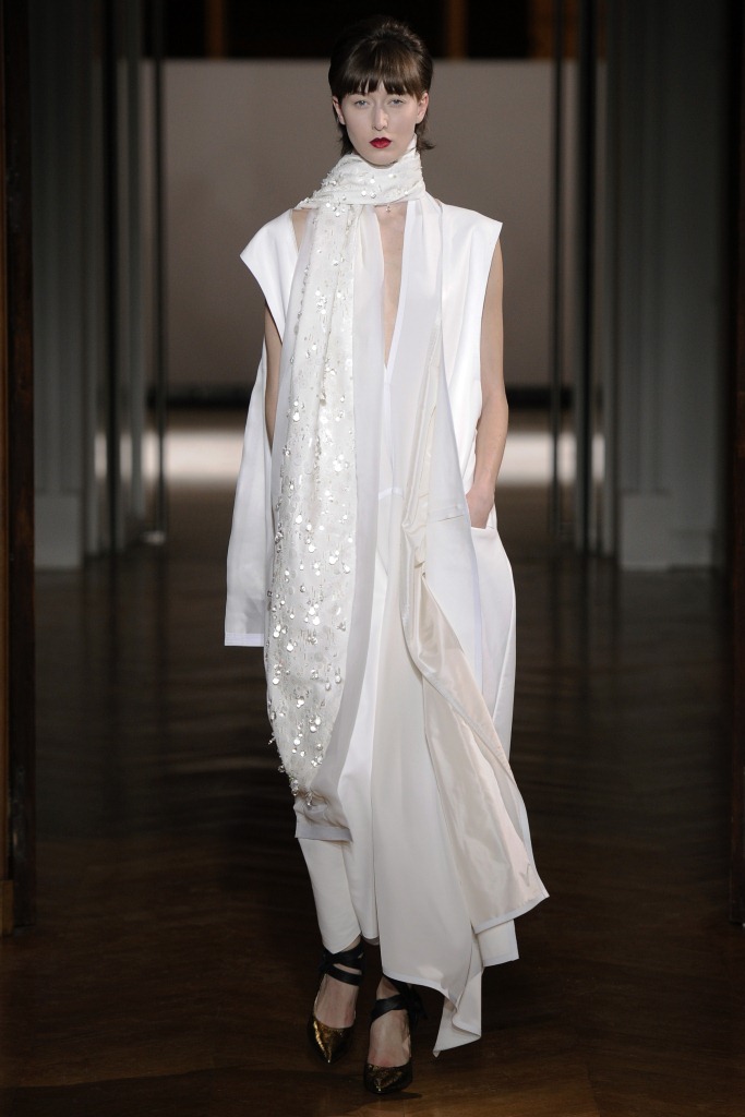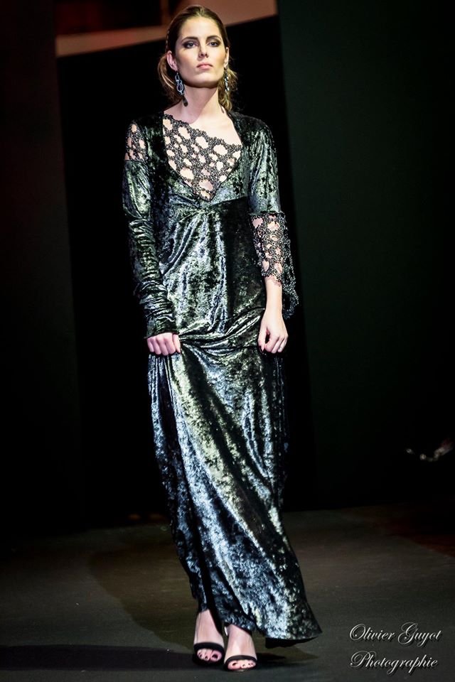 Défilé Alexandre Delima aux Salons France-Amériques: une collection qui bouscule certains codes de la haute couture. Robes longues ou non, mais aussi smoking, combinaison pantalon et short. Palette de couleurs tendre; opposition des ivoires à un noir profond. Transparence et opacité. Noblesse des tissus: crêpe-drap, gazar, organza, soie, chèvre velours. Capeline inspirée d’une casquette de basketteur portée sur une robe très féminine. On apprécie l’audace et cette élégance désinvolte toute en sensualité.