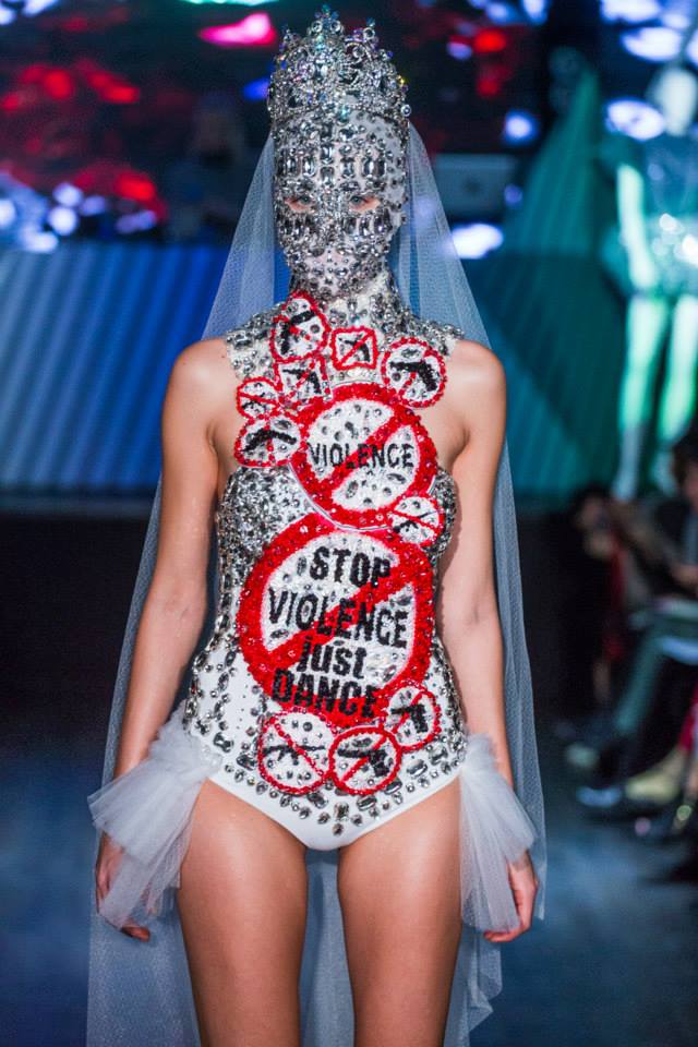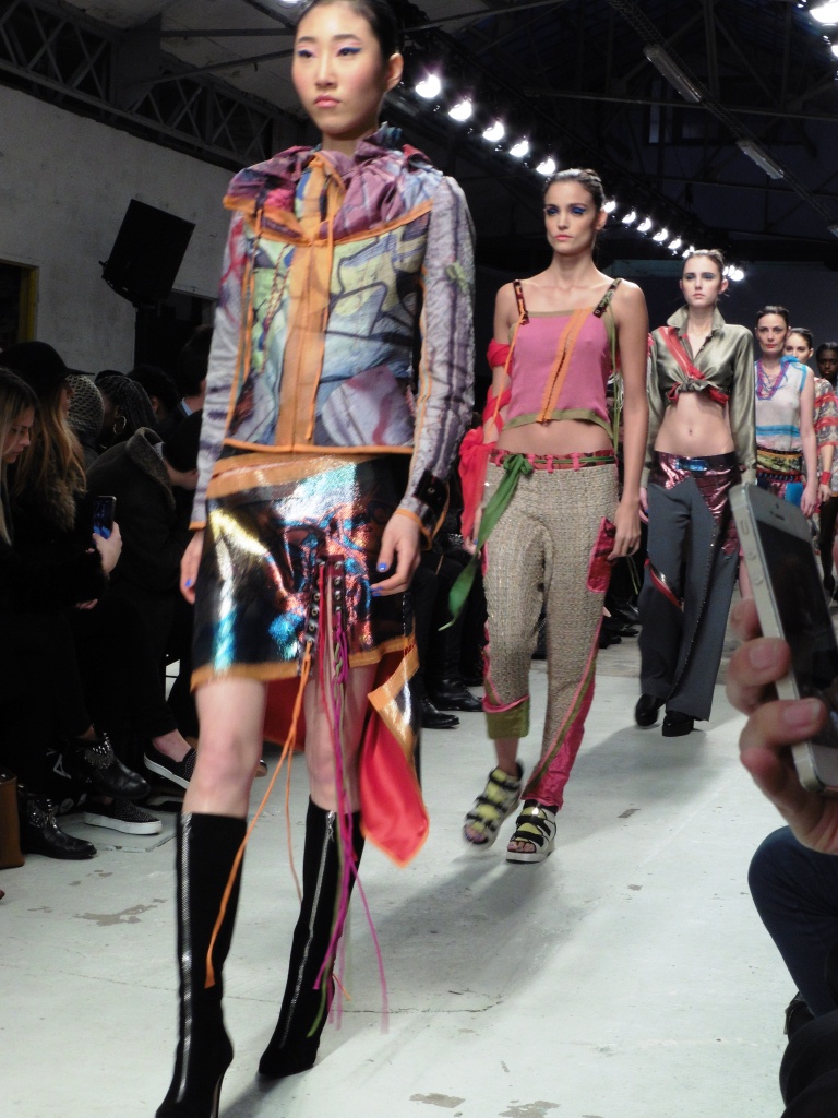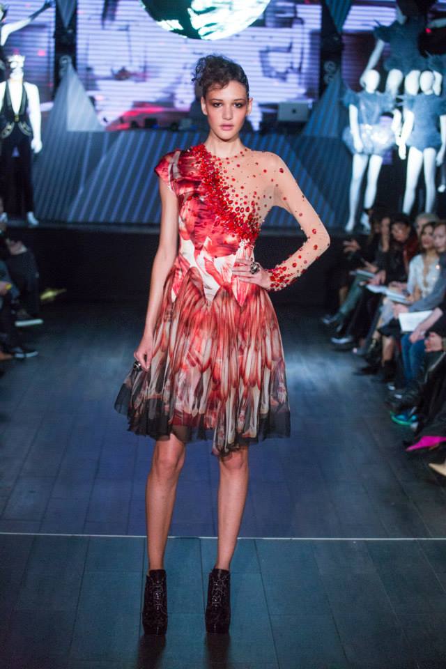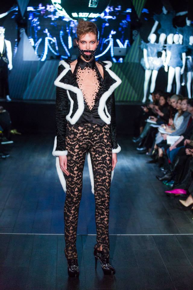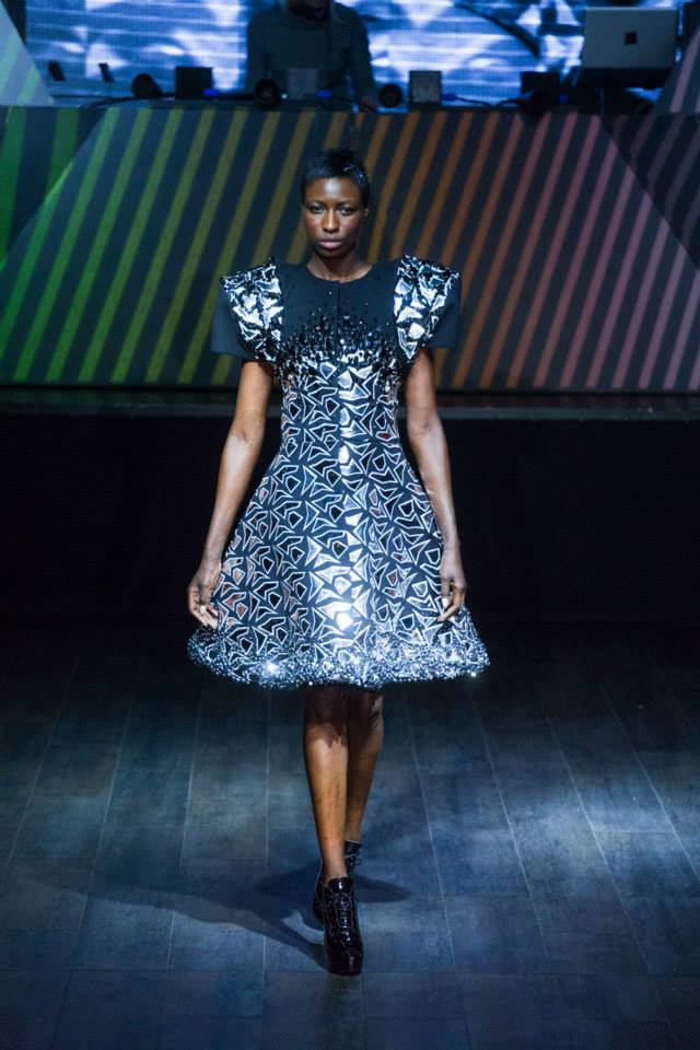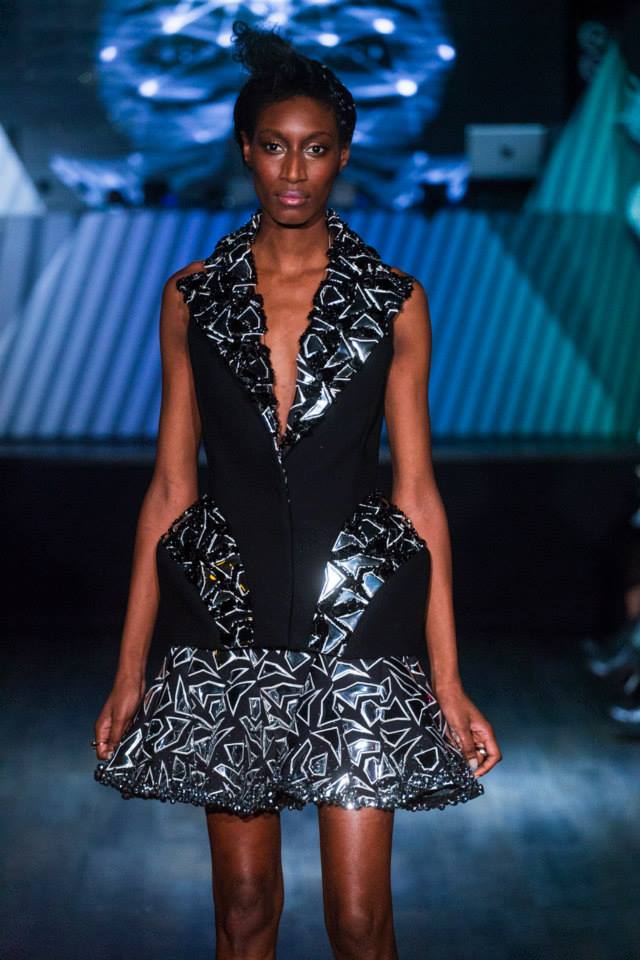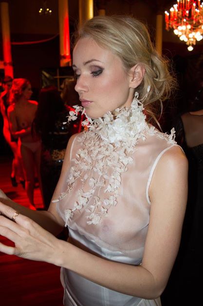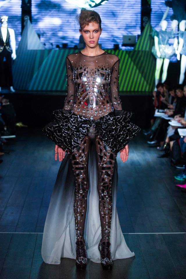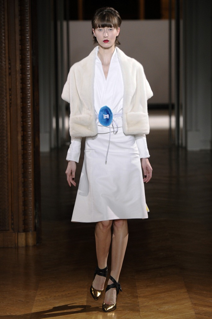 Défilé Alexandre Delima aux Salons France-Amériques: une collection qui bouscule certains codes de la haute couture. Robes longues ou non, mais aussi smoking, combinaison pantalon et short. Palette de couleurs tendre; opposition des ivoires à un noir profond. Transparence et opacité. Noblesse des tissus: crêpe-drap, gazar, organza, soie, chèvre velours. Capeline inspirée d’une casquette de basketteur portée sur une robe très féminine. On apprécie l’audace et cette élégance désinvolte toute en sensualité.
