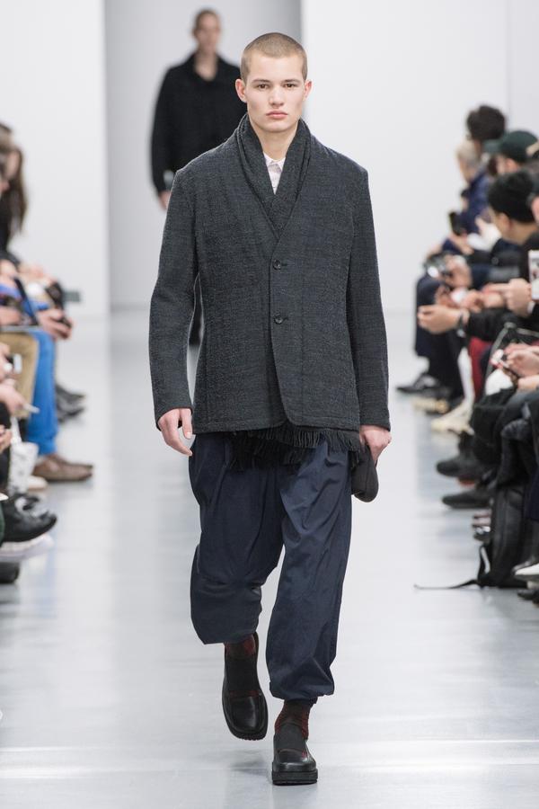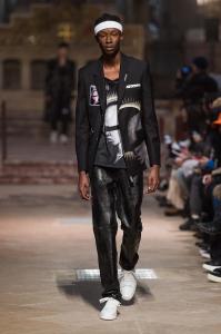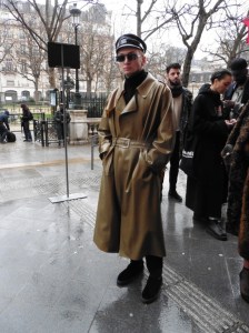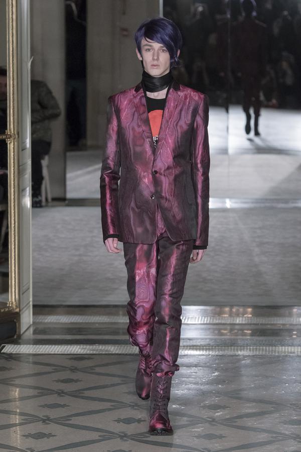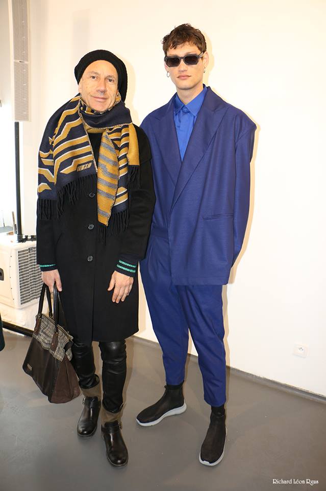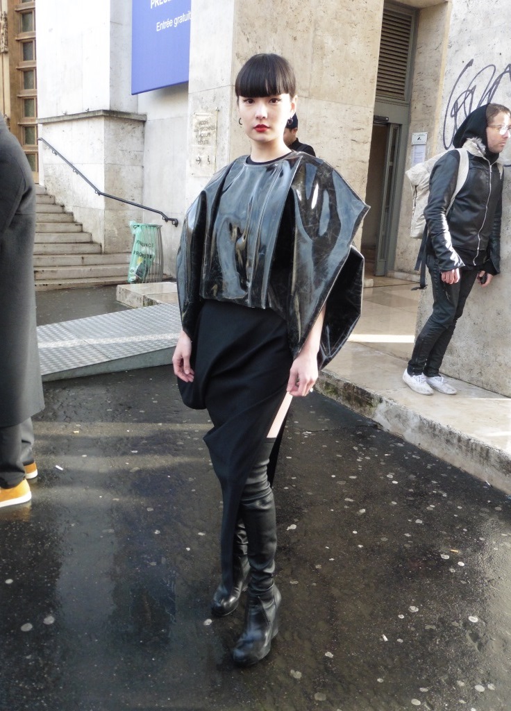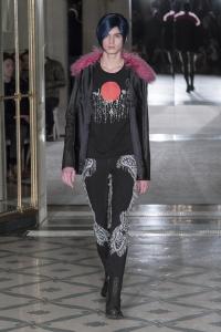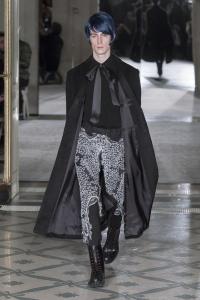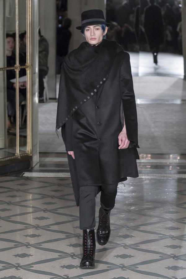 DEFILE RYNSHU A L’HOTEL MEURICE: Cette nouvelle collection est directement inspirée du chanteur japonais Tsuyoshi Nagabuchi avec lequel la marque a collaboré pour son clip « Black Train ». Le créateur Masatomo Yamashi exprime comme toujours son attachement aux traditions et à ses racines japonaises en inscrivant par exemple des extraits de poèmes (japonais) sur ses vêtements. Le noir dominant s’agrémente de touches bleu nuit, fuchsia, aubergine et lilas. A la recherche de nouvelles techniques pour sublimer les matières, le créateur propose une veste patchwork en taffetas noir coupé au laser. Ses silhouettes chic à l’élégance teintée d’esprit rock se déclinent en alpaga, cachemire, soie, viscose, baby-cachemire, qui s’associent harmonieusement au métal des paillettes. Les coupes sont soignées, les manteaux aux cols à capuche et les capes en alpaga sont particulièrement réussis. Les vestes, pantalons et souliers sont magnifiés par des fleurs cousues main et des motifs fauves, traduisant le souci du détail du créateur. Les perruques issues d’une collaboration avec la maison Aderans reflètent le style androgyne de cette superbe collection.
