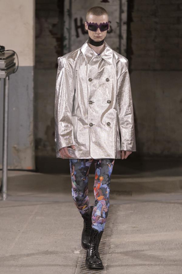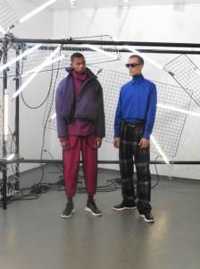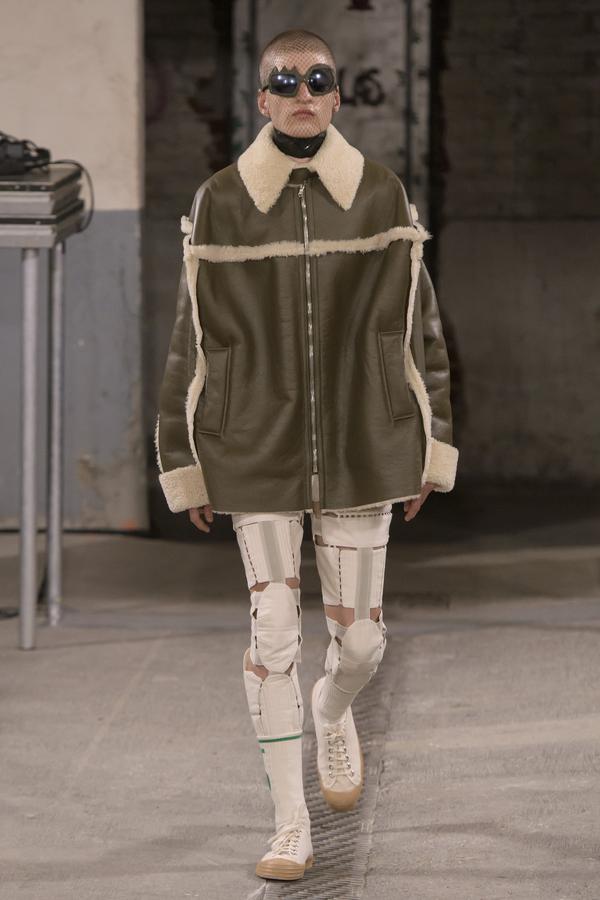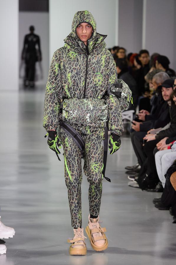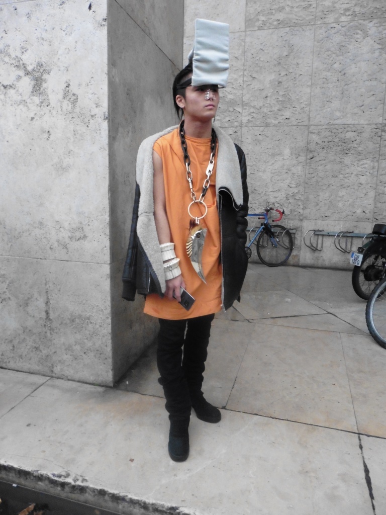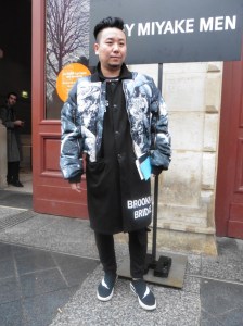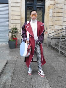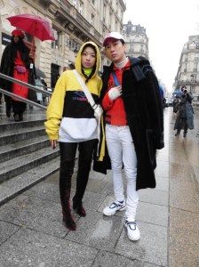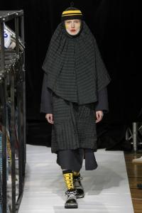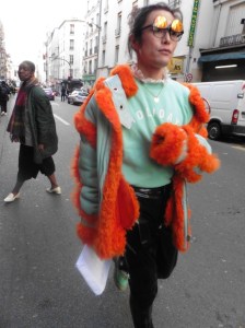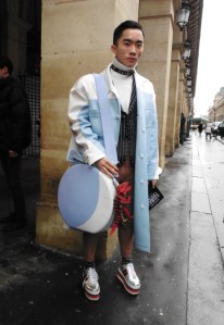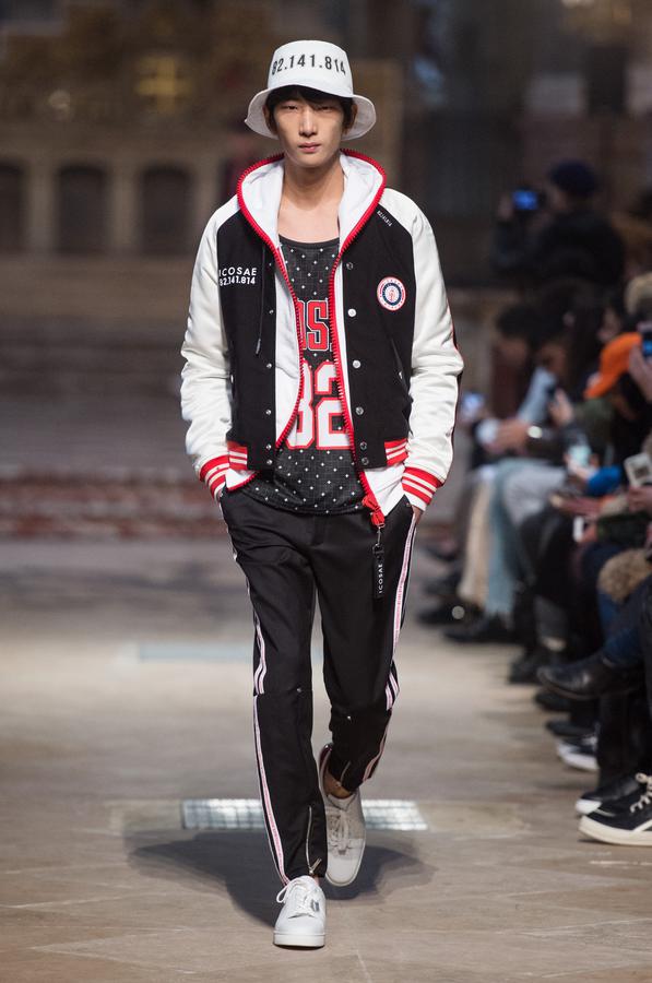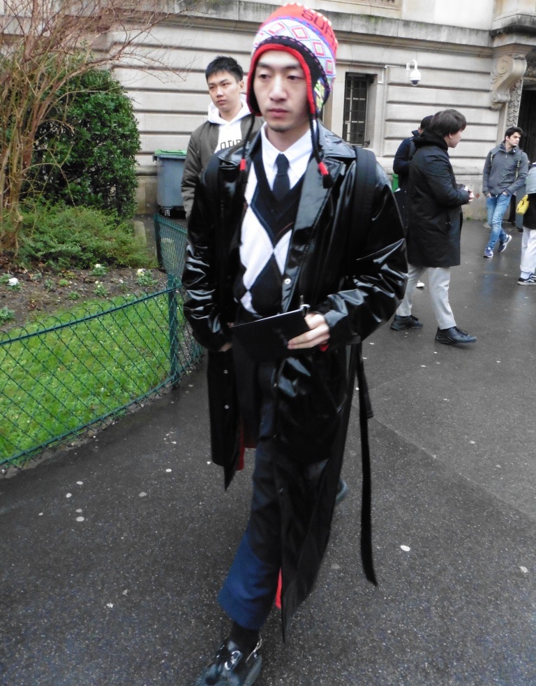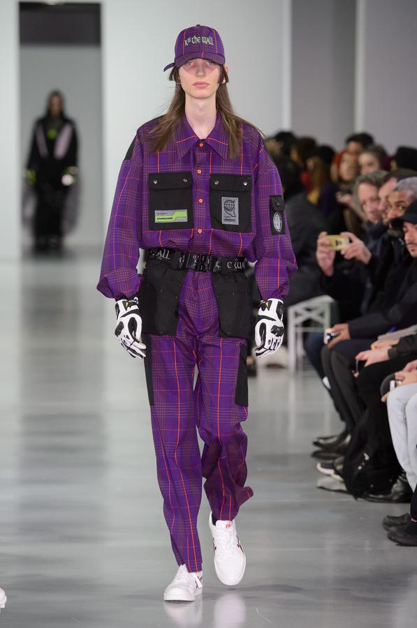 DEFILE SANKUANZ A LA GAITE LYRIQUE: Pour cette nouvelle collection intitulée « Kill The Wall », le créateur chinois Shangguan Zhe fait allusion à tous les combats personnels que nous avons à mener pour dépasser les obstacles physiques ou autres qui nous empêchent d’avancer. Cette lutte urbaine s’exprime dans un esprit sportswear à base de matières techniques résistantes et waterproof, panneaux réfléchissants, imprimés camouflage et autres arabesques fluo, des hoodies couverts de multiples poches, des pochettes de toutes formes suspendues à la taille. Ceci se décline sur des parkas, vestes à capuche, tenues de plongée et de moto, maillots de foot et autres leggings de running. Les dernières tenues semblent faites de tissus isolants et donnent aux mannequins des allures de survivants d’une catastrophe nucléaire. Le slogan du défilé et le nouveau logo de la marque apparaissent en gros sur certains vêtements et accessoires. Dans leur lutte pour leur survie les mannequins portent des baskets hautes sanglées dans des surchaussures à grosses semelles, accentuant l’esprit guerrier (ninja) de la collection. Un style tout à la fois militaire et underground!