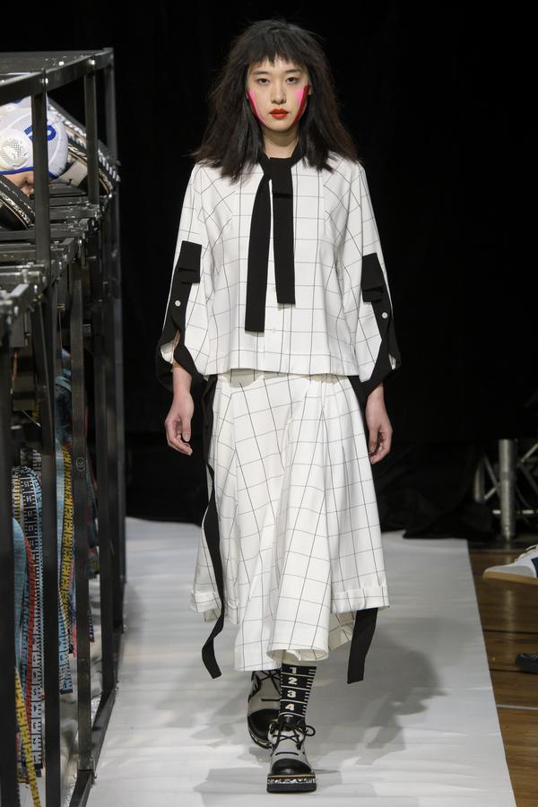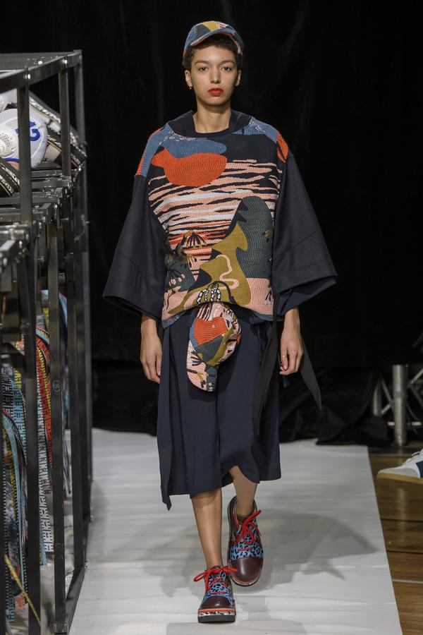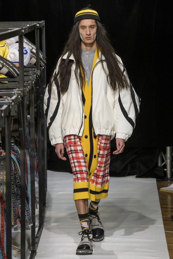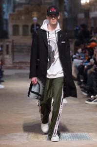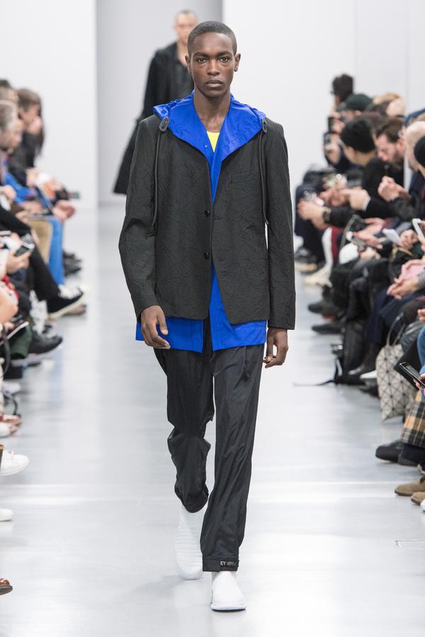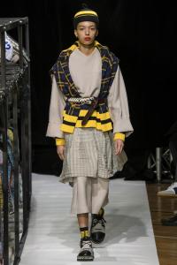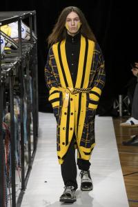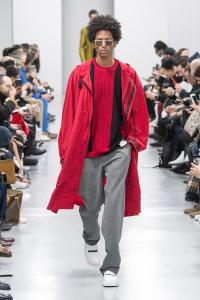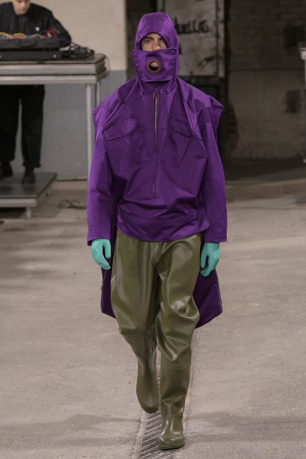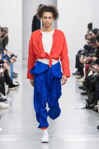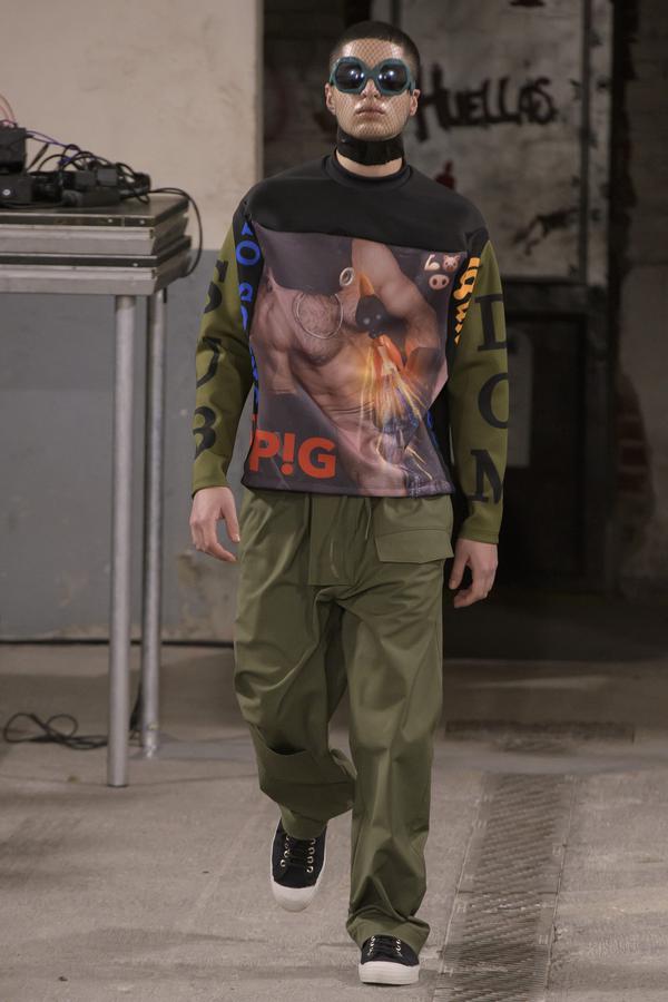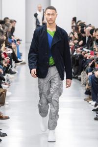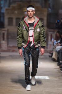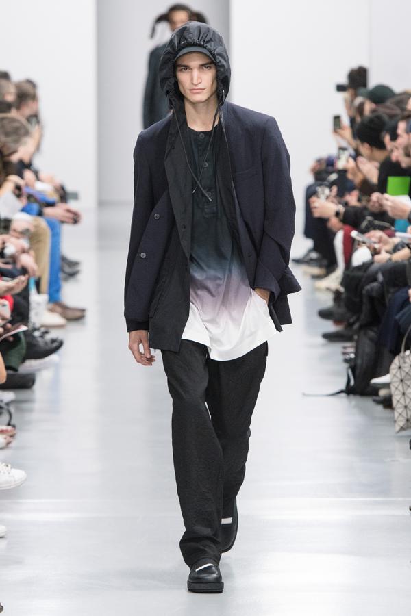 DEFILE SANKUANZ A LA GAITE LYRIQUE: Pour cette nouvelle collection intitulée « Kill The Wall », le créateur chinois Shangguan Zhe fait allusion à tous les combats personnels que nous avons à mener pour dépasser les obstacles physiques ou autres qui nous empêchent d’avancer. Cette lutte urbaine s’exprime dans un esprit sportswear à base de matières techniques résistantes et waterproof, panneaux réfléchissants, imprimés camouflage et autres arabesques fluo, des hoodies couverts de multiples poches, des pochettes de toutes formes suspendues à la taille. Ceci se décline sur des parkas, vestes à capuche, tenues de plongée et de moto, maillots de foot et autres leggings de running. Les dernières tenues semblent faites de tissus isolants et donnent aux mannequins des allures de survivants d’une catastrophe nucléaire. Le slogan du défilé et le nouveau logo de la marque apparaissent en gros sur certains vêtements et accessoires. Dans leur lutte pour leur survie les mannequins portent des baskets hautes sanglées dans des surchaussures à grosses semelles, accentuant l’esprit guerrier (ninja) de la collection. Un style tout à la fois militaire et underground!