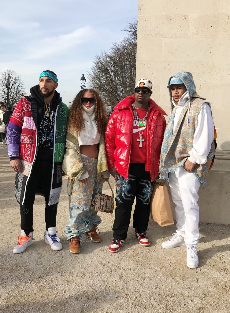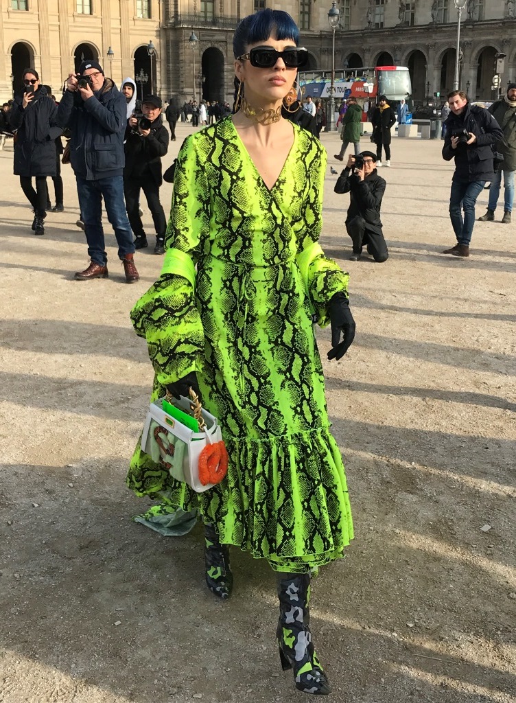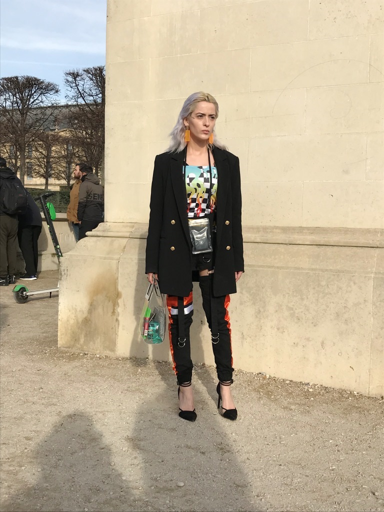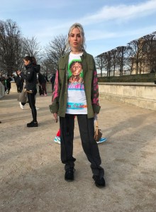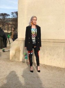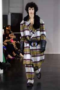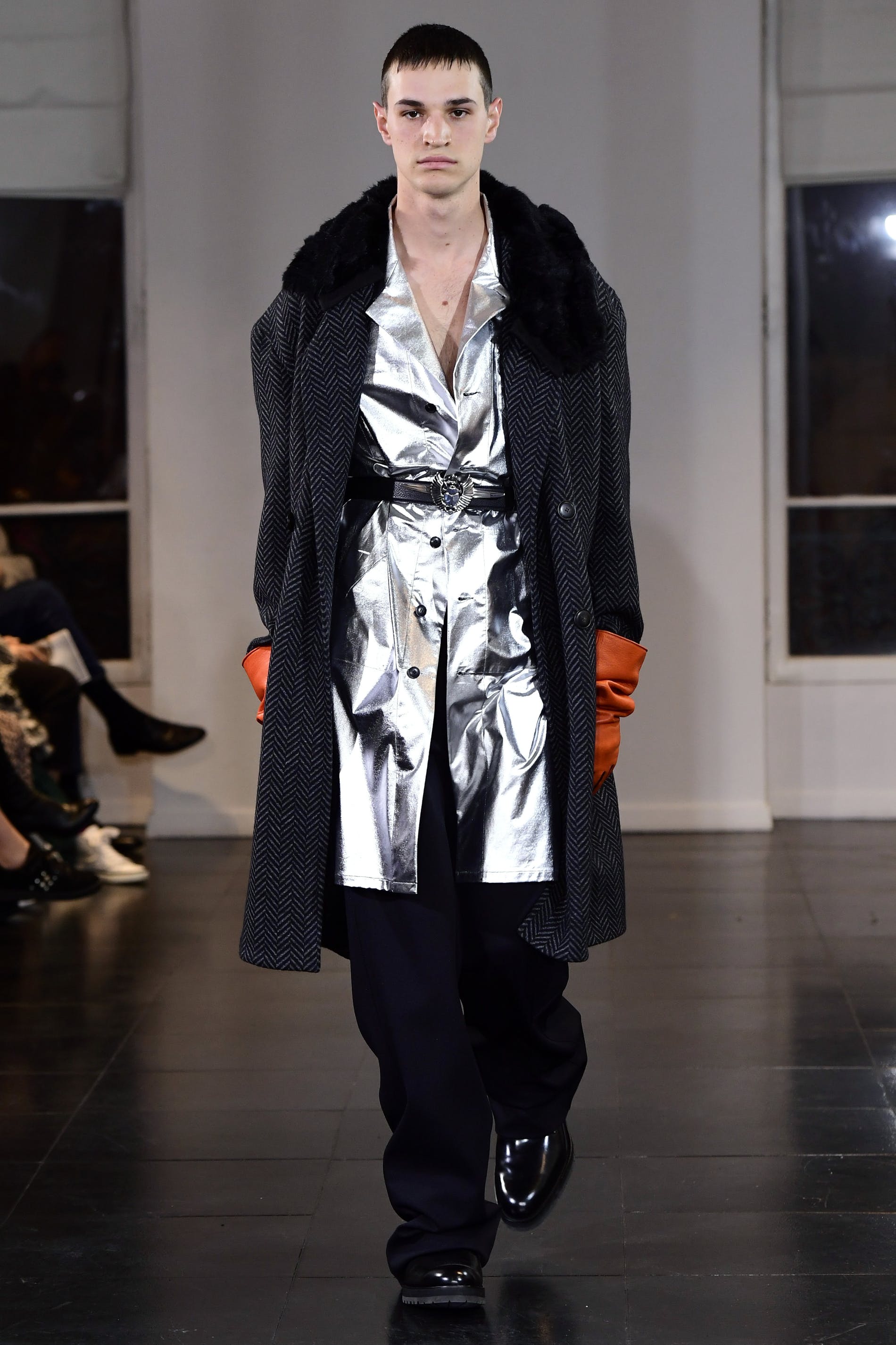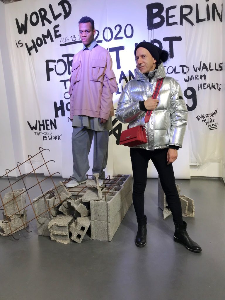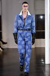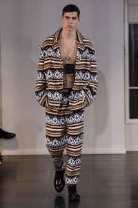 DEFILE LAZOSCHMIDL DANS LE GARAGE DE L’INSTITUT MARANGONI: Premier défilé à Paris pour cette jeune marque fondée en 2014 par le duo suédois-allemand et couple à la ville Josef Lazo et Andreas Schmidl, qui défile habituellement à Stockholm où elle est basée. Avec cette collection intitulée « Planet Sex » nous avons pu découvrir son univers sexy, érotique et assez subversif, avec ces garçons éphèbes à la corpulence musclée en tenues scintillantes, en body-maillot de bain rétro, zébré et asymétrique à une bretelle, en slip léopard et tricot rose décoré d’un phallus ailé, en caleçons-combinaisons moulants en lurex enfilés sur des tricots brillants. Des pantalons en cuir vert, moutarde ou rose bonbon sont associés à des tops épaule nue au bord volanté coupés dans des matières brillantes, ou un haut en mousseline de soie fine avec son noeud lavallière. D’autres pantalons à effet zébré sont portés avec des tricots résille blancs. Des ensembles chemises-pantalons jouent sur la transparence. La collection montre que délicatesse peut rimer avec gros zizis! Les créateurs s’adressent assurément aux nouvelles générations aux mentalités plus ouvertes. Bravo pour cette imagination débridée et cette audace, et vive la libération des zizis!