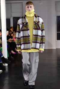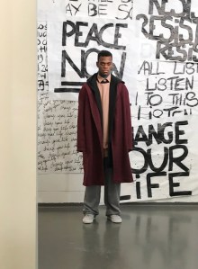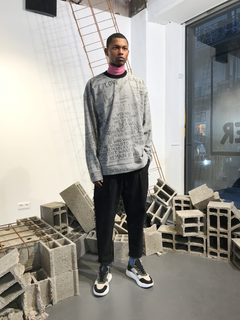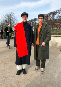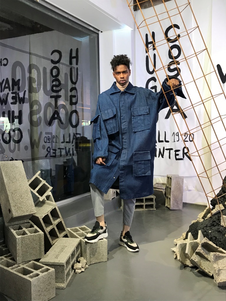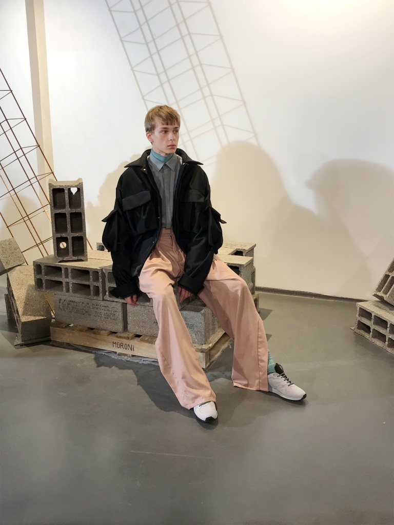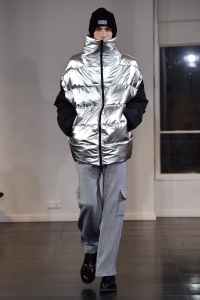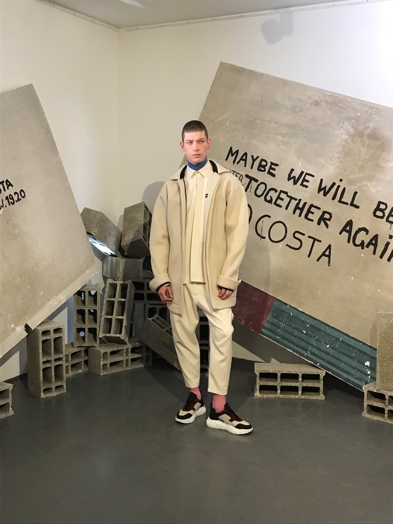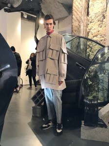PRESENTATION/DEFILE « SYSTEM » AU PALAIS DE TOKYO (YOYO-CLUB): Première présentation à Paris également pour cette marque coréenne encore peu connue en dehors de l’Asie, créée en 1990 pour des collections de prêt-à-porter féminin et qui s’est lancée dans l’homme en 2008. Appartenant à un conglomérat coréen de grande envergure qui lui permet de disposer de moyens importants, comme un studio collectif de près de 80 designers pour les lignes homme et femme, elle propose un style urbain chic très actuel, aux coupes et finitions soignées, portant une grande attention aux matières et à la fabrication réalisée en Corée. Pour un fort impact visuel, les mannequins hommes et femmes déambulent autour et à l’intérieur d’un vrai ring tout blanc, illuminé au centre d’une salle sombre. Le maître mot de cette collection est la dualité. La collection joue ainsi abondamment avec les superpositions et mélanges de matières. Les pièces classiques d’une garde-robe, vestes, manteaux, pantalons, mailles, sont revisitées en combinant habilement denim, soie et cuir dans des silhouettes amples et fluides, dans une palette de couleurs où dominent le noir, le marron et le beige. Une certaine sophistication se dégage de l’ensemble.
