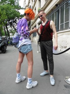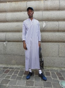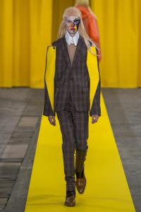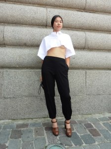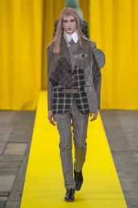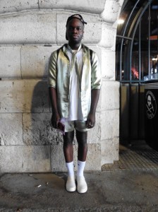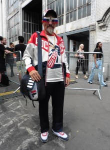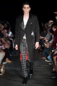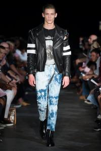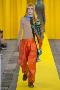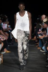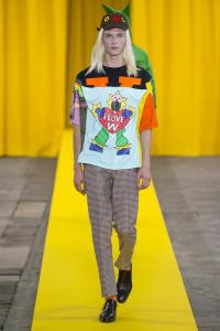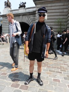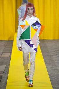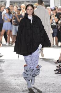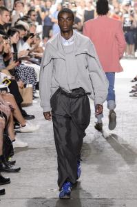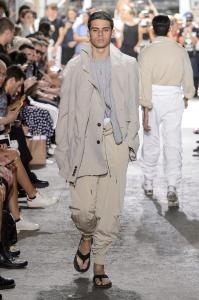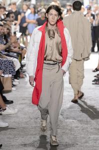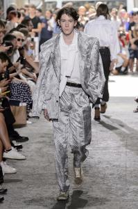 DEFILE SANKUANZ A L’ENSCI: Pour cette nouvelle collection le designer chinois Shangguan Zhe a trouvé son inspiration dans l’univers créatif de l’artiste américain Cy Twombly. Les allusions aux différentes facettes de l’oeuvre de celui-ci sont multiples et se traduisent dans un style urbain, arty, oversize qui se décline en pantalons, vestes (parfois attachées à la ceinture), chemises, sweat-shirts aux coloris divers, couleurs vives et pastels reflétant son inspiration méditerranéenne. Le lin brut des costumes est une allusion à la toile vierge du peintre, dans certains cas recouvert d’une peinture blanche évoquant la matière mate des sculptures. Les costumes tailleurs, coupés dans un style italien, sont une référence à la vie de l’artiste à Rome et sont revêtus d’imprimés graffitis rappelant son oeuvre. Des références à d’anciennes expositions sont inscrites sur des chemises à plastron et des pantalons. Certains mannequins portent de grands cabas et sacs à dos surdimensionnés qui se déplient comme des trousses de peintre. Une synthèse très séduisante entre streetwear et art qui nous propulse avec une belle énergie dans la modernité.
