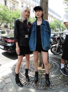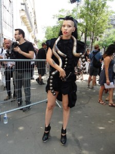DEFILE RYNSHU SUR LA TERRASSE DE L’HOTEL MEURICE: Pour cette saison le créateur japonais Masatamo Yamashi qui a pour habitude de chercher son inspiration dans la contemplation du modernisme japonais y ajoute une touche de romantisme. Cette collection androgyne se décline ainsi en pantalons en tissu de kimonos traditionnels vintage, en manches de chemises qui deviennent romantiques grâce à une technique de drapé en volume, en un mélange savant d’imprimés floraux et graphiques, en broderies aux motifs de phoenix ornant vestes, blousons, manteaux, pantalons et chemises, en messages japonais brodés en violet sur des écussons noirs et blancs, en kanjis (caractères utilisés dans l’écriture du japonais) exprimant la volonté de réalisation des souhaits ou de succès dans les affaires. Pour ce qui est des matières: cotonnade faite main avec une technique de « collage », noire et blanche, soie aérienne et transparente imprimée de motifs pastels ou de dessins inkjet de fleurs colorées, association d’organdi noir ultra-fin et d’un lamé chatoyant. Les silhouettes sont finalisées avec des chapeaux et foulards qui invitent à une rêverie toute romantique.