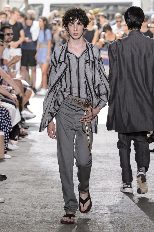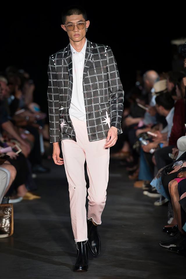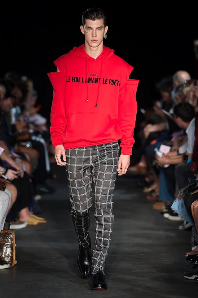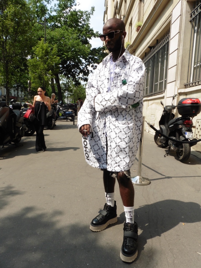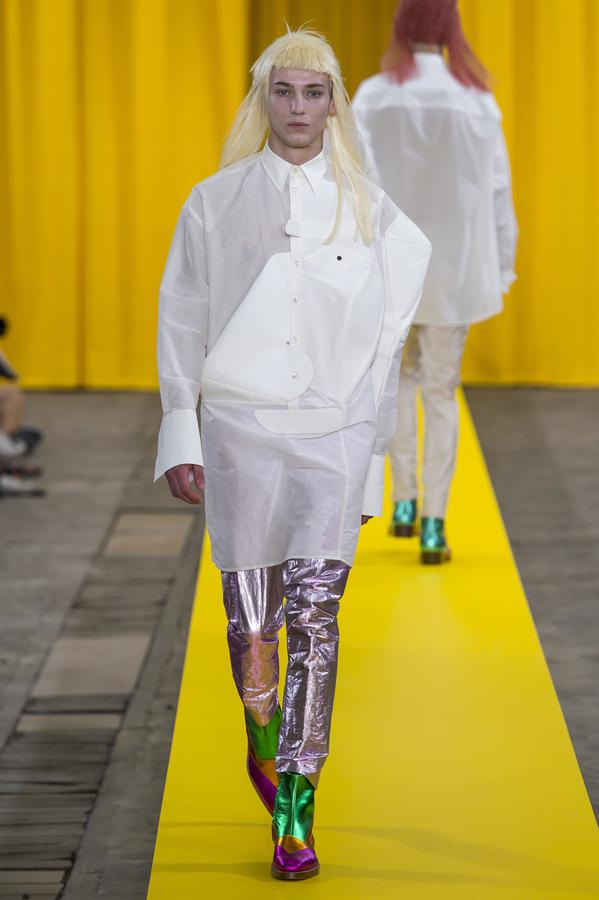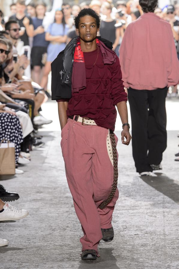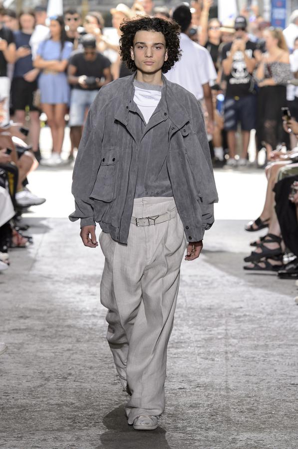 DEFILE SANKUANZ A L’ENSCI: Pour cette nouvelle collection le designer chinois Shangguan Zhe a trouvé son inspiration dans l’univers créatif de l’artiste américain Cy Twombly. Les allusions aux différentes facettes de l’oeuvre de celui-ci sont multiples et se traduisent dans un style urbain, arty, oversize qui se décline en pantalons, vestes (parfois attachées à la ceinture), chemises, sweat-shirts aux coloris divers, couleurs vives et pastels reflétant son inspiration méditerranéenne. Le lin brut des costumes est une allusion à la toile vierge du peintre, dans certains cas recouvert d’une peinture blanche évoquant la matière mate des sculptures. Les costumes tailleurs, coupés dans un style italien, sont une référence à la vie de l’artiste à Rome et sont revêtus d’imprimés graffitis rappelant son oeuvre. Des références à d’anciennes expositions sont inscrites sur des chemises à plastron et des pantalons. Certains mannequins portent de grands cabas et sacs à dos surdimensionnés qui se déplient comme des trousses de peintre. Une synthèse très séduisante entre streetwear et art qui nous propulse avec une belle énergie dans la modernité.