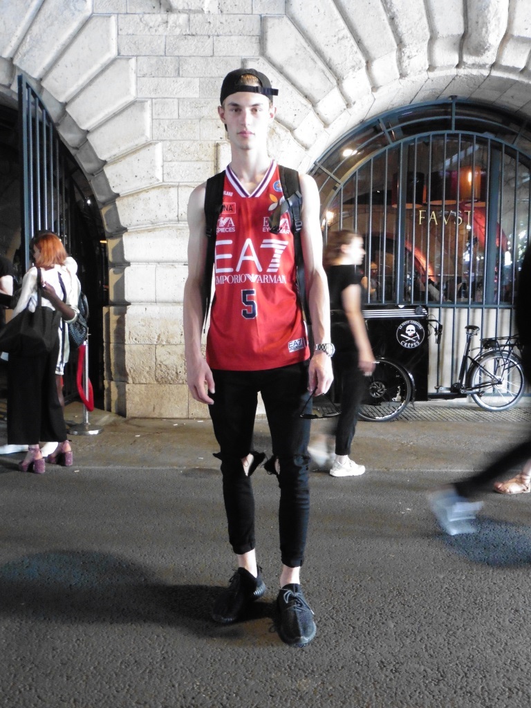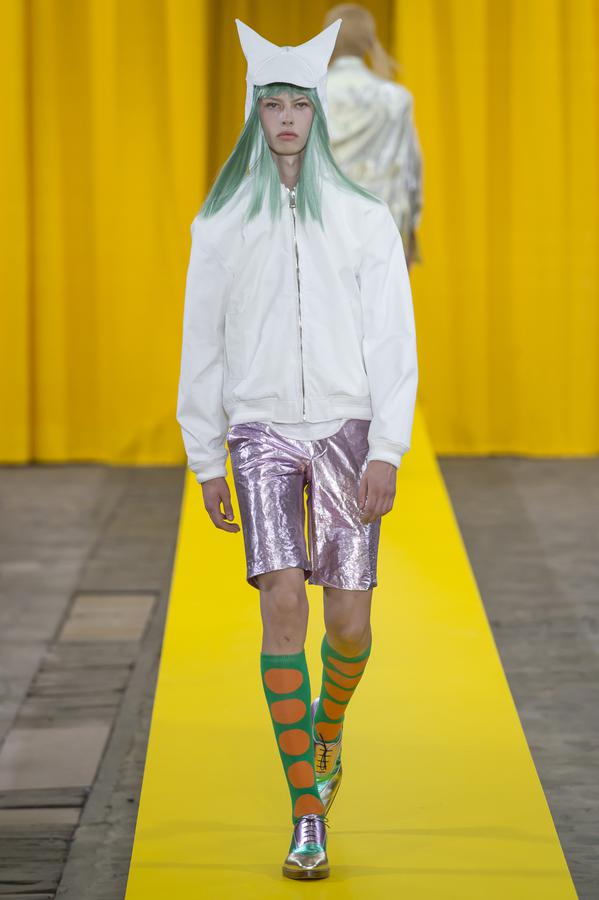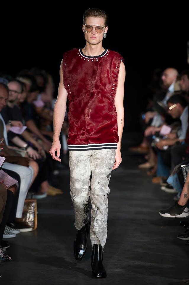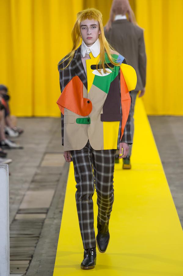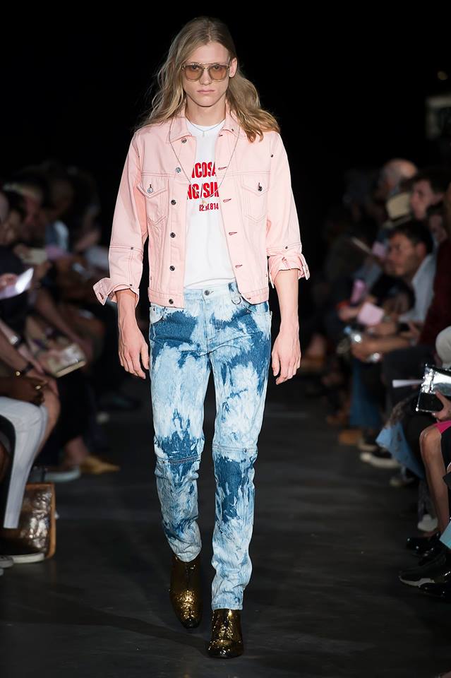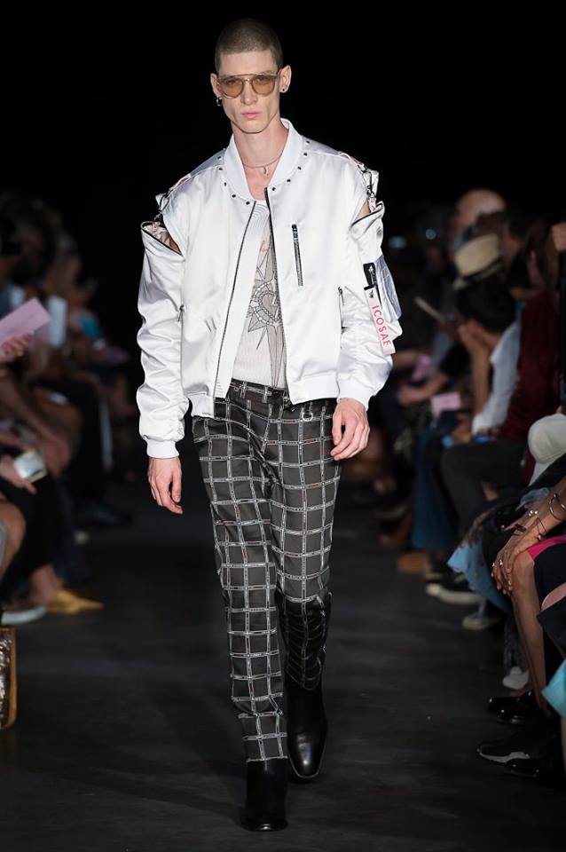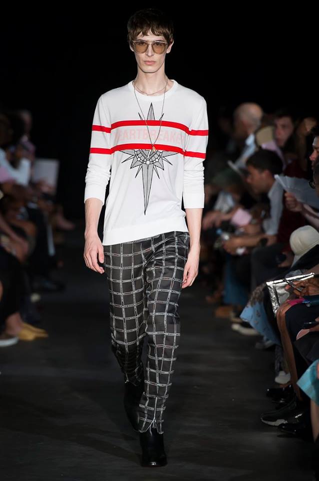 DEFILE SANKUANZ A L’ENSCI: Pour cette nouvelle collection le designer chinois Shangguan Zhe a trouvé son inspiration dans l’univers créatif de l’artiste américain Cy Twombly. Les allusions aux différentes facettes de l’oeuvre de celui-ci sont multiples et se traduisent dans un style urbain, arty, oversize qui se décline en pantalons, vestes (parfois attachées à la ceinture), chemises, sweat-shirts aux coloris divers, couleurs vives et pastels reflétant son inspiration méditerranéenne. Le lin brut des costumes est une allusion à la toile vierge du peintre, dans certains cas recouvert d’une peinture blanche évoquant la matière mate des sculptures. Les costumes tailleurs, coupés dans un style italien, sont une référence à la vie de l’artiste à Rome et sont revêtus d’imprimés graffitis rappelant son oeuvre. Des références à d’anciennes expositions sont inscrites sur des chemises à plastron et des pantalons. Certains mannequins portent de grands cabas et sacs à dos surdimensionnés qui se déplient comme des trousses de peintre. Une synthèse très séduisante entre streetwear et art qui nous propulse avec une belle énergie dans la modernité.