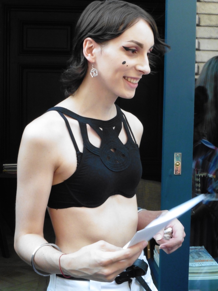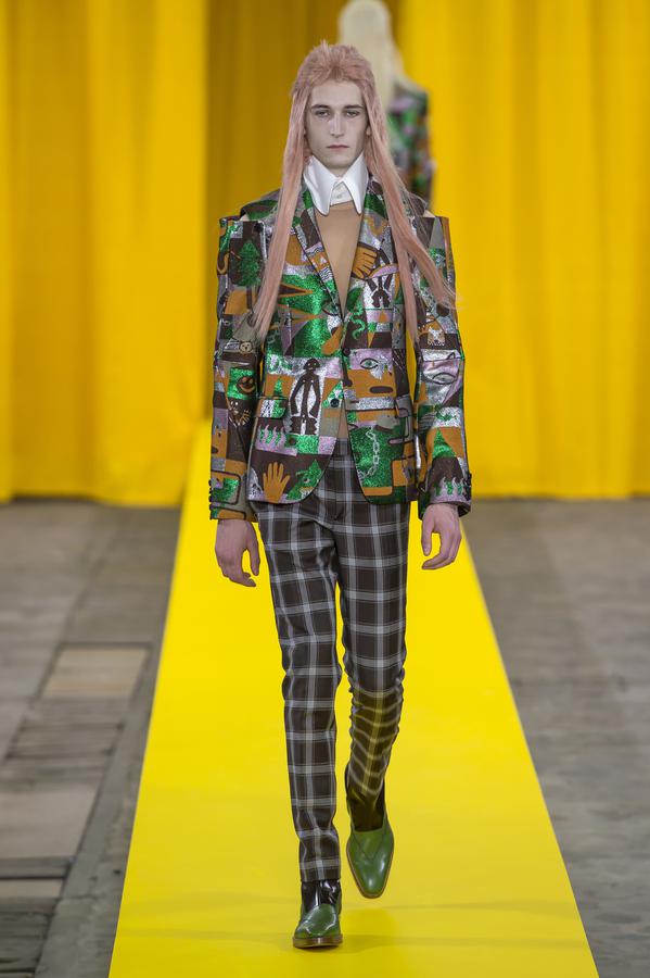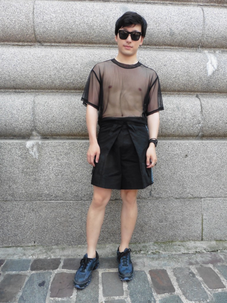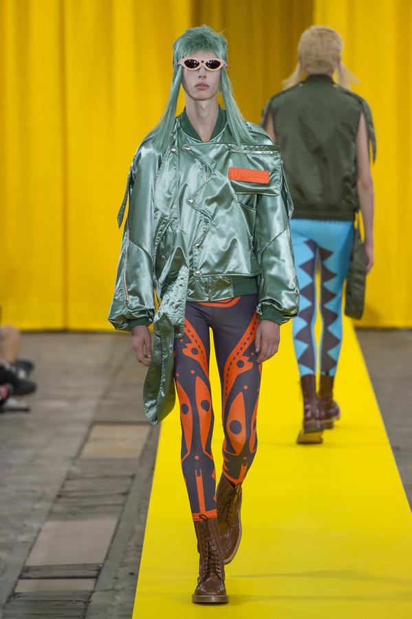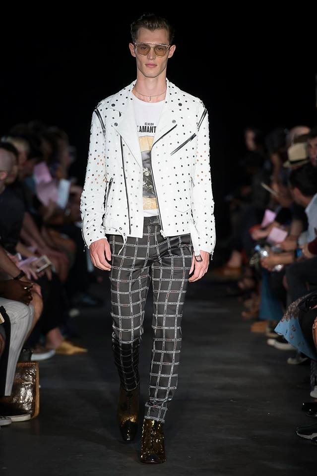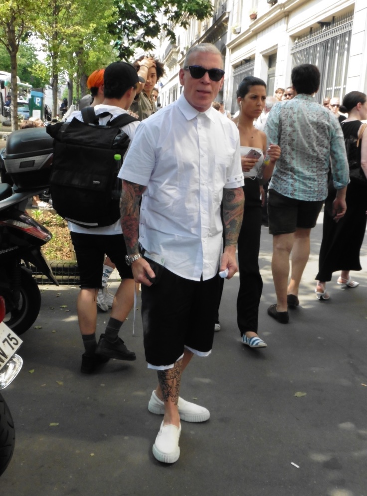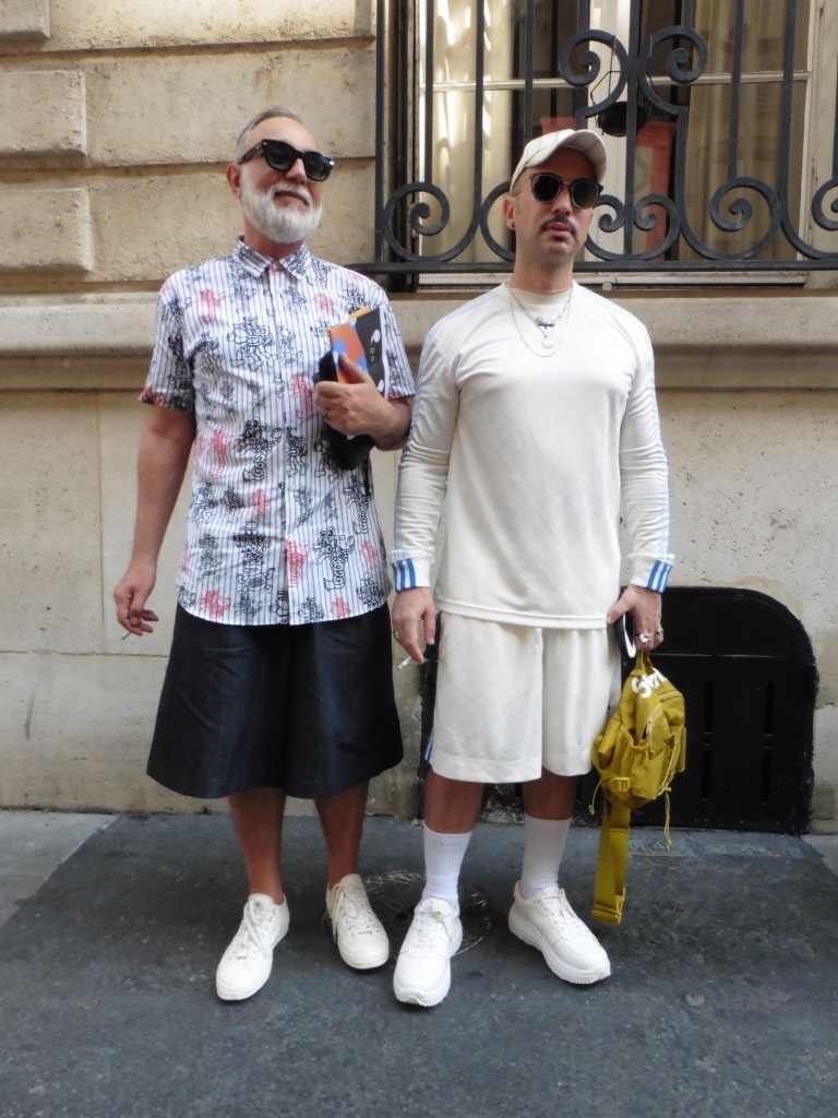DEFILE SANKUANZ A L’ENSCI: Pour cette nouvelle collection le designer chinois Shangguan Zhe a trouvé son inspiration dans l’univers créatif de l’artiste américain Cy Twombly. Les allusions aux différentes facettes de l’oeuvre de celui-ci sont multiples et se traduisent dans un style urbain, arty, oversize qui se décline en pantalons, vestes (parfois attachées à la ceinture), chemises, sweat-shirts aux coloris divers, couleurs vives et pastels reflétant son inspiration méditerranéenne. Le lin brut des costumes est une allusion à la toile vierge du peintre, dans certains cas recouvert d’une peinture blanche évoquant la matière mate des sculptures. Les costumes tailleurs, coupés dans un style italien, sont une référence à la vie de l’artiste à Rome et sont revêtus d’imprimés graffitis rappelant son oeuvre. Des références à d’anciennes expositions sont inscrites sur des chemises à plastron et des pantalons. Certains mannequins portent de grands cabas et sacs à dos surdimensionnés qui se déplient comme des trousses de peintre. Une synthèse très séduisante entre streetwear et art qui nous propulse avec une belle énergie dans la modernité.